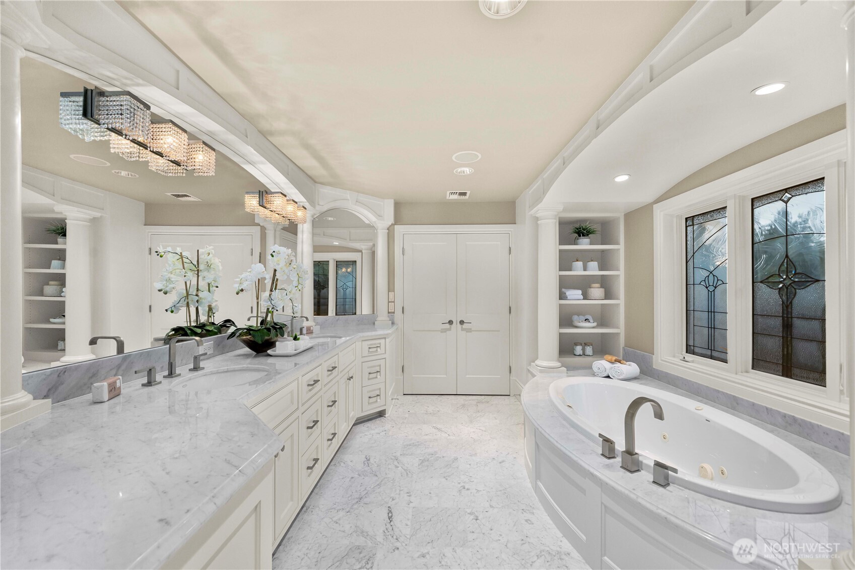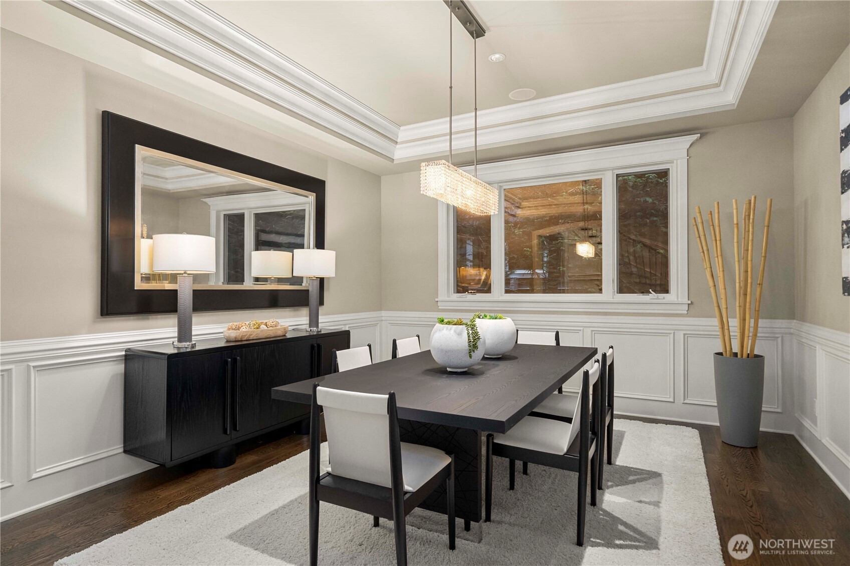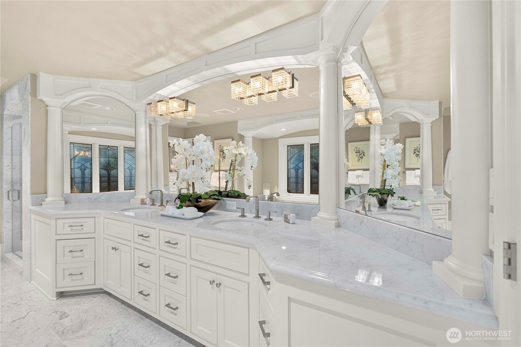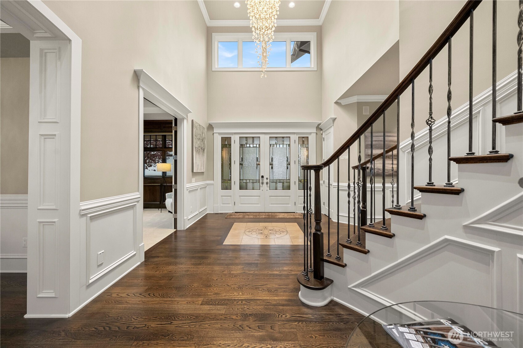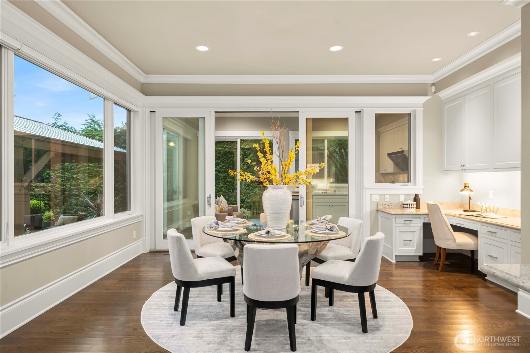 Perfectly positioned just moments from Downtown Bellevue, this exceptional Adam Leland custom estate offers a rare blend of privacy, scale, flat, beautifully landscaped lot. A grand, light-filled foyer creates an unforgettable first impression, featuring soaring ceilings, a sweeping curved staircase, exquisite millwork, & rich hardwood floors that set the tone for timeless elegance. The home opens to a breathtaking two-story great room, where a dramatic wall of floor-to-ceiling windows floods the space with natural light & frames serene garden views. A statement fireplace with custom built-ins anchors the room, while the open-concept design seamlessly connects living, dining, kitchen & kitchenette spaces-ideal for both everyday living & entertaining. The chef’s kitchen is appointed with Sub-Zero appliances, dual ovens, Miele dishwashers, & an expansive island, complemented by custom cabinetry & refined finishes. A sunlit dining area opens effortlessly to the outdoor covered cabana, creating a seamless indoor-outdoor lifestyle. A wood-paneled office & versatile media/flex spaces provide functionality for modern living. Upstairs, the Luxe primary 5-piece suite with fireplace capturing sweeping city views, accompanied by 3 well-appointed guest suites, custom closets, & light-filled spaces throughout. Complete with a 3-car garage with EV charging, top-rated Bellevue schools, minutes to world-class shopping, dining, & parks, a rare opportunity to own refined Bellevue luxury.