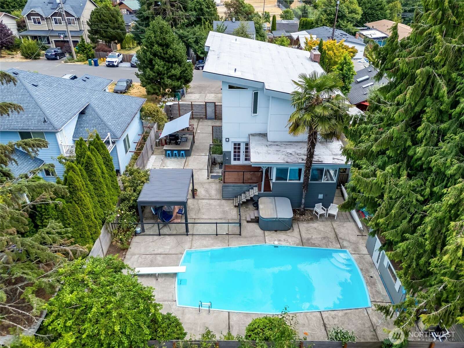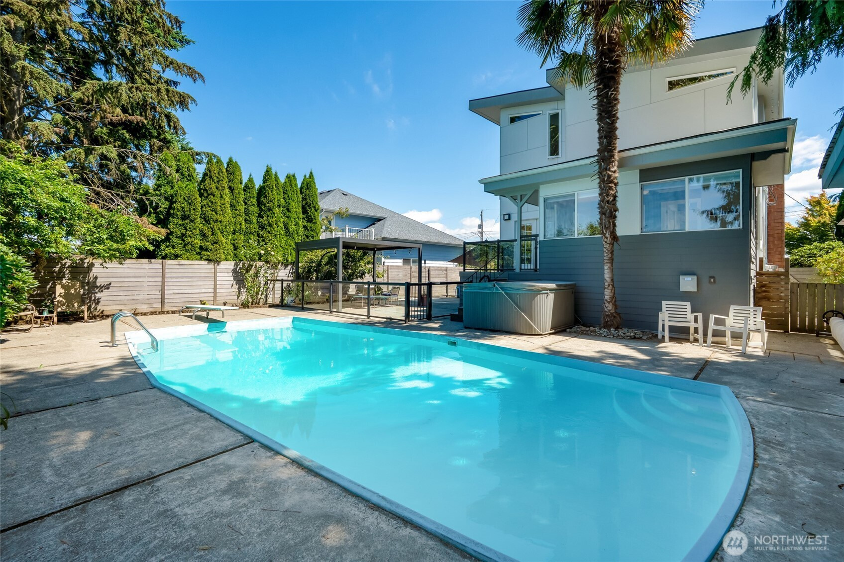 This extraordinary property offers the ultimate blend of luxury, style & multigenerational living. Every detail was crafted w/ elegance & function - from the Thermador range to the custom, world-renowned John Boos countertop. Host unforgettable gatherings in the heated saltwater pool, hot tub, or under the charming gazebo. The newly constructed top floor hosts 3 bdrms plus a showstopping primary suite.The spa-inspired bath has radiant heated floors & separate soaking room, while the private deck offers views of Mt Rainier—perfect for morning coffee or to wind-down. Enjoy the fully remodeled separate apartment on the lower level w/ inside or outside entrances, full kitchen, living & dining area. Perfect for home or potential rental income.
