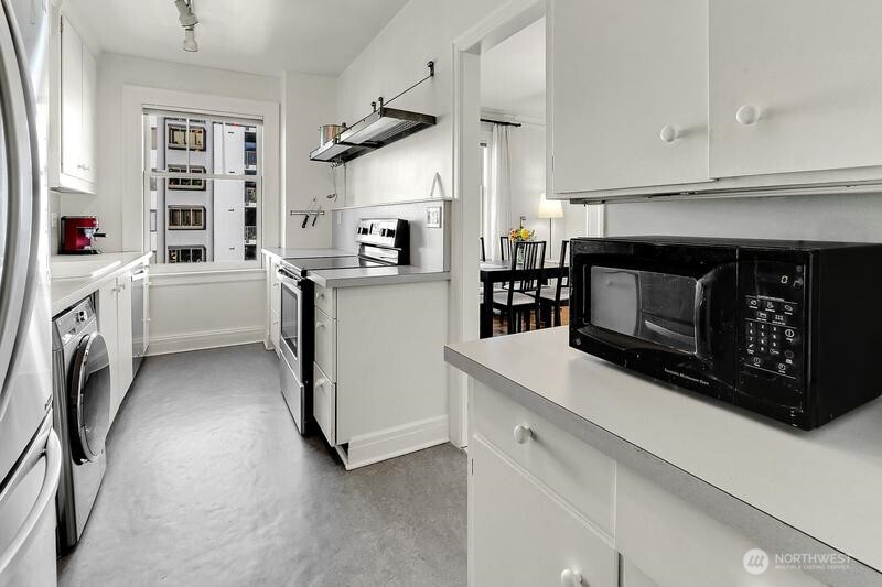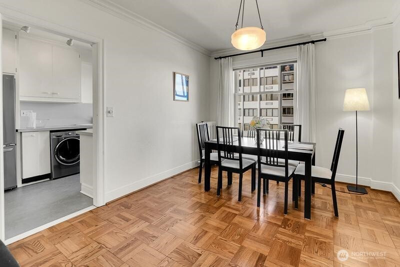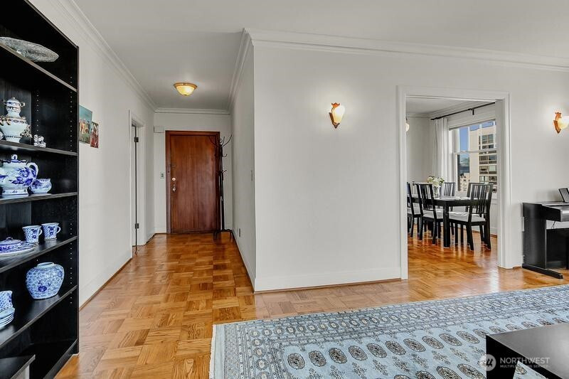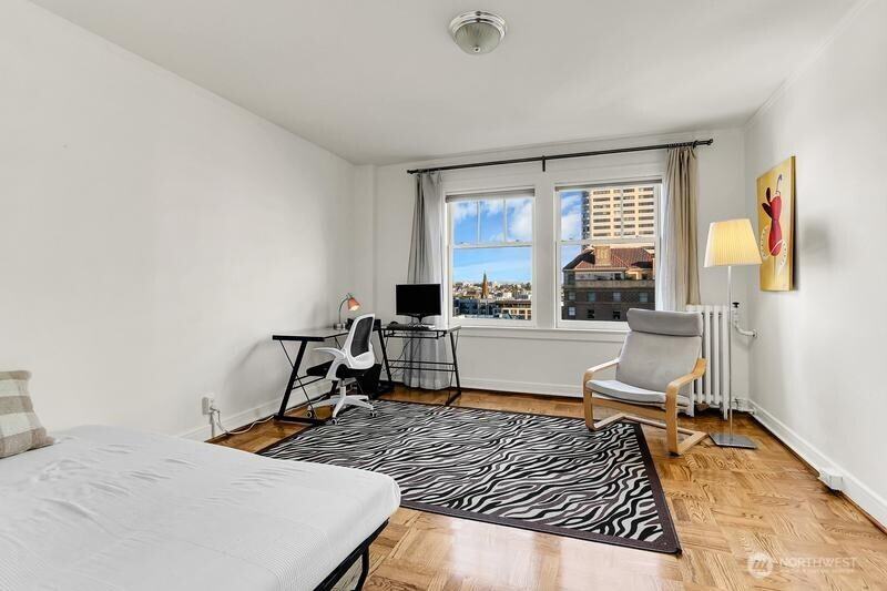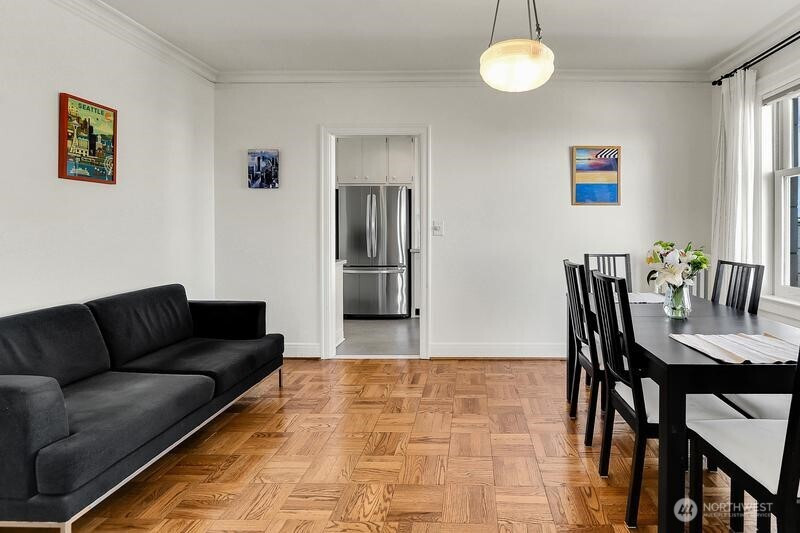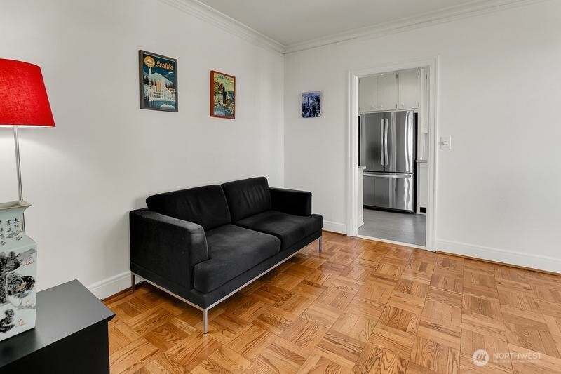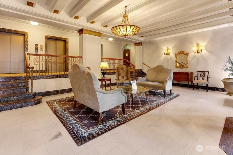 The Gainsborough is one of First Hill's premier steel and concrete high-rise buildings, filled with historic charm and glamour. Spacious living and dining room, tall ceilings, original hardwood floors, crown molding and new double pane windows. A northeast-corner unit, it takes full advantage of the city and Lake Union views. The kitchen has great natural light and new stainless-steel appliances. The 2 bedrooms are tucked away for the main living area, along with the fully renovated bath. The community rooftop terrace garden is a great space to relax and take in the city views. Garage parking + storage. Just a couple blocks to Capitol Hill's popular Pike/Pine neighborhood: shops, restaurants, bars, coffee shops and groceries. An easy walk to transit ride to downtown and South Lake Union. A convenient commute to SeaTac and the Eastside.