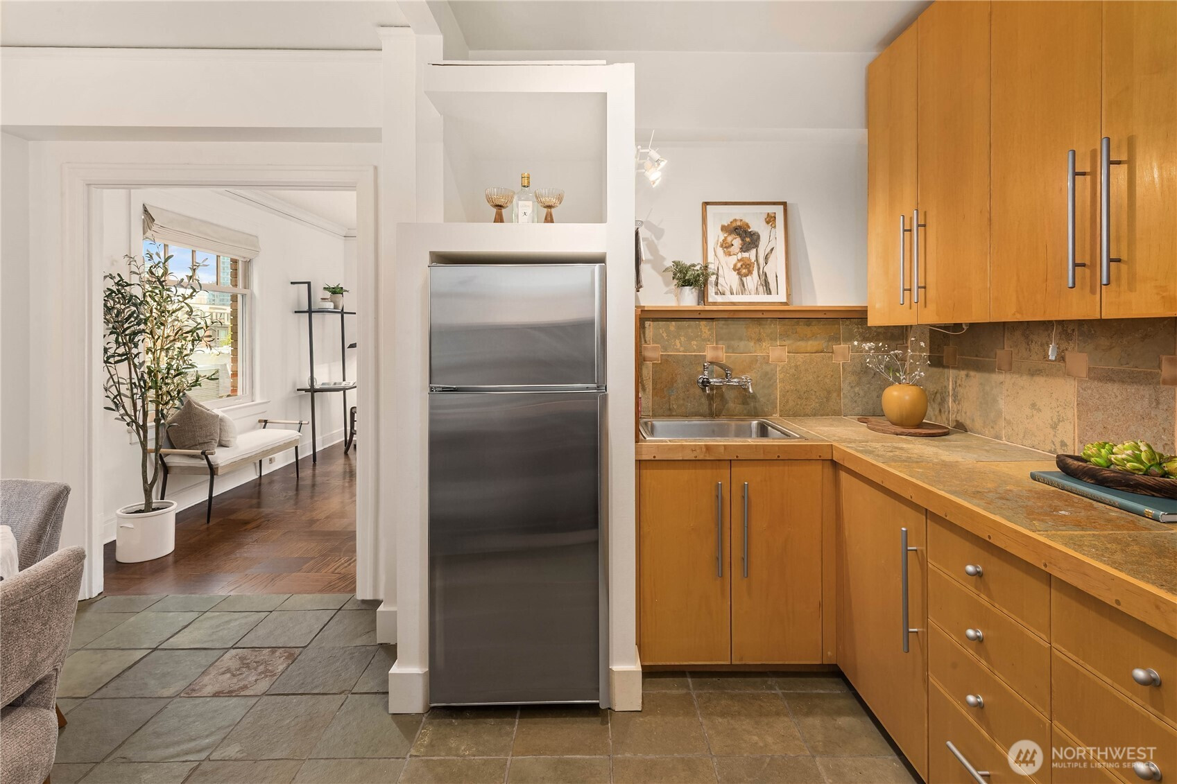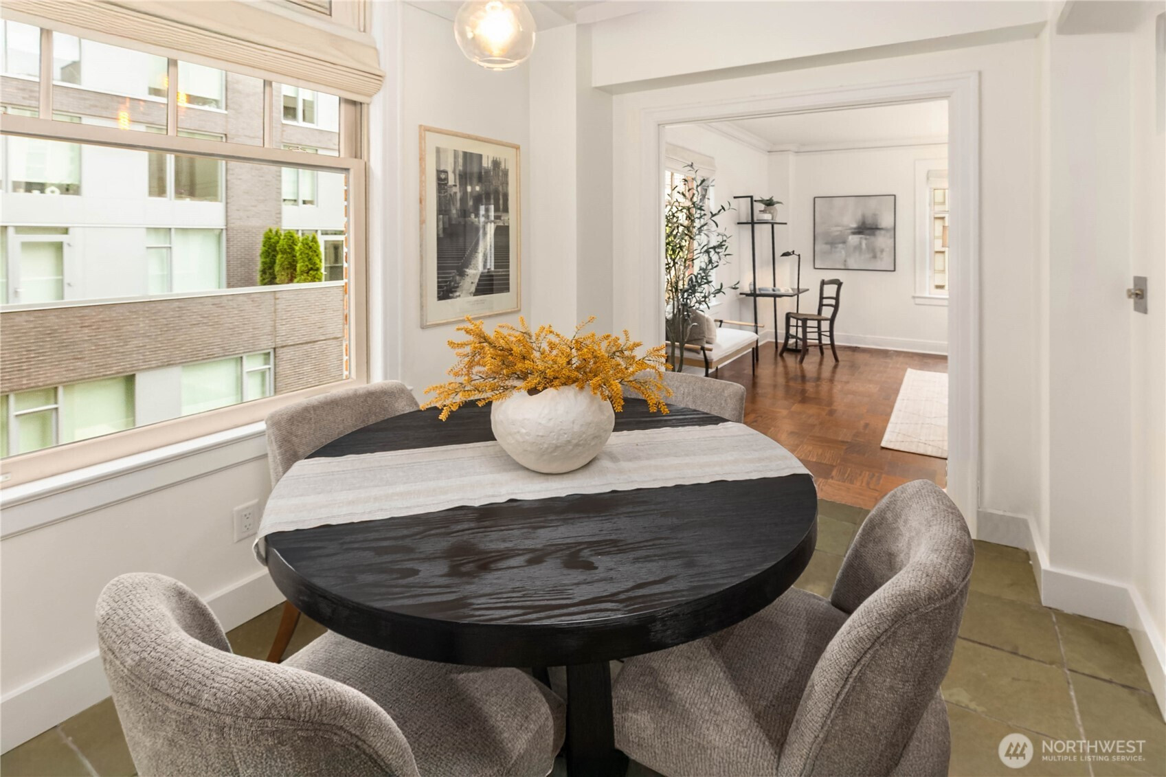 Step into timeless sophistication at The Gainsborough, an iconic residence where historic charm meets refined modern living. Rich in heritage with distinctive Art Deco character, this treasured landmark offers an elevated city lifestyle framed by elegance and authenticity. Bathed in natural light, this southwest-facing corner home showcases captivating city views, while the rooftop garden and patio unveil sweeping vistas of the city skyline, water views, and surrounding mountains. Inside, classic details blend seamlessly with thoughtful updates, including hardwood parquet floors, an updated kitchen and a formal dining room designed for memorable entertaining. Two generously sized bedrooms offer versatility for guests, a home office, or both, perfectly suited for today’s lifestyle. Everyday comforts are elevated with in-unit washer/dryer hookup in a separate storage room, secure garage parking, a dedicated mail room, and a stunning, impeccably maintained lobby that makes a lasting first impression. Constructed of solid concrete and steel, The Gainsborough exudes an old Hollywood ambiance while benefiting from significant modern upgrades, including a new roof, updated plumbing, and renovated elevators. The secure, elegant entry and well-managed building ensure both peace of mind and enduring value. Ideally located with a Walk Score of 98 and Transit Score of 99, you are just moments from premier dining, theaters, nightlife, and the best of vibrant city living.
