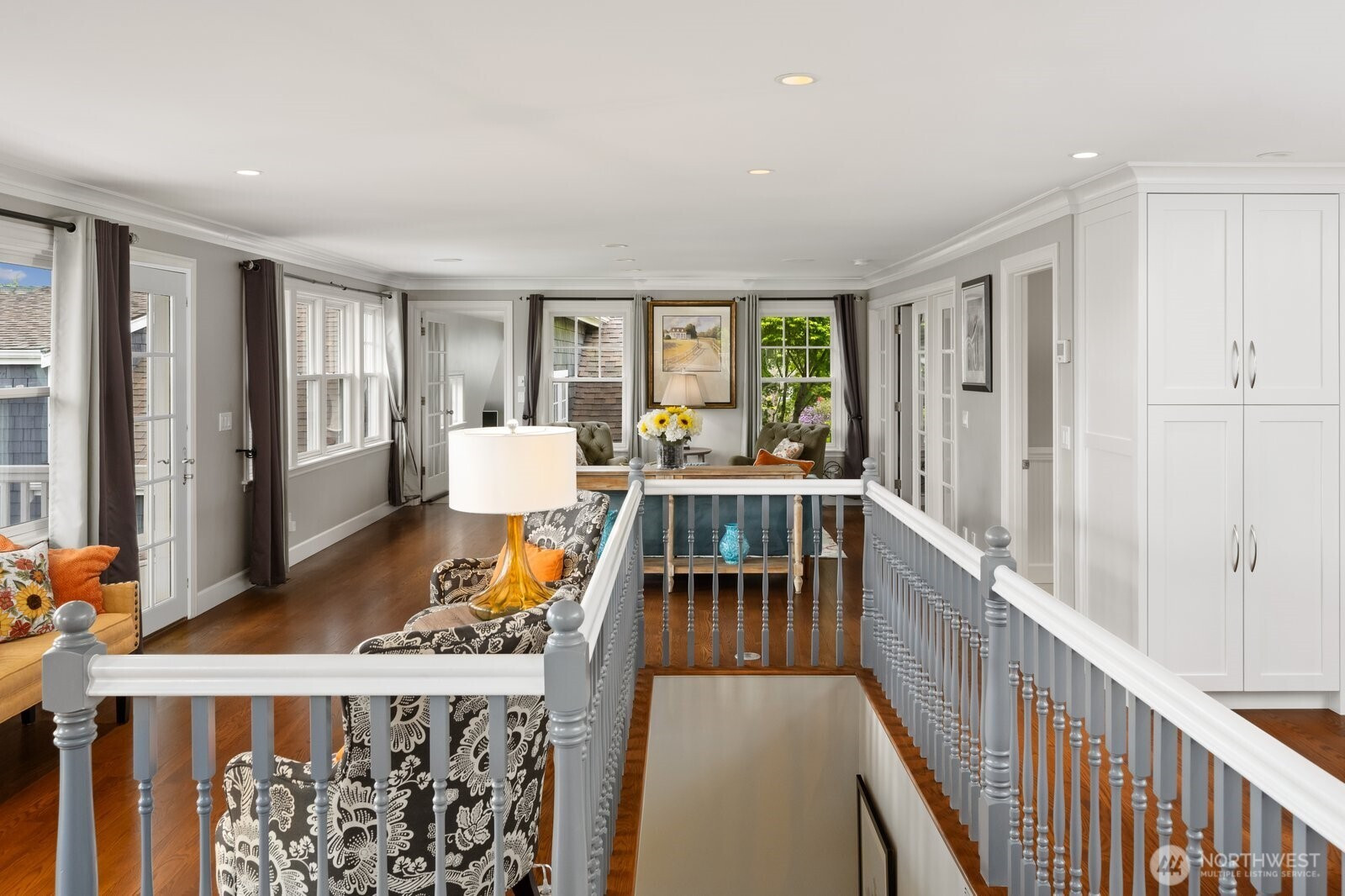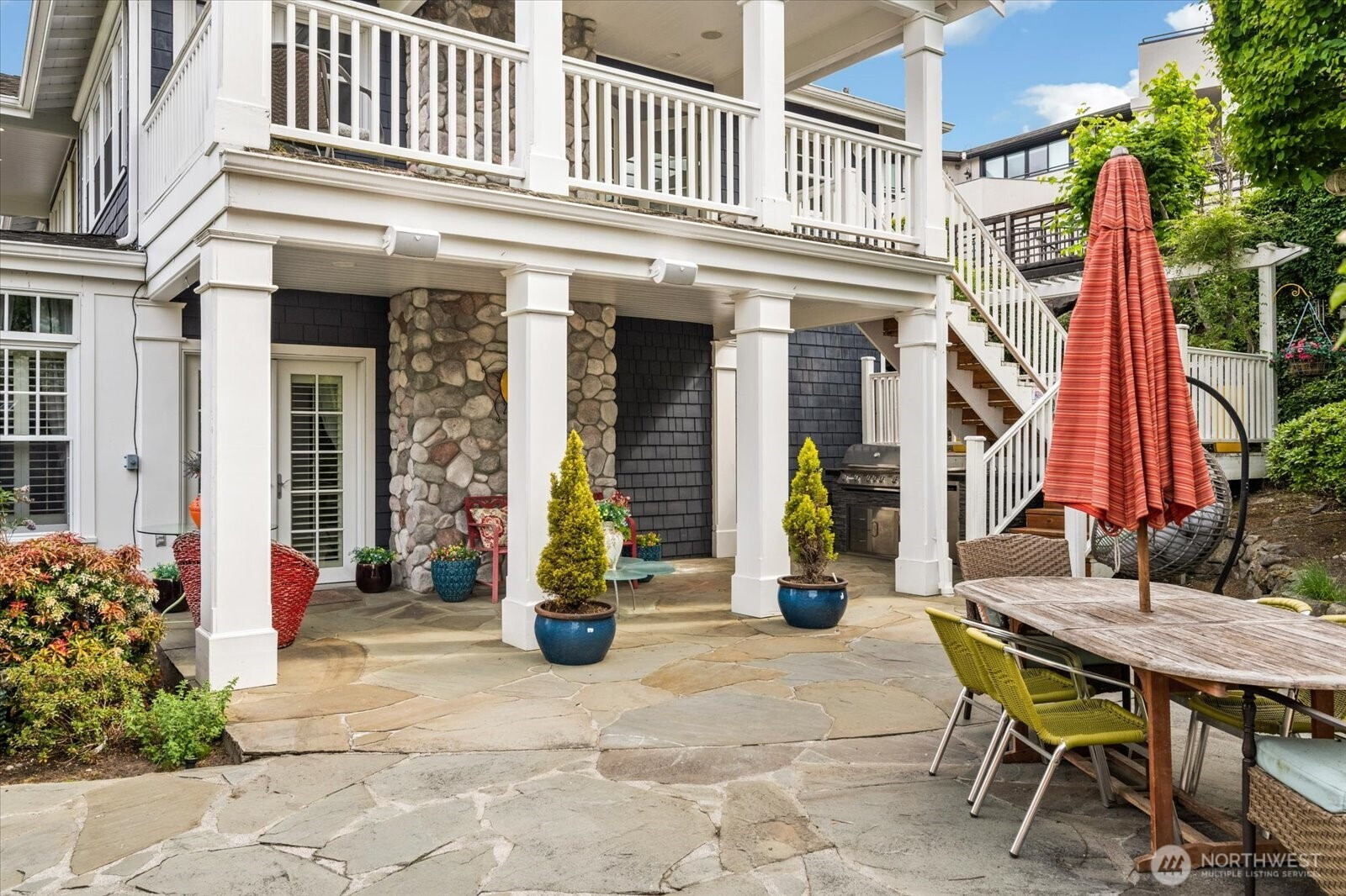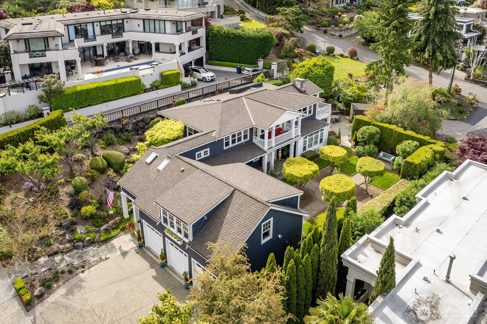 Welcome to the heart of Kirkland’s coveted Houghton neighborhood, just one block from . This 4,000+ square foot residence blends timeless craftsmanship with thoughtfully refreshed spaces, offering the perfect canvas for coastal living.A reverse floor plan maximizes natural light and captures peek-a-boo lake views, while the main-floor primary suite provides a private retreat complete with a fireplace and direct access to manicured grounds. The fully remodeled 2026 primary bath showcases luxurious Sahara Carrara honed marble tile floors and walls, a walk-in shower with dual heads, Bellmont cabinetry, undermount sinks, a floating soaking tub, and a gracious walk-in closet. Designed for both everyday living and entertaining, the chef’s kitchen features Pental quartz countertops, premium Fisher & Paykel appliances, a beverage station, expansive prep areas, and a massive island. A classic, colorful elevated dining niche opens seamlessly to the great room and formal dining spaces, creating a warm and inviting flow. Multiple decks extend the living areas outdoors, perfect for enjoying the Pacific Northwest lifestyle. An ADU above the three-car garage adds unmatched versatility—ideal for guests, multi-generational living, or a private office. Experience refined comfort, flexible living, and an unbeatable Houghton location.
