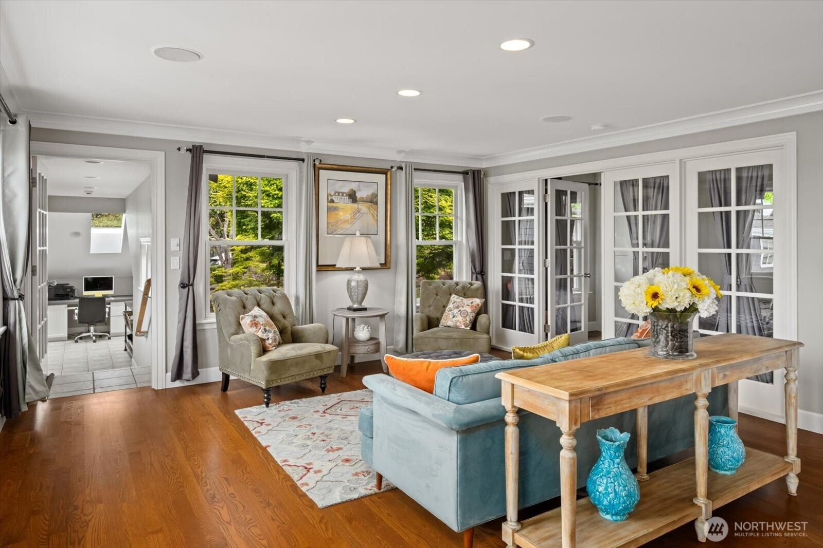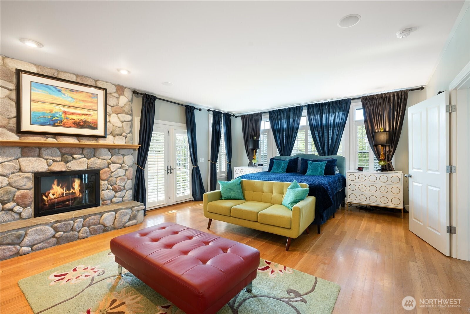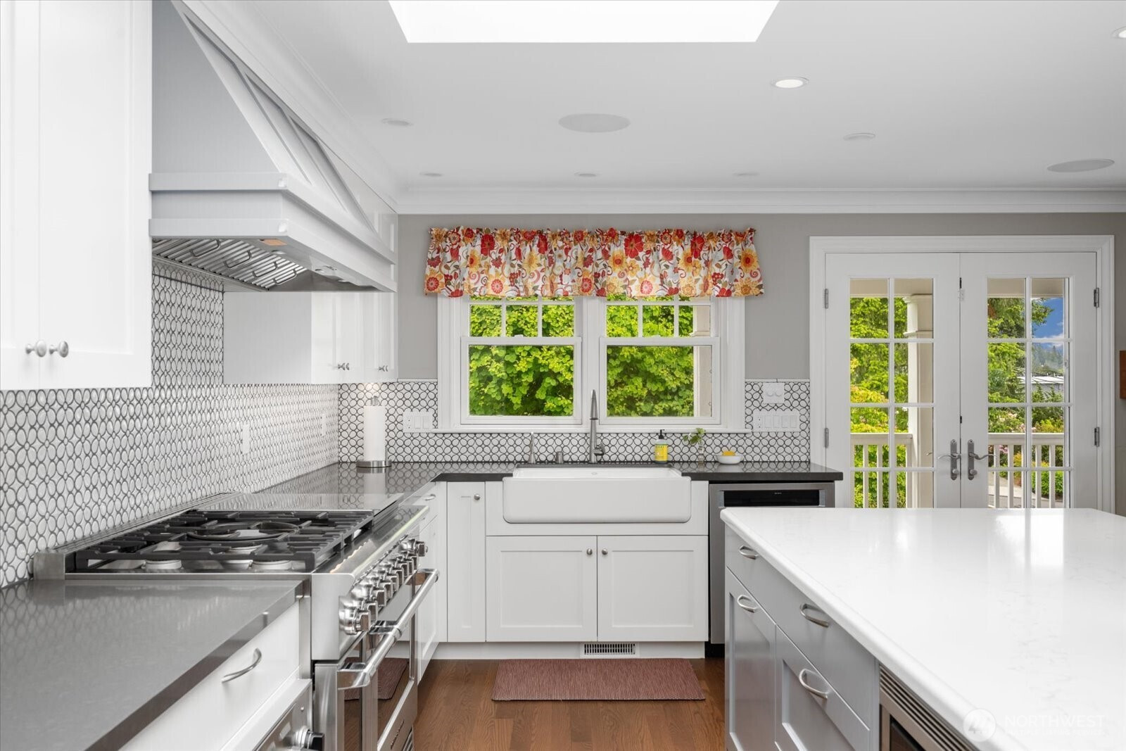 Welcome to the heart of Kirkland’s coveted Houghton neighborhood, just one block from . This 4,000+ square foot residence blends timeless craftsmanship with thoughtfully refreshed spaces, offering the perfect canvas for coastal living.A reverse floor plan maximizes natural light and captures peek-a-boo lake views, while the main-floor primary suite provides a private retreat complete with a fireplace and direct access to manicured grounds. The fully remodeled 2026 primary bath showcases luxurious Sahara Carrara honed marble tile floors and walls, a walk-in shower with dual heads, Bellmont cabinetry, undermount sinks, a floating soaking tub, and a gracious walk-in closet. Designed for both everyday living and entertaining, the chef’s kitchen features Pental quartz countertops, premium Fisher & Paykel appliances, a beverage station, expansive prep areas, and a massive island. A classic, colorful elevated dining niche opens seamlessly to the great room and formal dining spaces, creating a warm and inviting flow. Multiple decks extend the living areas outdoors, perfect for enjoying the Pacific Northwest lifestyle. An ADU above the three-car garage adds unmatched versatility—ideal for guests, multi-generational living, or a private office. Experience refined comfort, flexible living, and an unbeatable Houghton location.