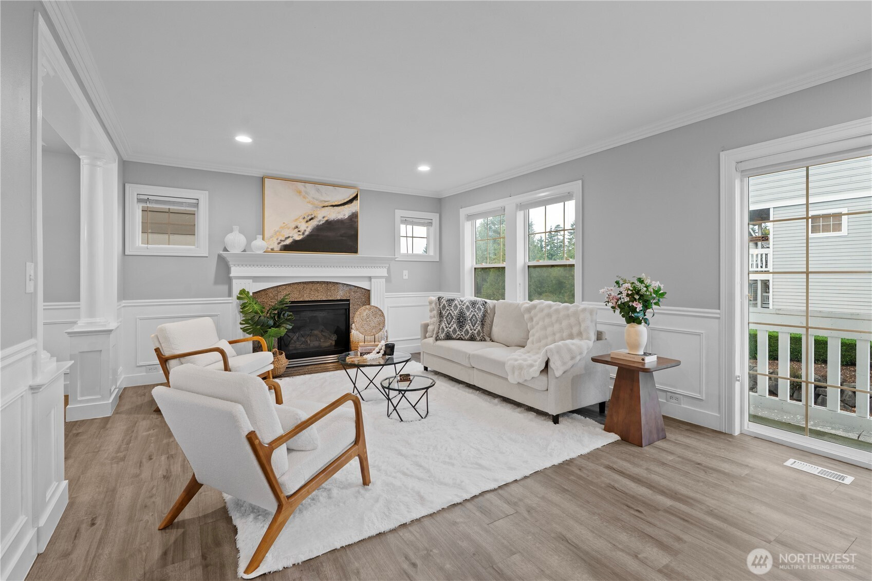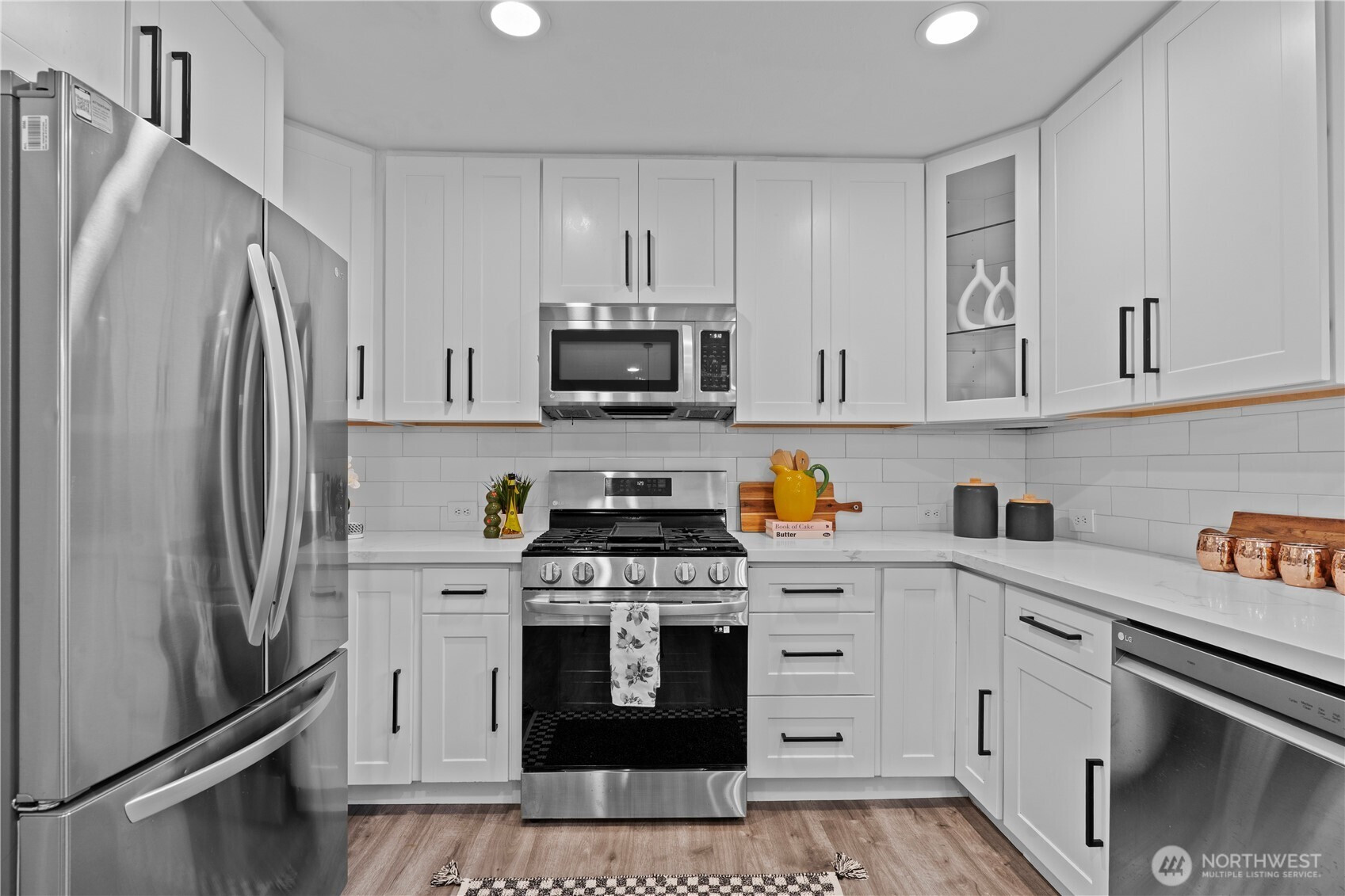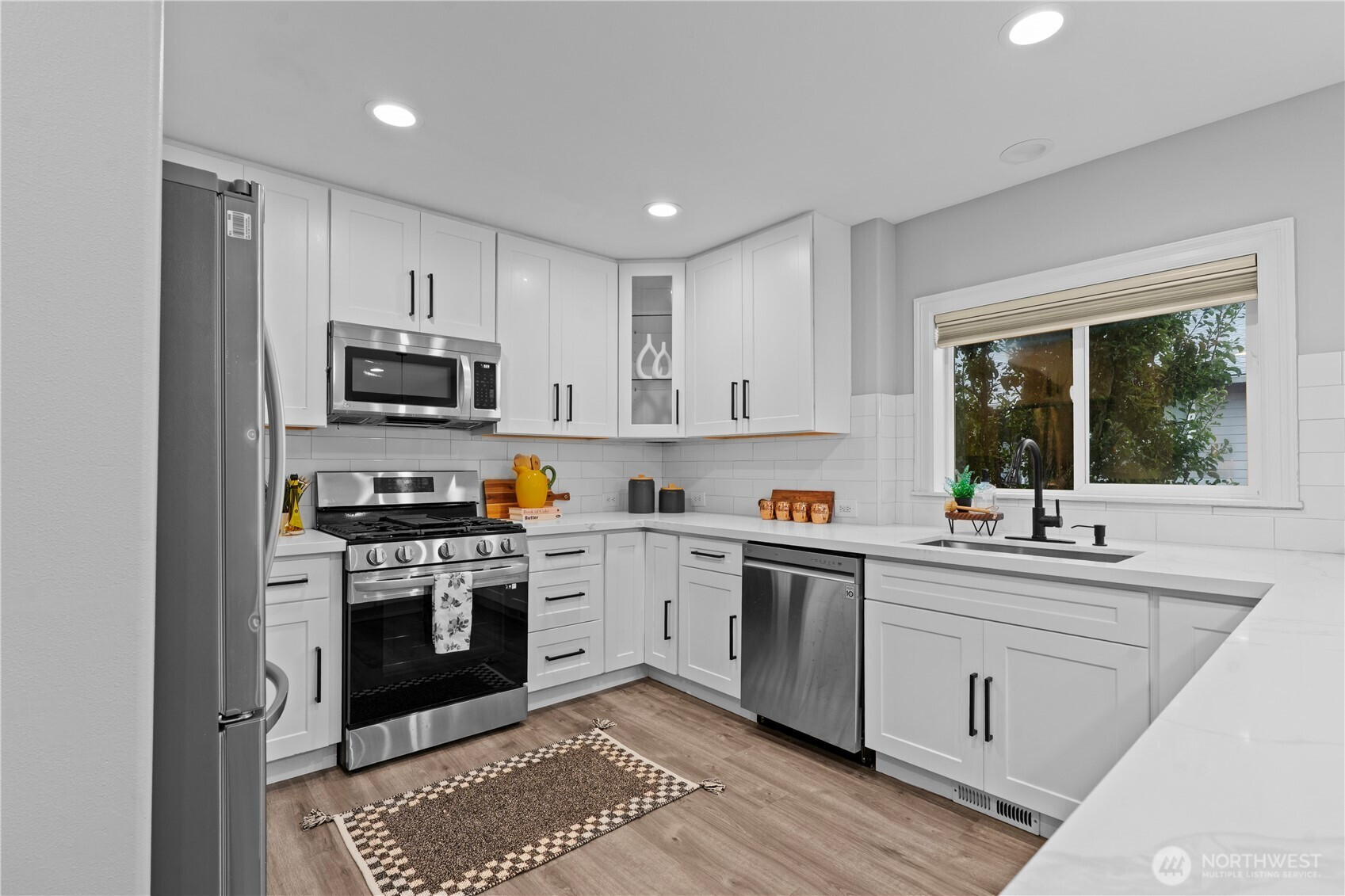 Tastefully remodeled and move-in ready, this spacious 3-story home sits in the heart of Kent, close to everything the city has to offer. The main floor features an open-concept living area with luxury vinyl plank flooring, extensive crown molding, and a cozy fireplace. The modern kitchen boasts brand-new appliances, new cabinets, and ample counter space. Upstairs, the primary suite offers a private five-piece bath—your perfect retreat. A large bonus room on the lower level can be used as a rec room, home office, or 4th bedroom. With new paint, carpet, and flooring throughout, this stunning remodel is truly a must-see!