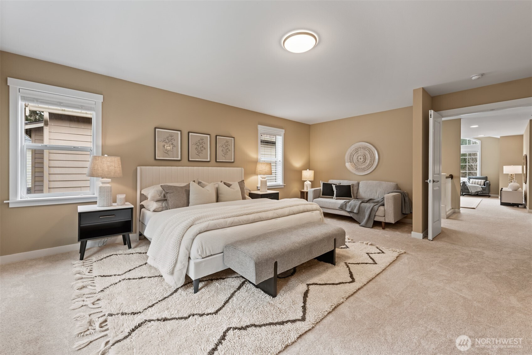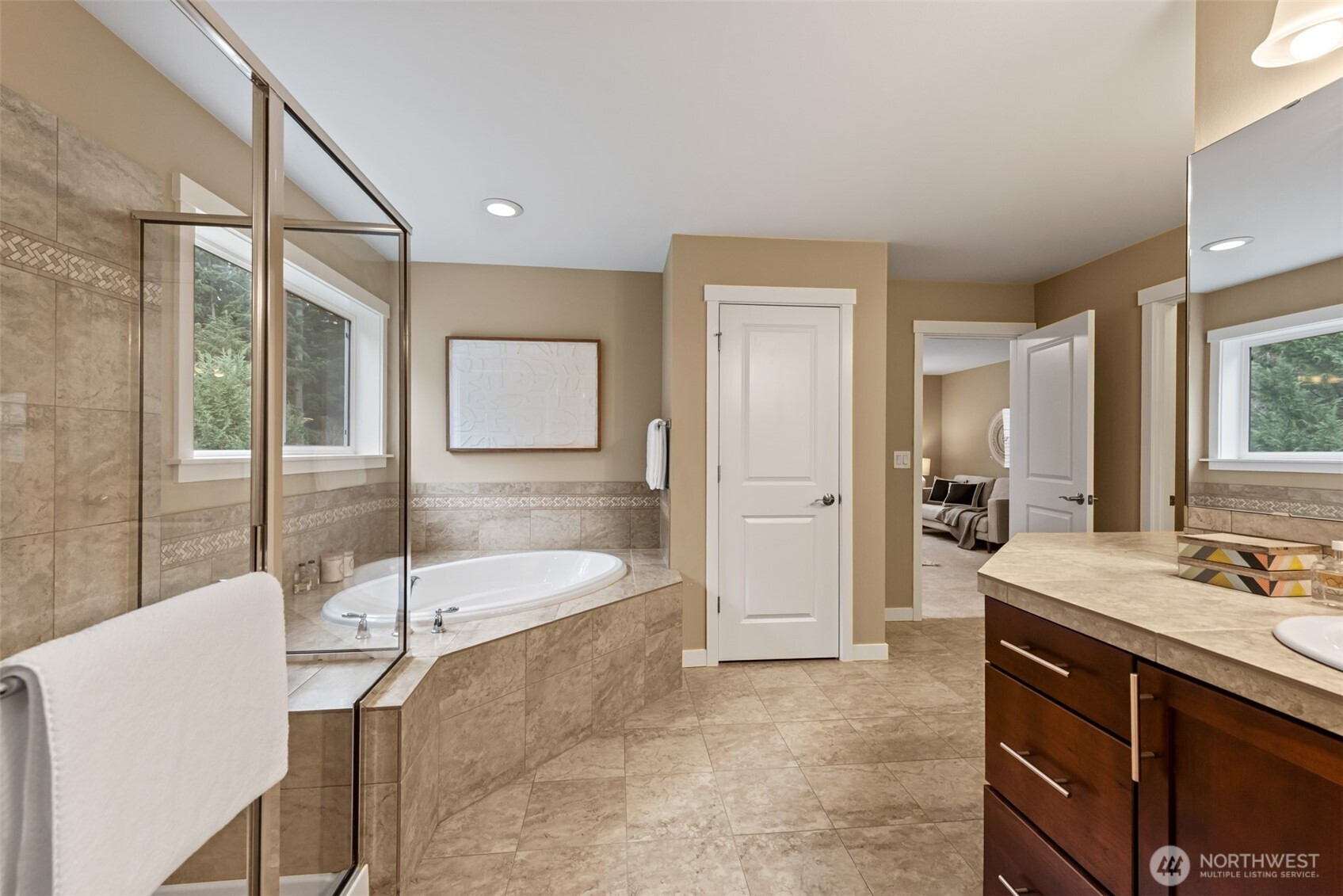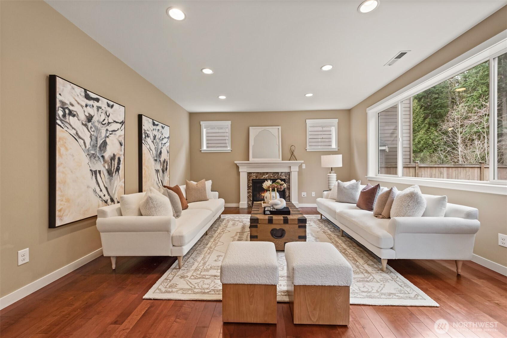 Desirable Redmond Ridge East home on a prime lot backing to lush greenbelt for exceptional privacy and peaceful territorial views. Inviting open great room floorplan with hardwood floors and abundant natural light, ideal for everyday living and entertaining.Spacious kitchen features stainless steel appliances, gas range, quartz countertops, tile backsplash, center island with eating bar, pull-out base cabinets, and generous walk-in pantry.Thoughtful upgrades include beveled glass front door, French doors to den, premium millwork, tiled bathroom floors, laundry cabinetry with utility sink, and convenient service door from garage to yard. Equipped with central A/C and Tesla EV charger in garage for modern comfort and functionality.Enjoy easy access to Bristol Park, neighborhood trails, QFC, tennis courts, sports fields, and Microsoft commuter bus stops.