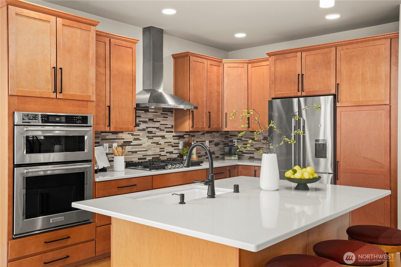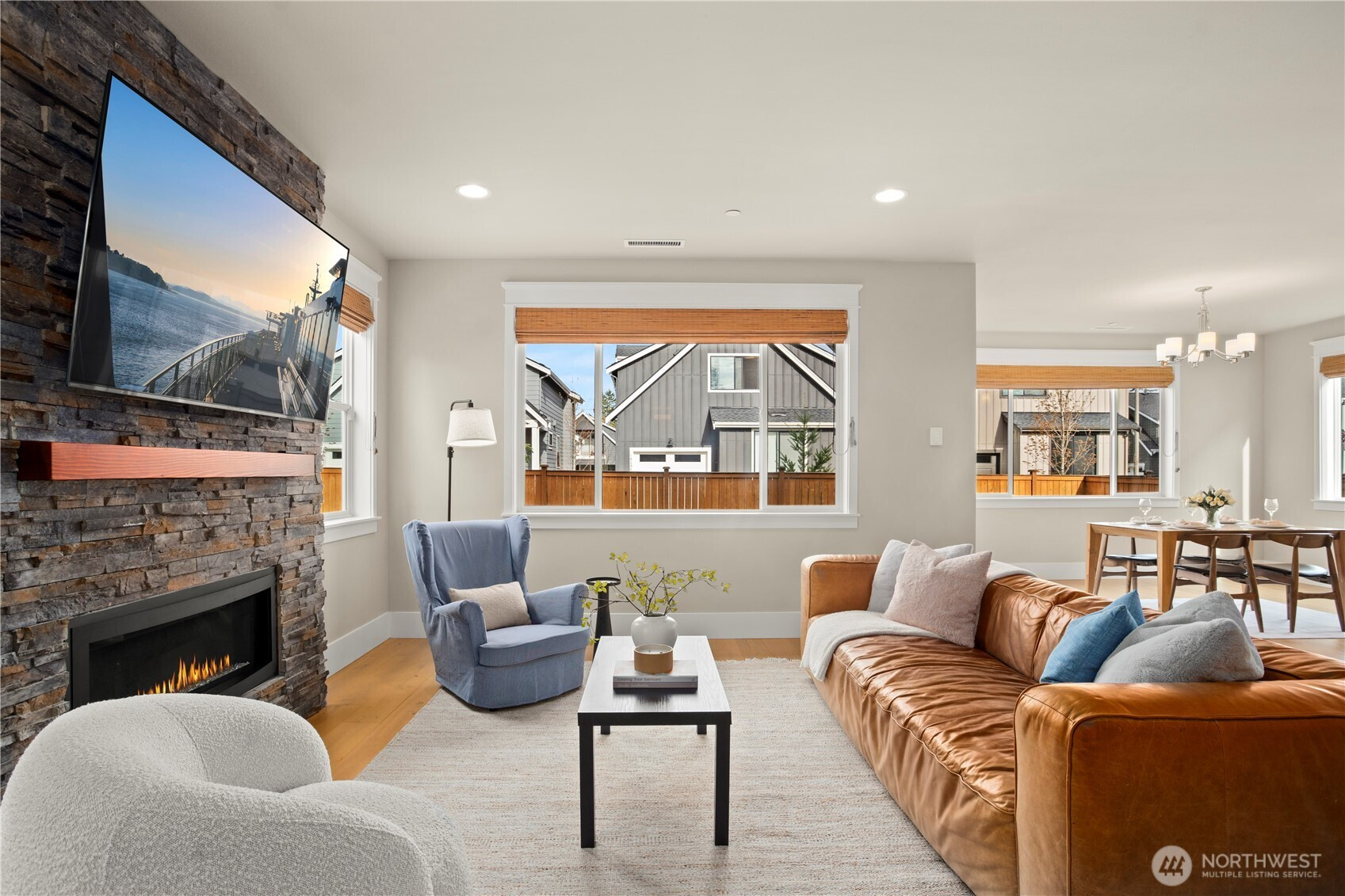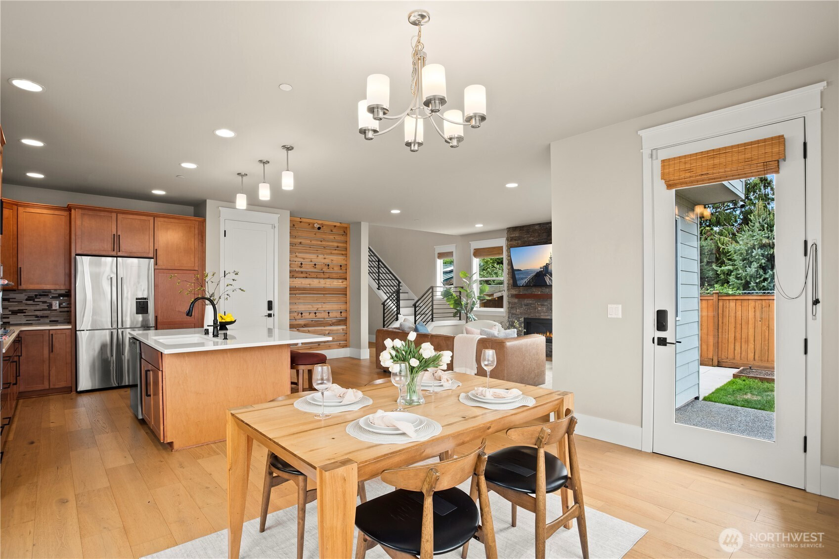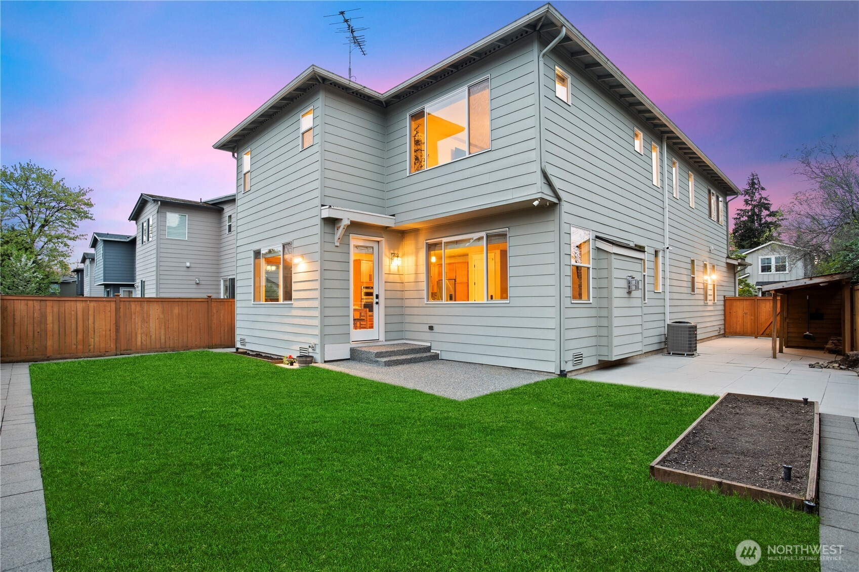 Nestled in highly sought-after Rose Hill, this thoughtfully designed home in Heather’s Ridge offers the perfect blend of comfort, style, and modern convenience. At the heart of the home is the chef’s kitchen, featuring quartz countertops, stainless steel appliances, and an open layout that flows seamlessly into the inviting living room, featuring a cozy gas fireplace. Engineered hardwood flooring runs throughout the home, enhanced by electric under-floor heating for added warmth during PNW winters. In the warmer months, enjoy central A/C indoors or step outside to a level, fully-fenced backyard with a private patio - the perfect spot for summer BBQs and gatherings. The dedicated home office, complete with elegant French doors, provides a quiet and functional work-from-home retreat. The upper level showcases a spacious primary suite with a spa-like 5-piece ensuite bath and walk-in closet, a conveniently located laundry room, plus three additional bedrooms and a full bath. Other thoughtful upgrades include EV charging capability, a full-house humidifier, irrigation system, and home security system. Residents also enjoy access to a community park and playground. Ideally located just minutes from major tech campuses, I-405, and top-rated Lake Washington schools - this is Rose Hill living at its finest. Welcome home!