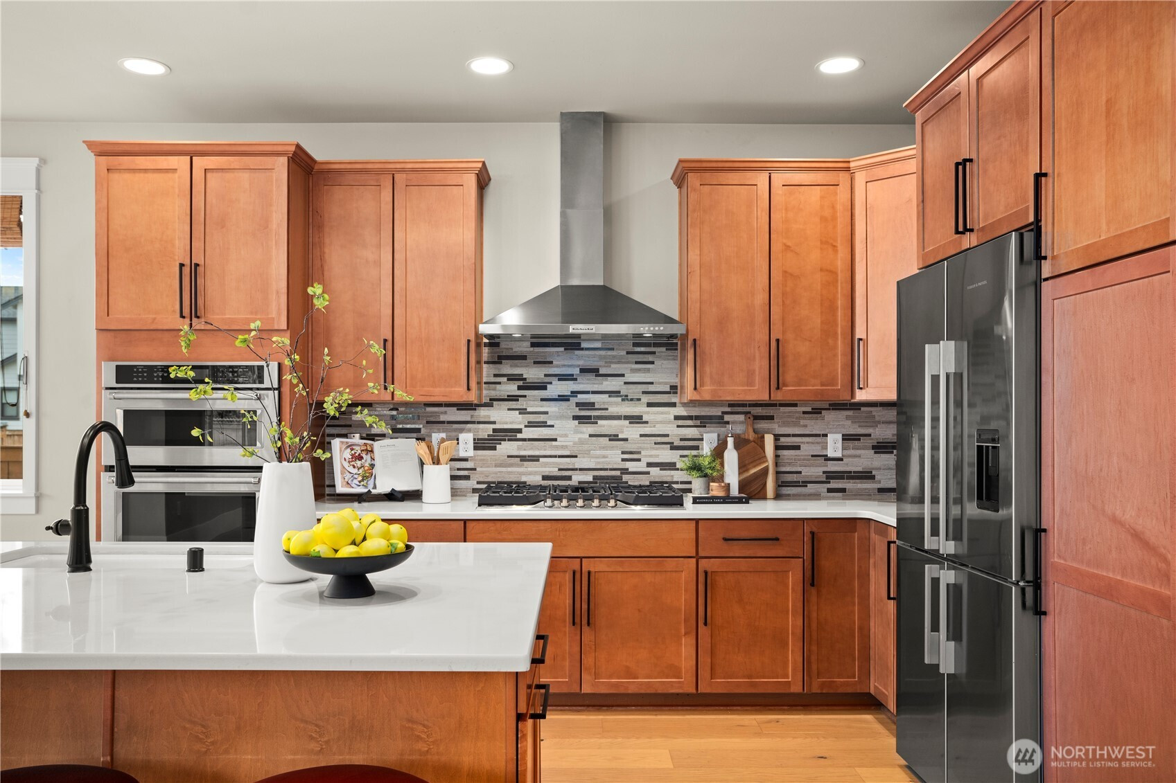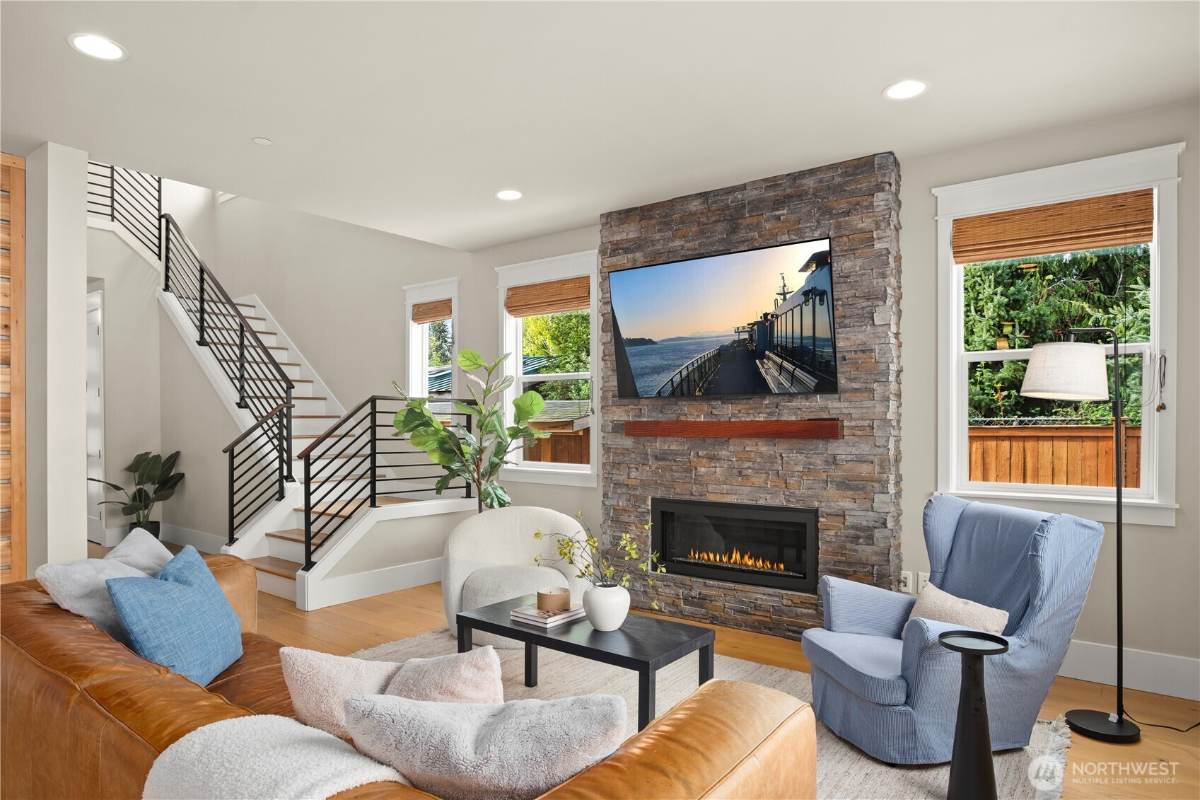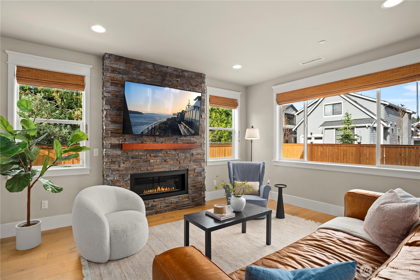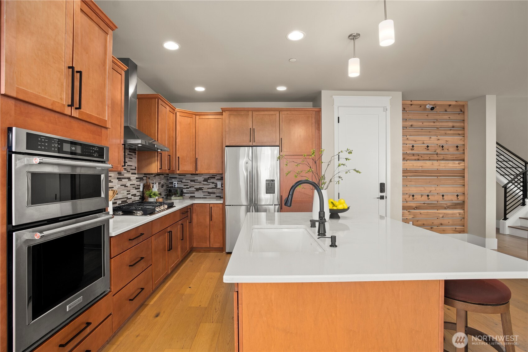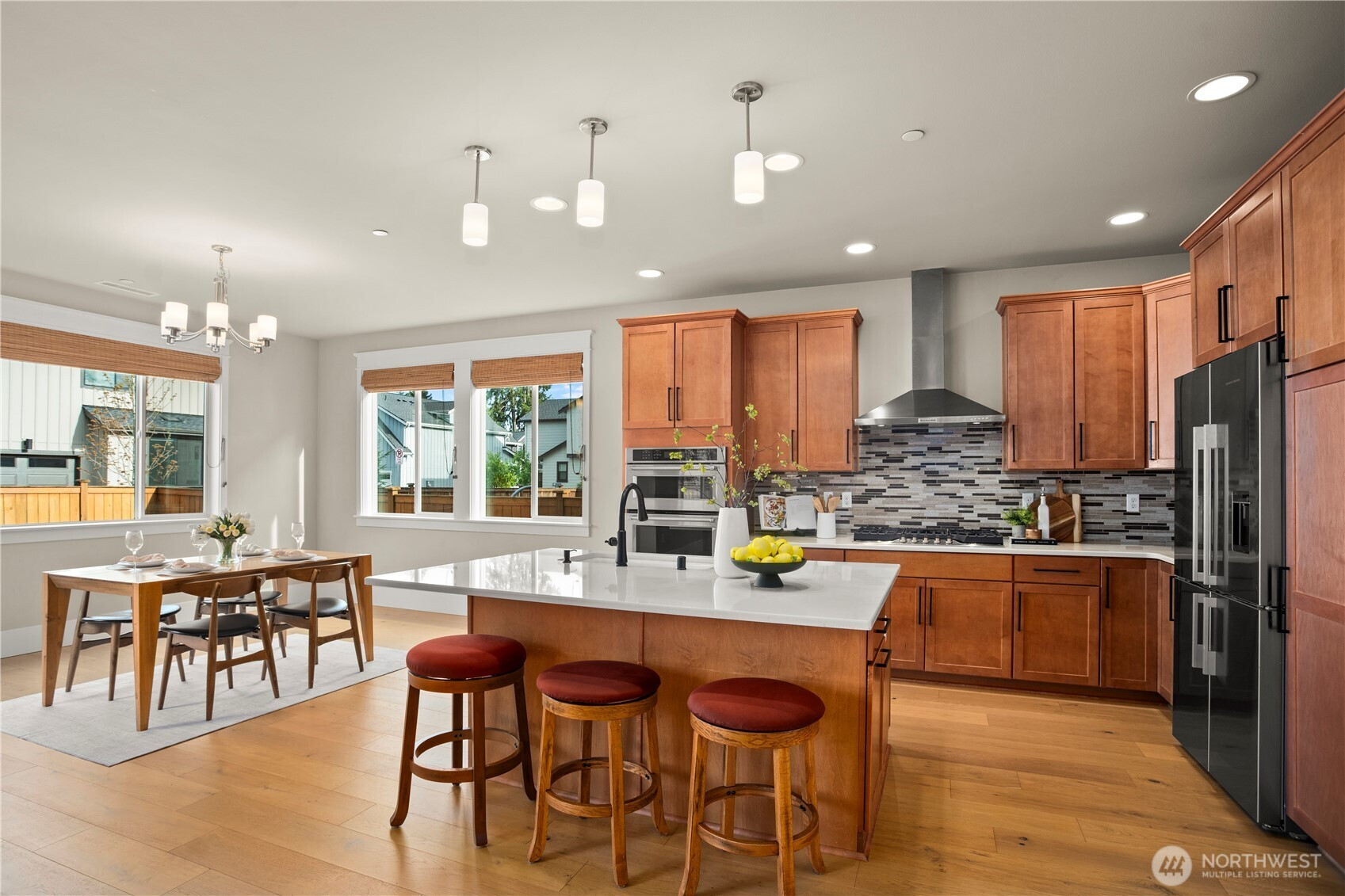 Nestled in highly sought-after Rose Hill, this thoughtfully designed home in Heather’s Ridge offers the perfect blend of comfort, style, and modern convenience. At the heart of the home is the chef’s kitchen, featuring quartz countertops, stainless steel appliances, and an open layout that flows seamlessly into the inviting living room, featuring a cozy gas fireplace. Engineered hardwood flooring runs throughout the home, enhanced by electric under-floor heating for added warmth during PNW winters. In the warmer months, enjoy central A/C indoors or step outside to a level, fully-fenced backyard with a private patio - the perfect spot for summer BBQs and gatherings. The dedicated home office, complete with elegant French doors, provides a quiet and functional work-from-home retreat. The upper level showcases a spacious primary suite with a spa-like 5-piece ensuite bath and walk-in closet, a conveniently located laundry room, plus three additional bedrooms and a full bath. Other thoughtful upgrades include EV charging capability, a full-house humidifier, irrigation system, and home security system. Residents also enjoy access to a community park and playground. Ideally located just minutes from major tech campuses, I-405, and top-rated Lake Washington schools - this is Rose Hill living at its finest. Welcome home!