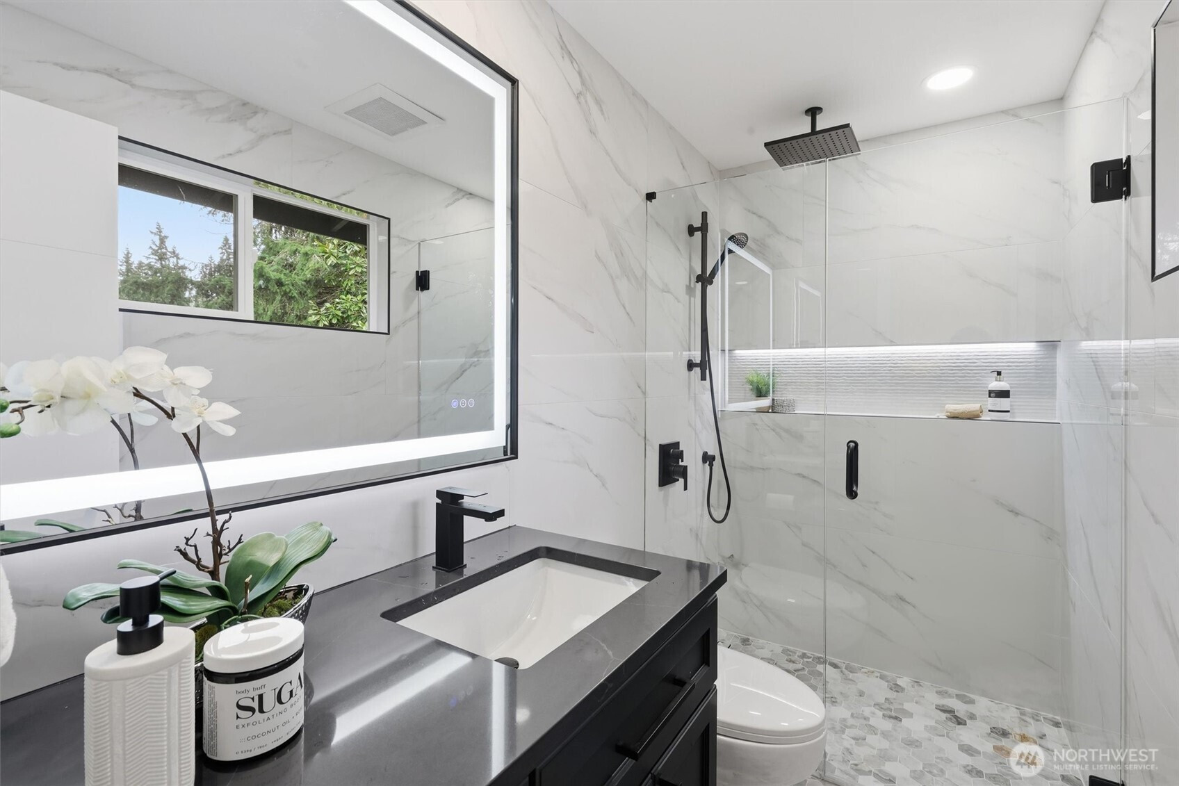 Fully reimagined & impeccably executed move-in-ready residence blending timeless sophistication w/ modern comfort. Expansive 1/3+ acre homesite offering a curated living experience defined by refined materials & designer craftsmanship throughout. At the heart of the home, an open-concept kitchen & living space showcases premium solid-wood soft-close cabinetry, ambient under-cabinet illumination, bespoke smart appliances, & a striking quartz island featuring discreet point-pod outlet. Versatile bonus/media lounge w/ wet bar & beverage fridge enhances entertaining while providing seamless indoor-outdoor connectivity through additional exterior access. Spa-inspired bathrooms evoke a boutique retreat atmosphere, appointed with frameless glass enclosures, a luxurious curbless primary shower, deep soaking tub, & illuminated anti-fog mirrors. Extensive enhancements include brand-new Milgard windows, new doors & architectural hardware, hardwood flooring, custom millwork & trim, designer tile selections, contemporary lighting, & fresh interior & exterior paint. Fully fenced grounds offer a private, low-maintenance sanctuary complete w/ new landscaping, paver hardscaping, & premium artificial turf. Finished 2-car garage features Wi-Fi connectivity & EV-charging pre-wiring, complementing the home’s smart & future-ready infrastructure. Quiet, friendly neighborhood within walking distance to parks. Turnkey. Refined. Intelligent design. Elevated standard of living ready to be experienced.