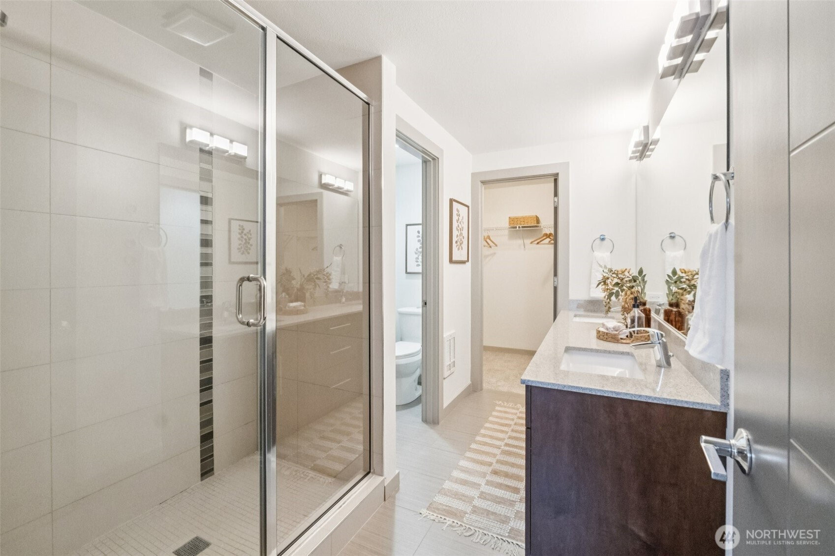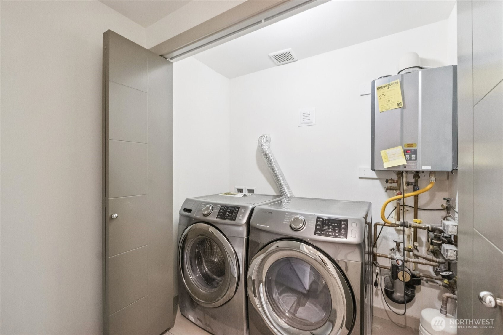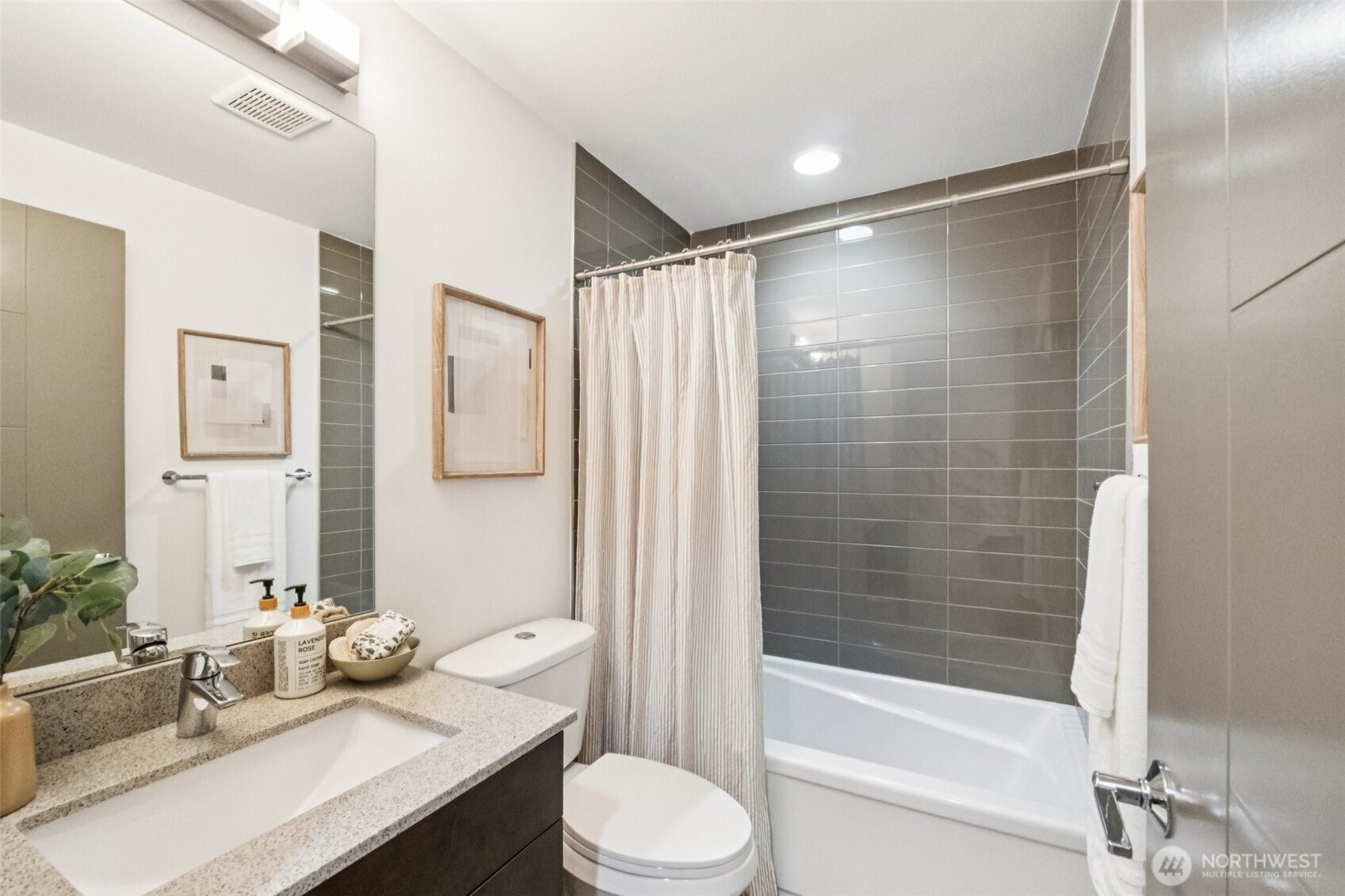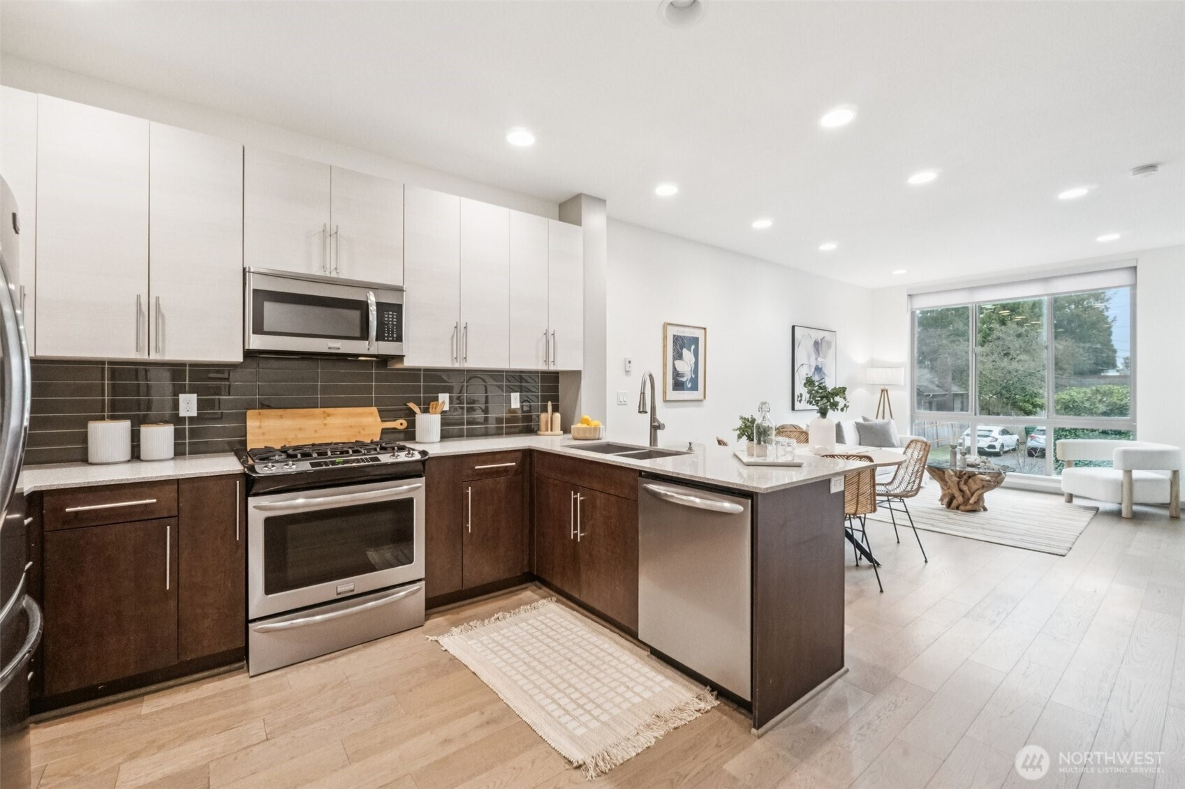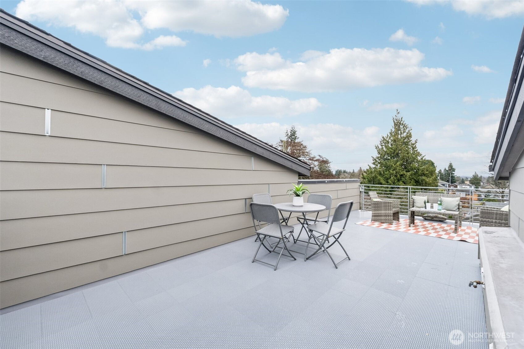 Better than new 2017-built townhome in prime North Seattle location! Soaring floor-to-ceiling windows flood the main floor w/light, showcasing the tasteful kitchen w/quartz counters, stainless appliances, & a generous living room anchored by a cozy gas fireplace—ideal for relaxing or entertaining. Upstairs, a private primary offers an upscale en suite & walk-in closet, while the lower level offers flexibility with 2 bdrms & full bath—perfect for guests, office, or gym. Host sunset gatherings on the rooftop deck w/gas hookup & eye-catching city & mountain views. New roof & new painting throughout in 2025. Enjoy radiant heat, & a gated front yard which provides added privacy. Off-street parking, no HOA dues, & pre-inspected—move in and enjoy!