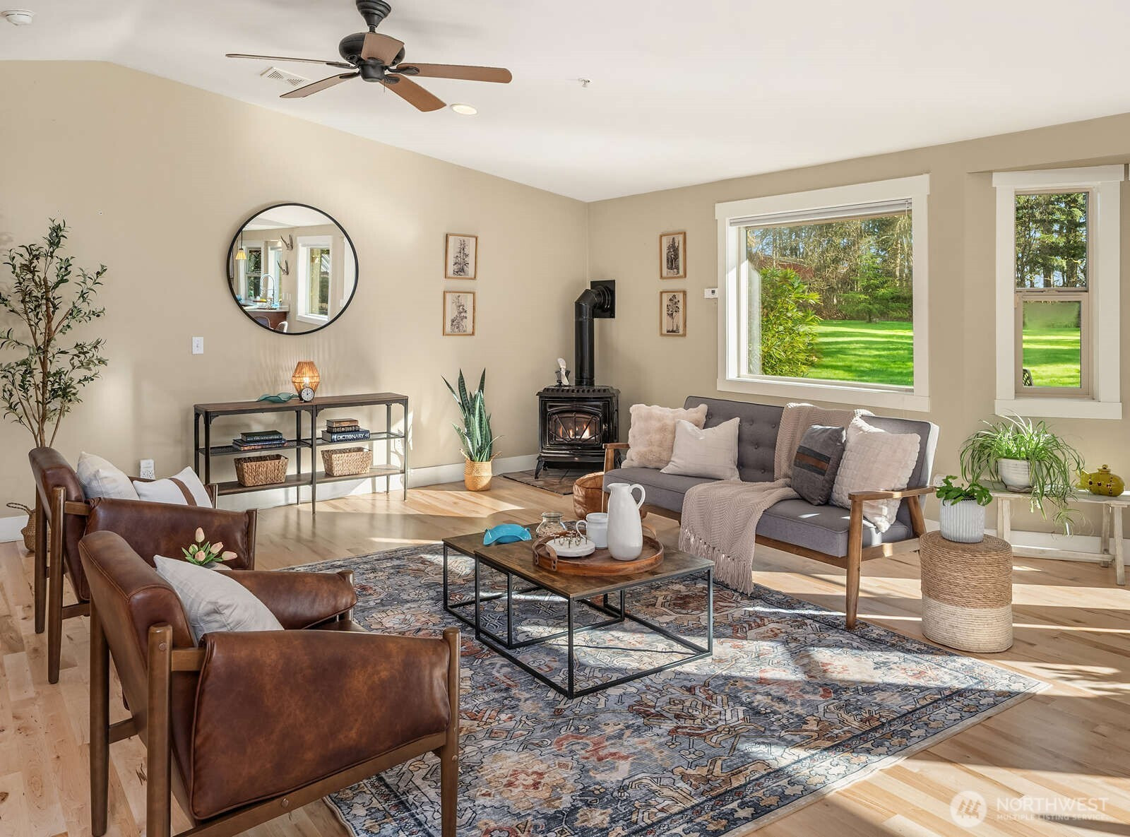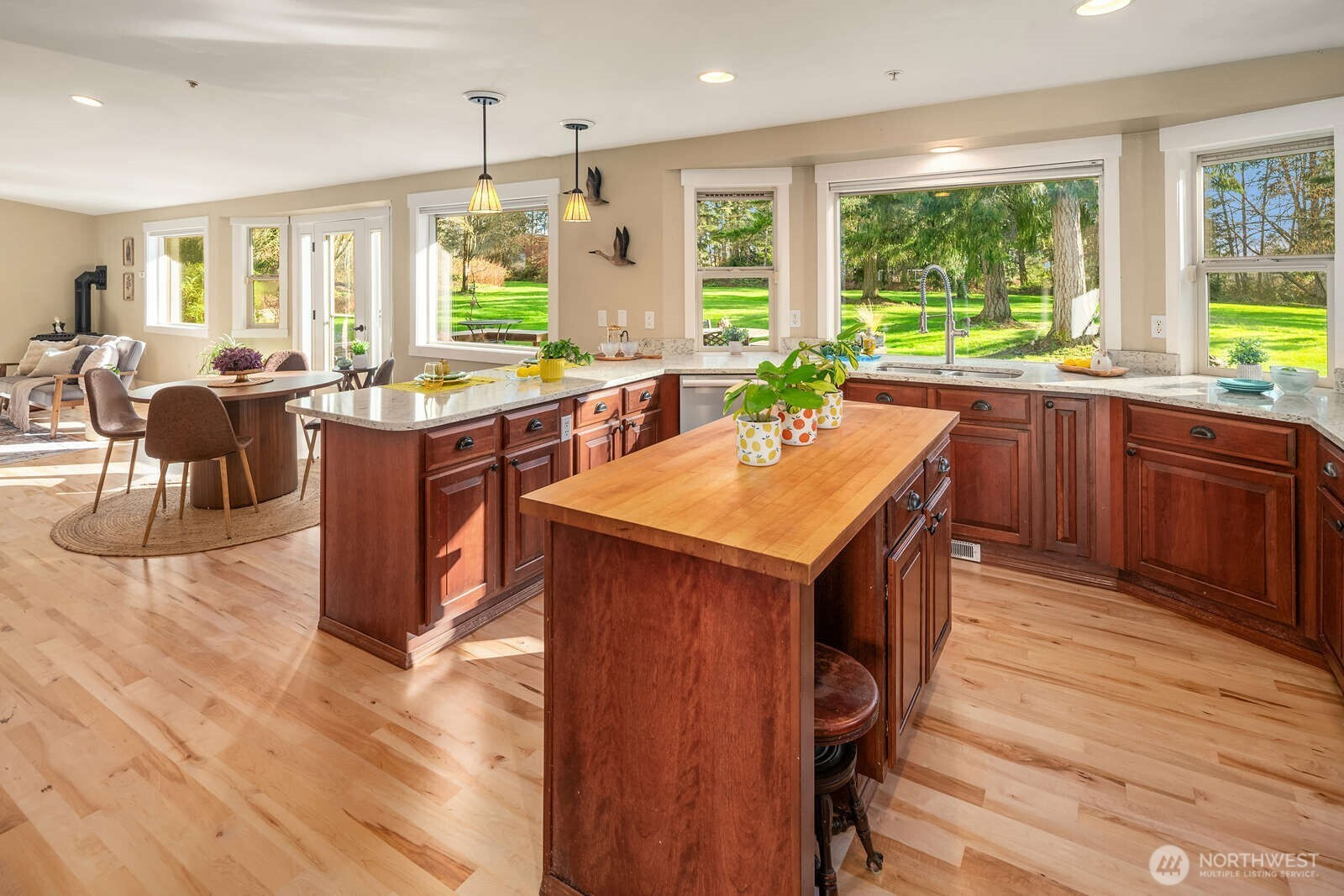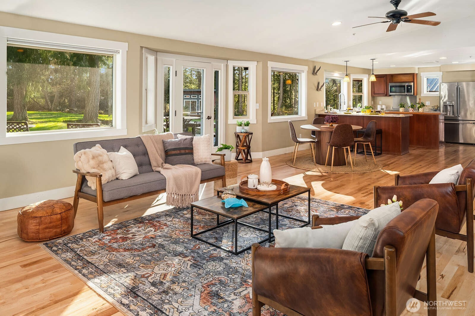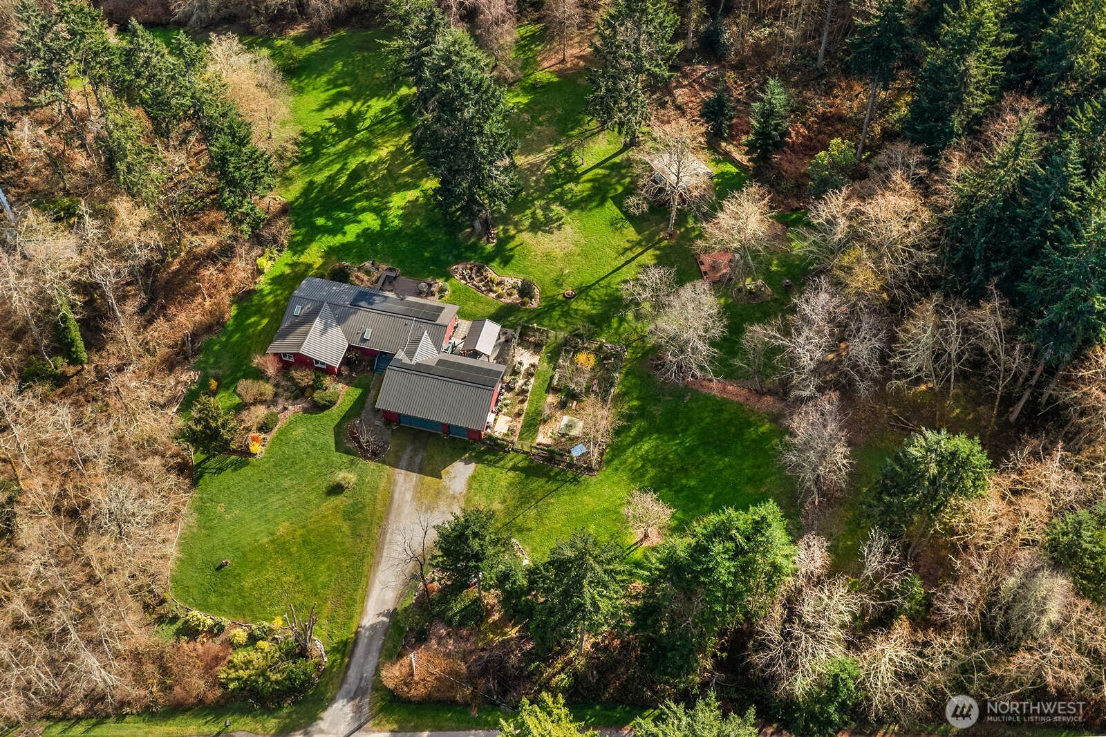 Terrapin Meadows offers easy single floor living shaped around light, space, and connection to the outdoors. The home features 3 beds and 2 baths across 2040 sq ft with newly refinished maple hardwood floors, solid wood doors and finishes and an open chef's kitchen with Viking induction stove, GE Cafe refrigerator and microwave, and quartz counters. Walls of windows and remote skylights bring in natural light, supported by electric convection heat and a propane stove. The layout moves naturally outdoors where a tigerwood deck with built in seating opens from the main living area. A covered dining pavilion and adjacent kitchen garden with raised beds and deer fencing sit just steps from the kitchen, creating a seamless setting for casual meals, gatherings, or spontaneous entertaining. The five acre property is level and expansive with full southern exposure, mature gardens, open lawn, and overflow parking. A detached studio with water, a single open room, and sliding glass walls with deck sits near an outdoor stage, well suited for music, art, or office use. A 3 car garage with over 1000 sq ft offers shop space. Solar panels, Generac propane generator, metal roof, new electric panel, and sewer connection are in place. End of the road and centrally located with equal access to both ferries, adjacent to Island Center forest. An inviting parklike setting with wildlife, birds, and gardens that come fully alive each spring.