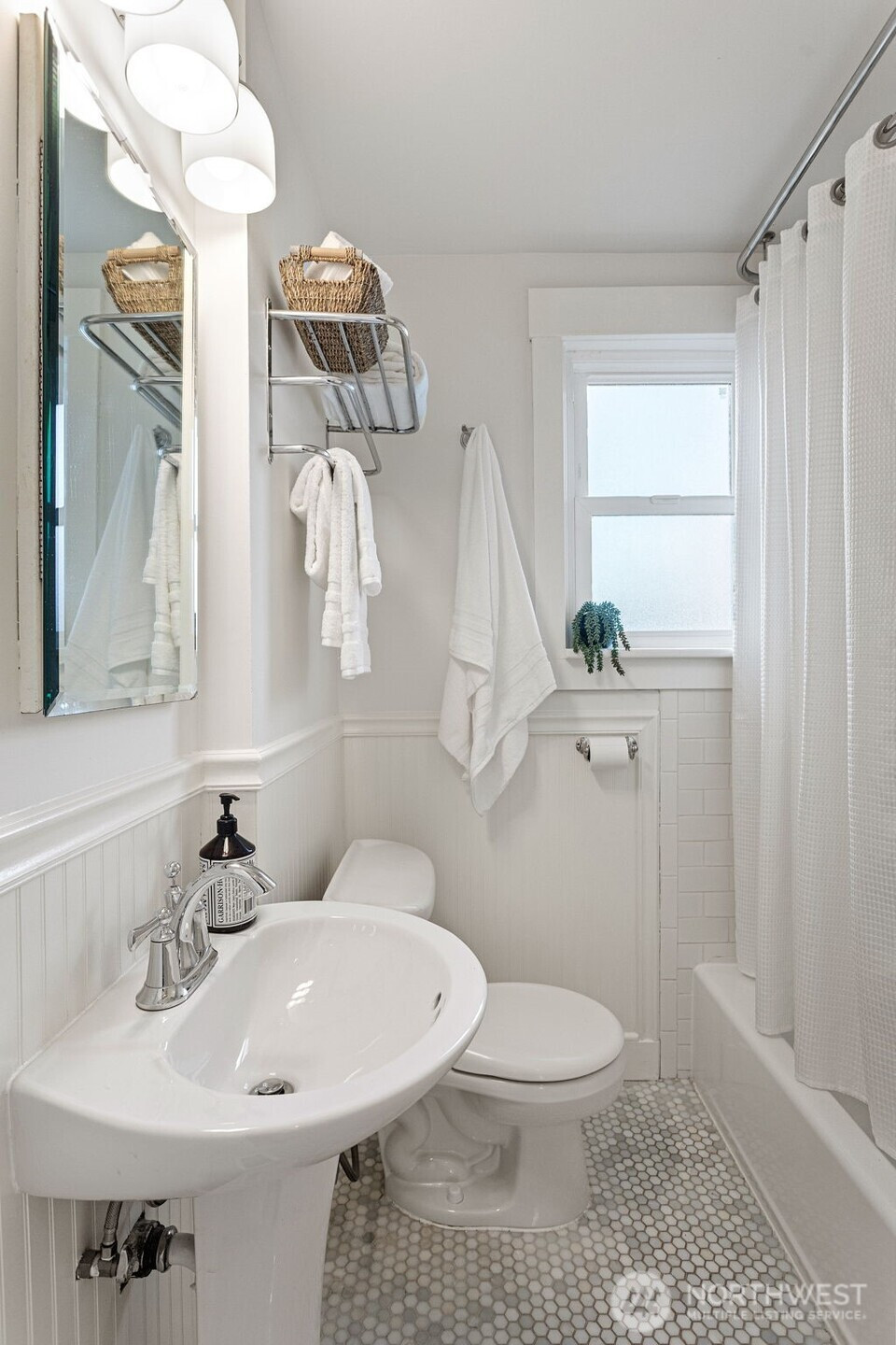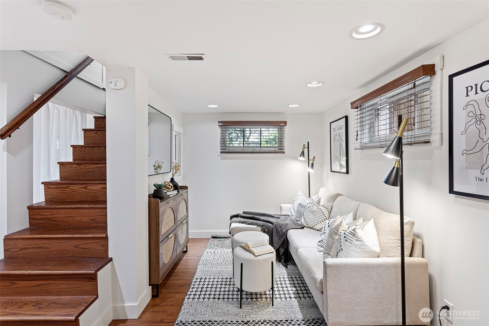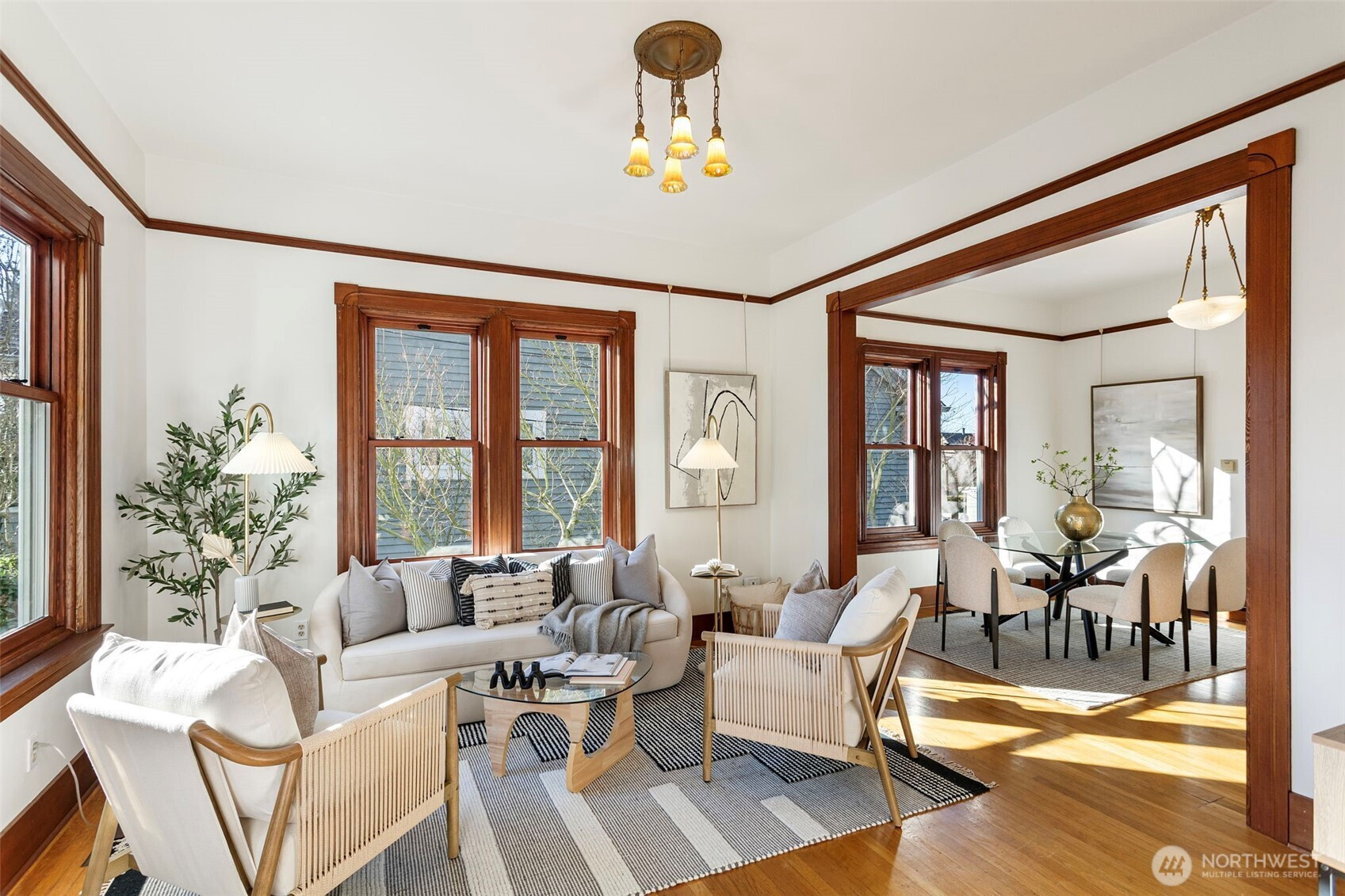 This beautifully maintained Tangletown bungalow is a true charmer! The sweet front porch welcomes you in, offering the perfect spot to watch neighbors and dogs stroll by. Swoon over the high ceilings, lovely window casings, oak floors and period lighting on the main. Desirable floorplan allows three beds on the main, or flexibility to meet your needs and lifestyle. Sizeable kitchen with quartz counters, cabinets that stretch to the ceiling and a range with double ovens. Also a sweet spot for in-kitchen dining, and kicking off your shoes and shedding coats inside the back door. Private deck off the back has stairs down to access the professionally landscaped gardens. Lower level primary bedroom with en-suite bath and adjacent room that could be rec room, office or nursery. Along with the extra large dressing room, there is also plenty of finished storage. Walk out from basement to patio, backyard sanctuary and garage. Steller location with easy commute to pick up I-5 or Hwy 99, or access to the Roosevelt Light Rail station. Great schools: Green Lake Elem, Hamilton Middle and Lincoln High as well as McDonald Elementary Geo-zone. Enjoy good living with Tangletown restaurant favorites a few blocks away such as Zoka Coffee, Kisaku, Tangletown Public House, Restaurant Christine & Aslan Brewing. And, the topper is Green Lake Park and all of its wonderful surrounding local coffee shops, restaurants and businesses that are so fun to frequent.