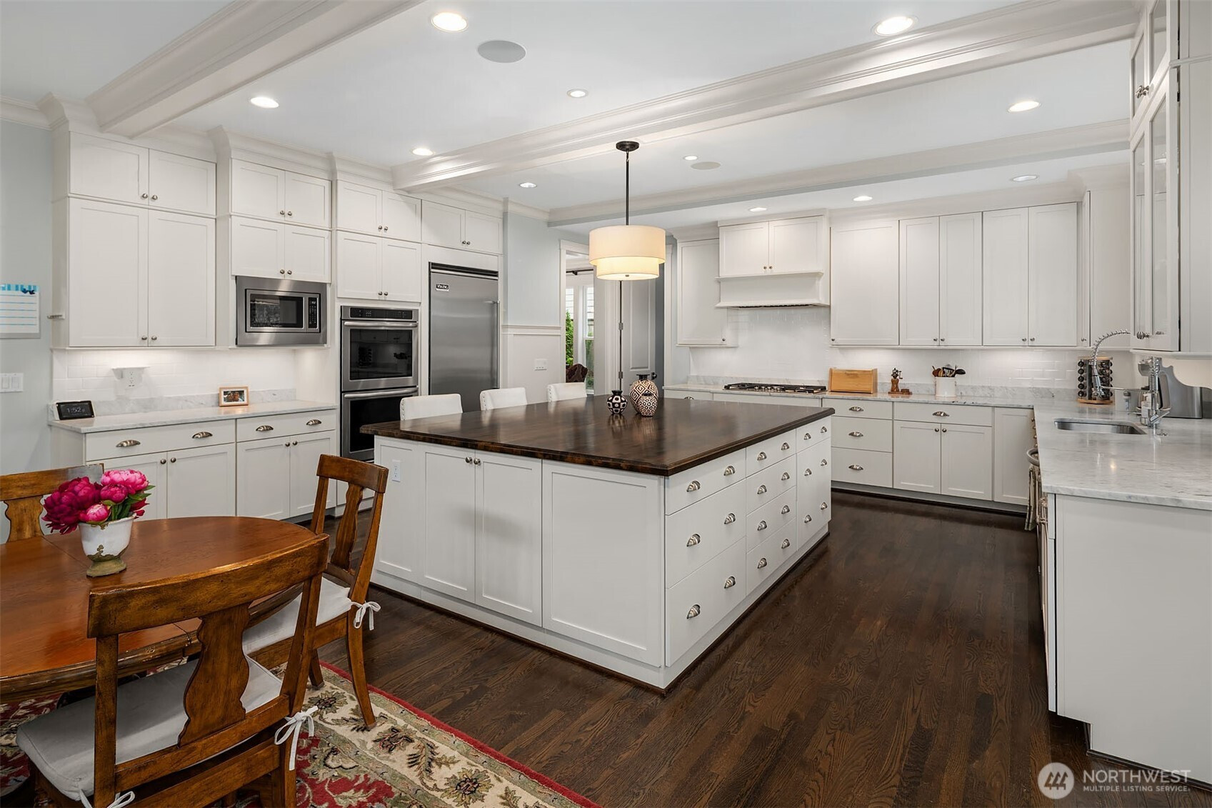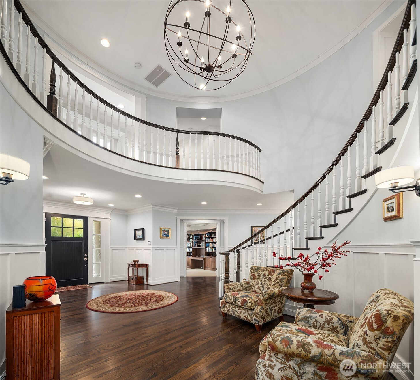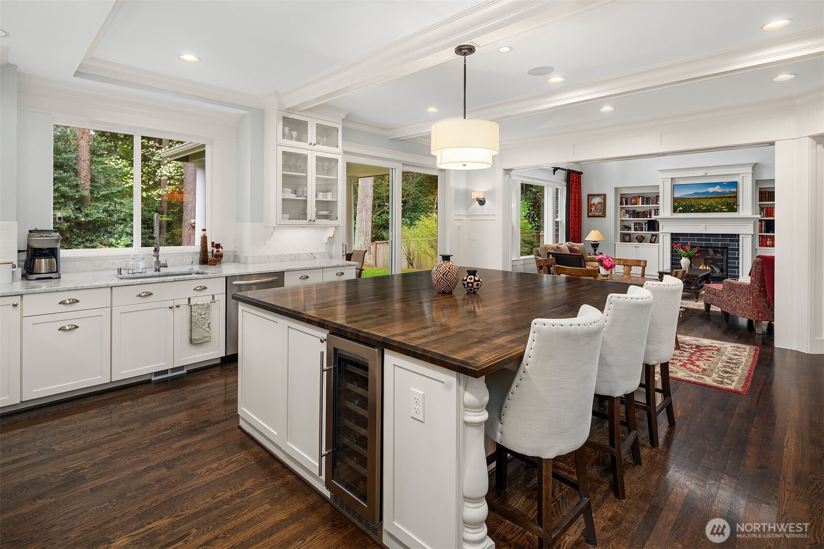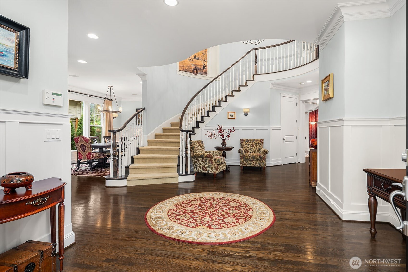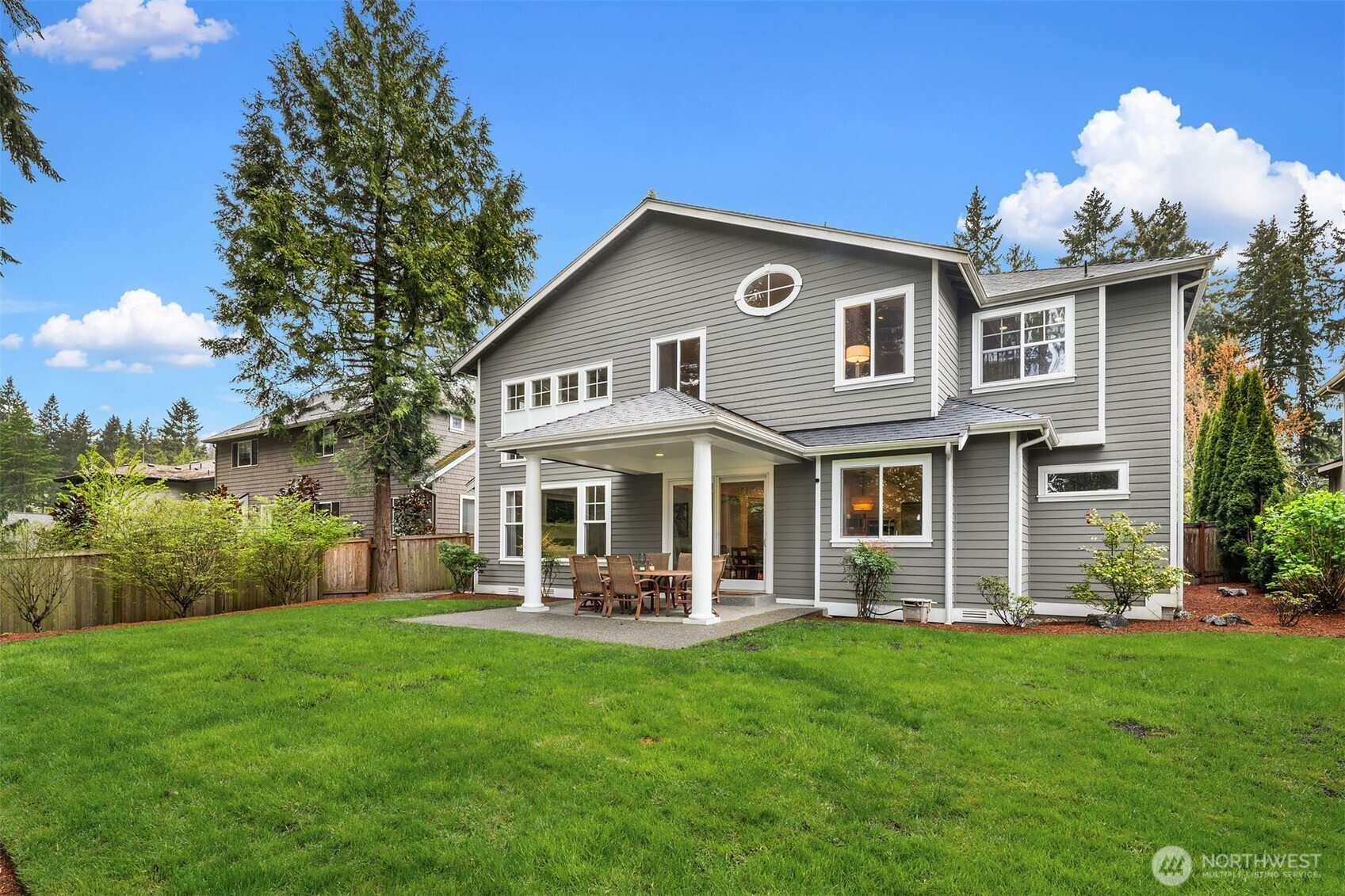 Timeless elegance meets modern comfort in this beautifully crafted one-owner home accented with rich hardwoods, extensive millwork, gorgeous marble, and expansive windows. A welcoming covered front porch opens to a grand rotunda entry highlighted by a stunning bridal staircase. The masterful kitchen is generous in size and functionality with premium appliances, walk-in pantry, an impressive island with breakfast bar, and a slider to the covered patio. Open to the kitchen, the inviting family room showcases a cozy gas fireplace, custom built-ins, dramatic 2-story box-beam ceilings, and clerestory windows that flood the space with natural light. Enjoy formal and casual dining options ideal for both elegant gatherings and everyday living. The main floor den offers flexibility with French doors, built-ins and a closet—a comfortable home office or guest space. Upstairs, the primary suite offers vaulted ceilings, fireplace, luxurious 5-piece bath, and a walk-in closet. 2 additional storybook bedrooms share a Jack-and-Jill bathroom, and the 4th bedroom features a continental bath. The spacious bonus/media room adds versatility and provides the perfect get-away. The gorgeous setting with southern exposure features landscaped garden beds, a charming white picket fence, and a private fenced yard with a covered patio and built-in speakers for optimal outdoor entertaining. The desirable location is just blocks to neighborhood parks, Enatai Elem and minutes to downtown Bellevue and I-90.