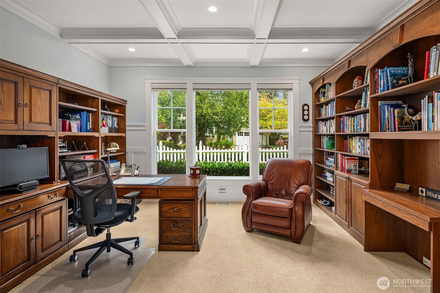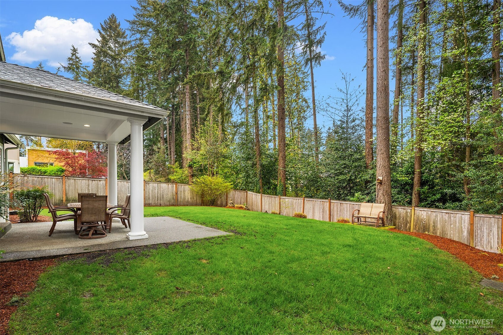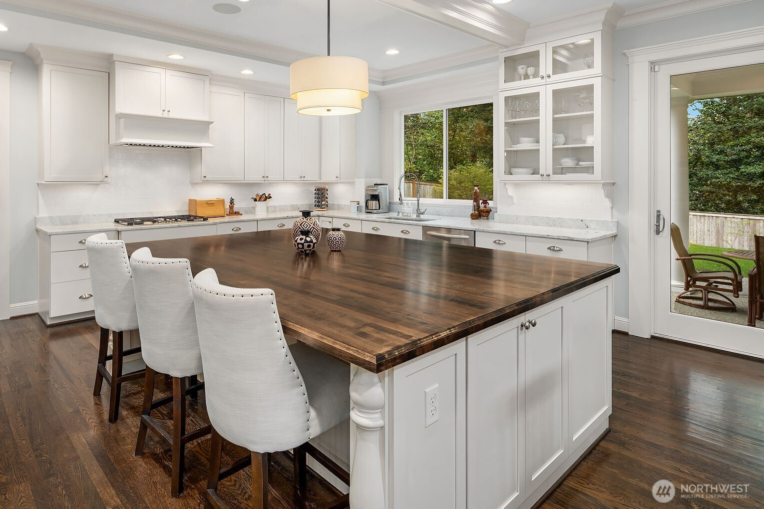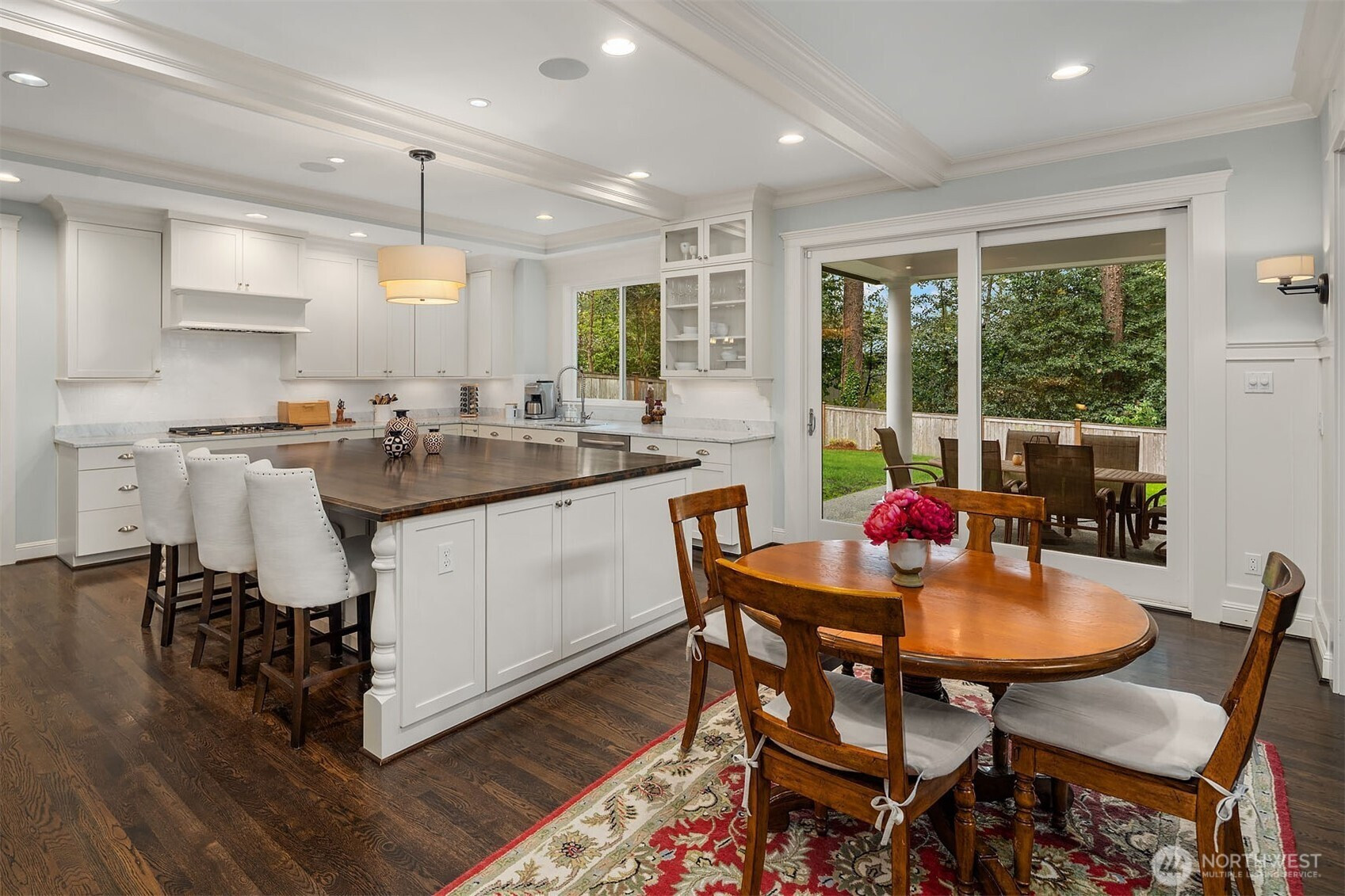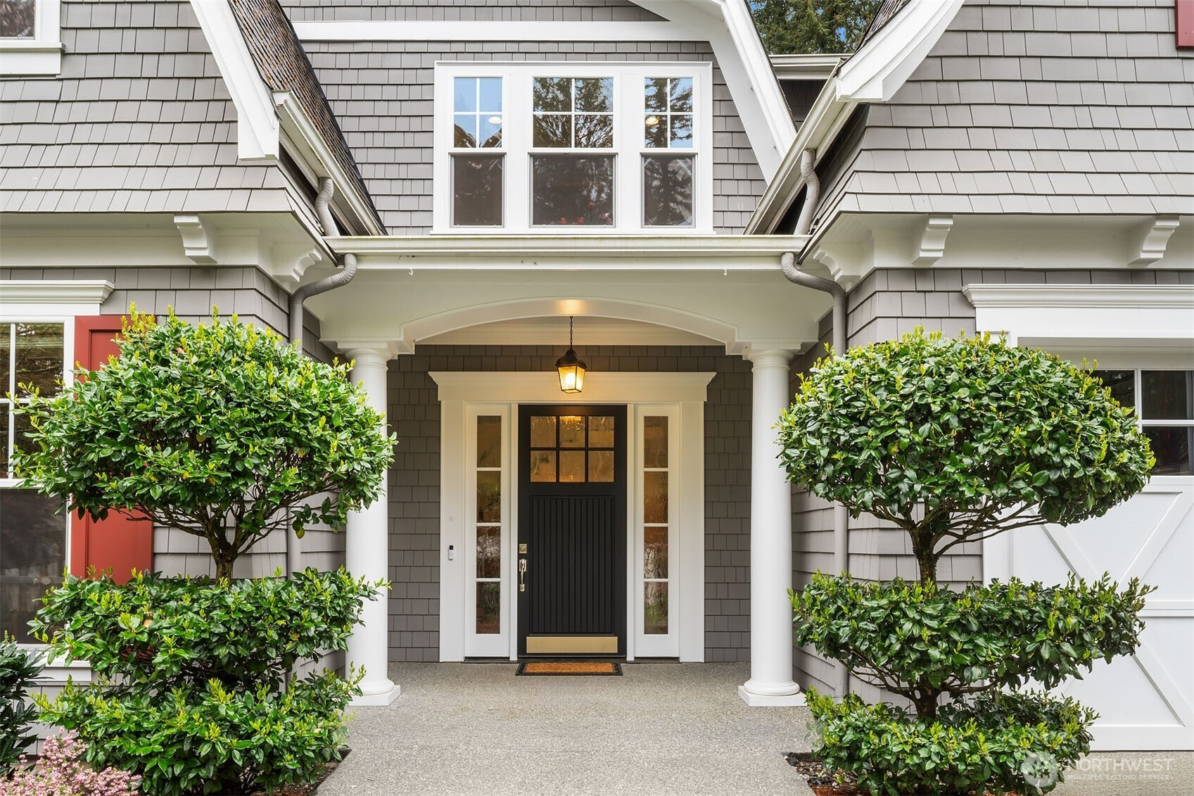 Timeless elegance meets modern comfort in this beautifully crafted one-owner home accented with rich hardwoods, extensive millwork, gorgeous marble, and expansive windows. A welcoming covered front porch opens to a grand rotunda entry highlighted by a stunning bridal staircase. The masterful kitchen is generous in size and functionality with premium appliances, walk-in pantry, an impressive island with breakfast bar, and a slider to the covered patio. Open to the kitchen, the inviting family room showcases a cozy gas fireplace, custom built-ins, dramatic 2-story box-beam ceilings, and clerestory windows that flood the space with natural light. Enjoy formal and casual dining options ideal for both elegant gatherings and everyday living. The main floor den offers flexibility with French doors, built-ins and a closet—a comfortable home office or guest space. Upstairs, the primary suite offers vaulted ceilings, fireplace, luxurious 5-piece bath, and a walk-in closet. 2 additional storybook bedrooms share a Jack-and-Jill bathroom, and the 4th bedroom features a continental bath. The spacious bonus/media room adds versatility and provides the perfect get-away. The gorgeous setting with southern exposure features landscaped garden beds, a charming white picket fence, and a private fenced yard with a covered patio and built-in speakers for optimal outdoor entertaining. The desirable location is just blocks to neighborhood parks, Enatai Elem and minutes to downtown Bellevue and I-90.