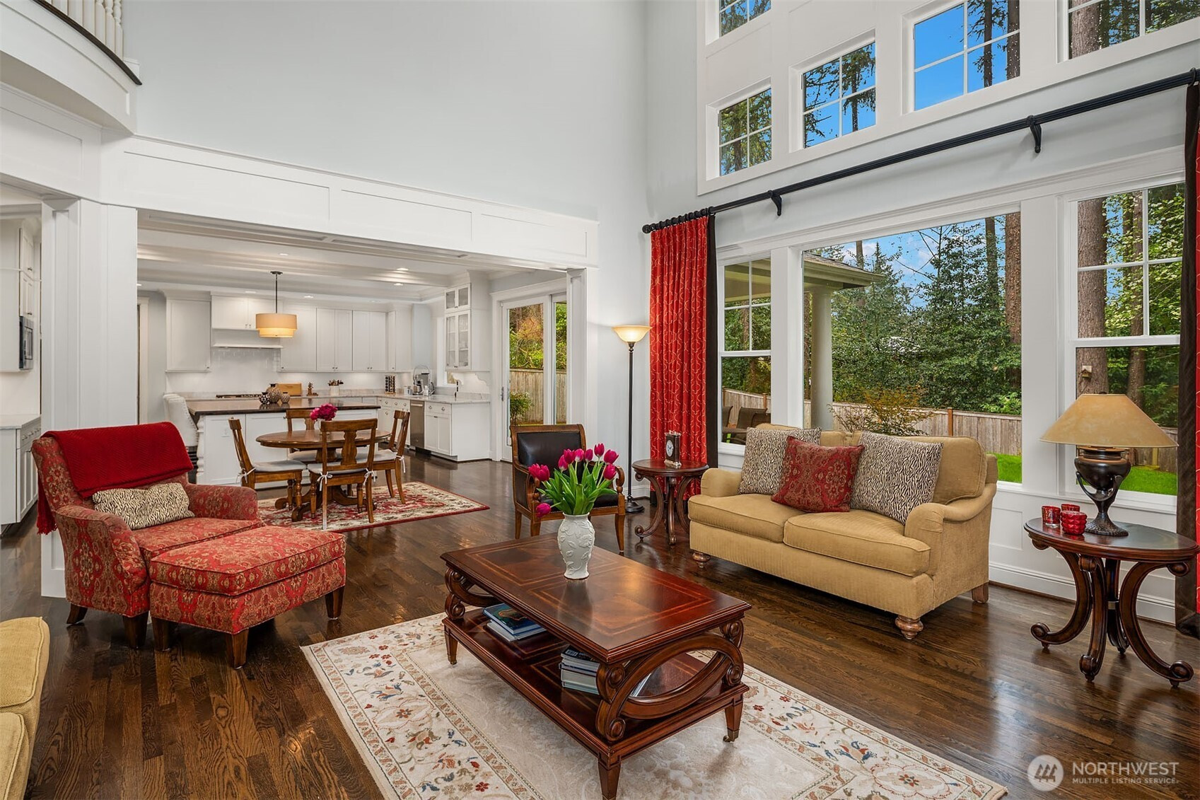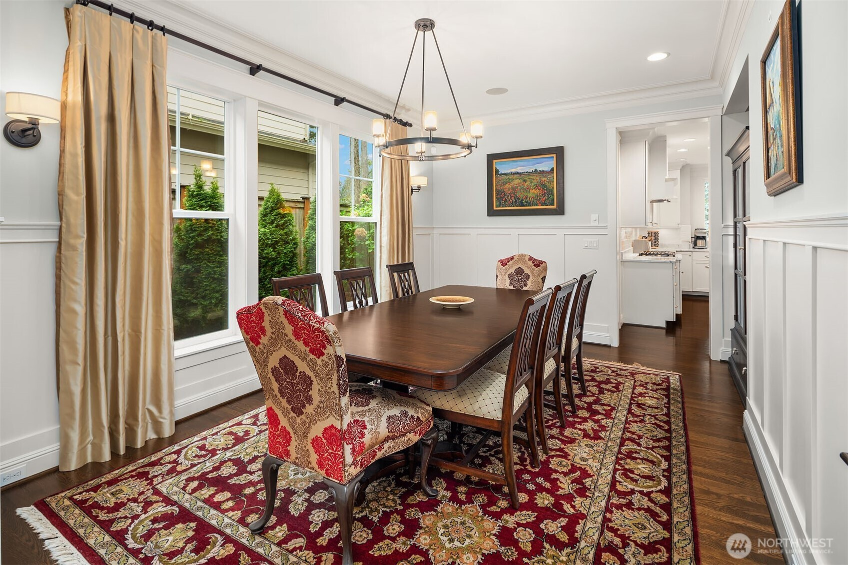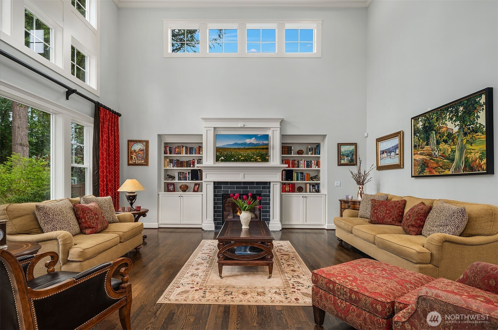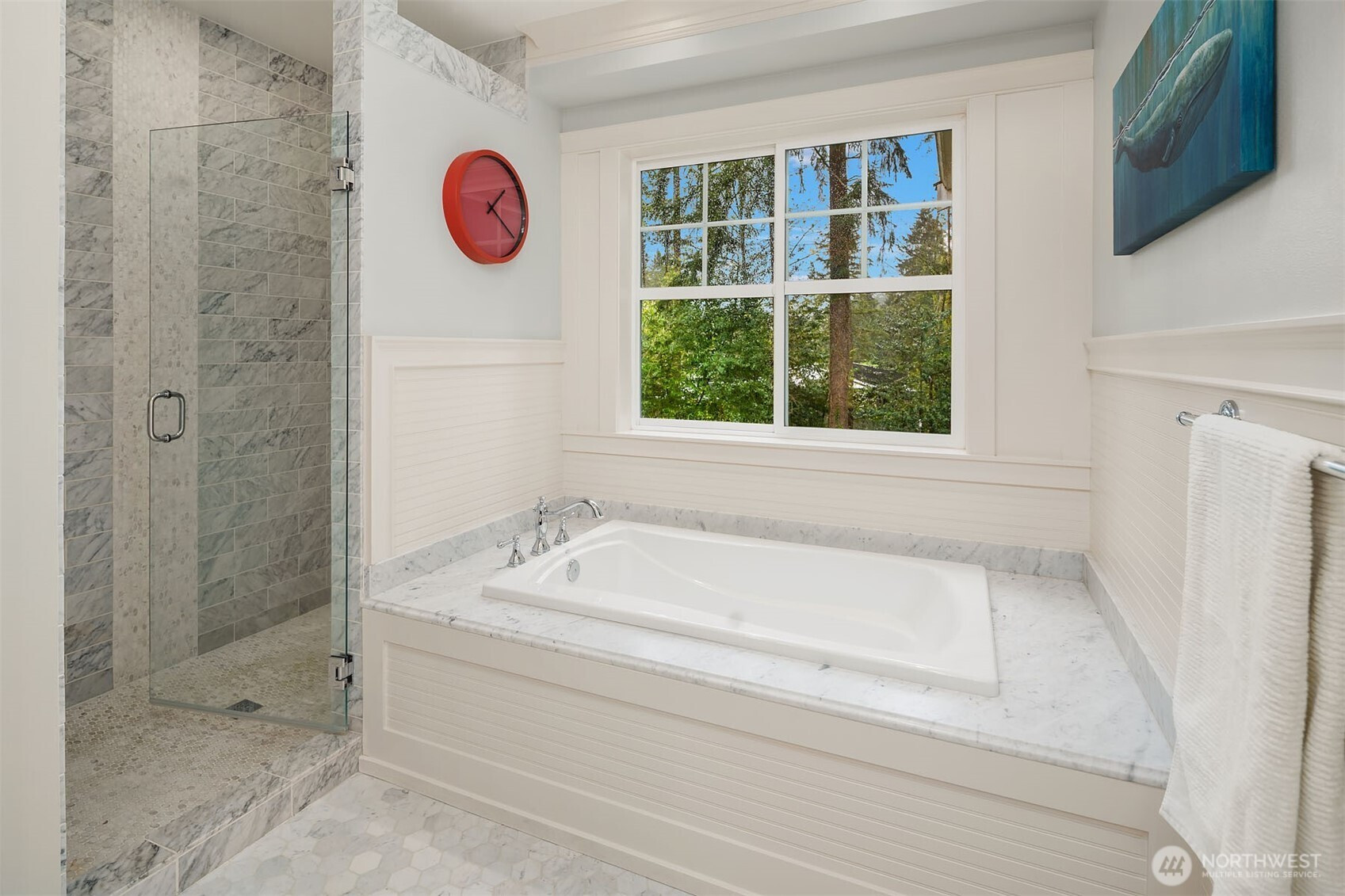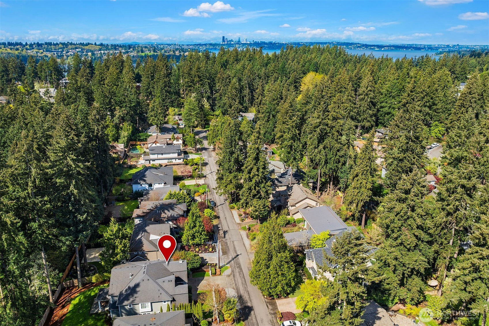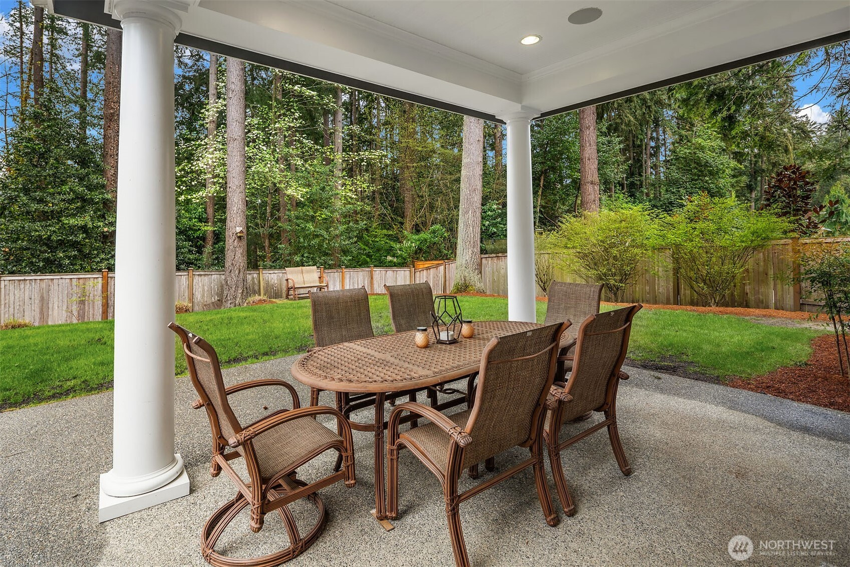 Timeless elegance meets modern comfort in this beautifully crafted one-owner home accented with rich hardwoods, extensive millwork, gorgeous marble, and expansive windows. A welcoming covered front porch opens to a grand rotunda entry highlighted by a stunning bridal staircase. The masterful kitchen is generous in size and functionality with premium appliances, walk-in pantry, an impressive island with breakfast bar, and a slider to the covered patio. Open to the kitchen, the inviting family room showcases a cozy gas fireplace, custom built-ins, dramatic 2-story box-beam ceilings, and clerestory windows that flood the space with natural light. Enjoy formal and casual dining options ideal for both elegant gatherings and everyday living. The main floor den offers flexibility with French doors, built-ins and a closet—a comfortable home office or guest space. Upstairs, the primary suite offers vaulted ceilings, fireplace, luxurious 5-piece bath, and a walk-in closet. 2 additional storybook bedrooms share a Jack-and-Jill bathroom, and the 4th bedroom features a continental bath. The spacious bonus/media room adds versatility and provides the perfect get-away. The gorgeous setting with southern exposure features landscaped garden beds, a charming white picket fence, and a private fenced yard with a covered patio and built-in speakers for optimal outdoor entertaining. The desirable location is just blocks to neighborhood parks, Enatai Elem and minutes to downtown Bellevue and I-90.