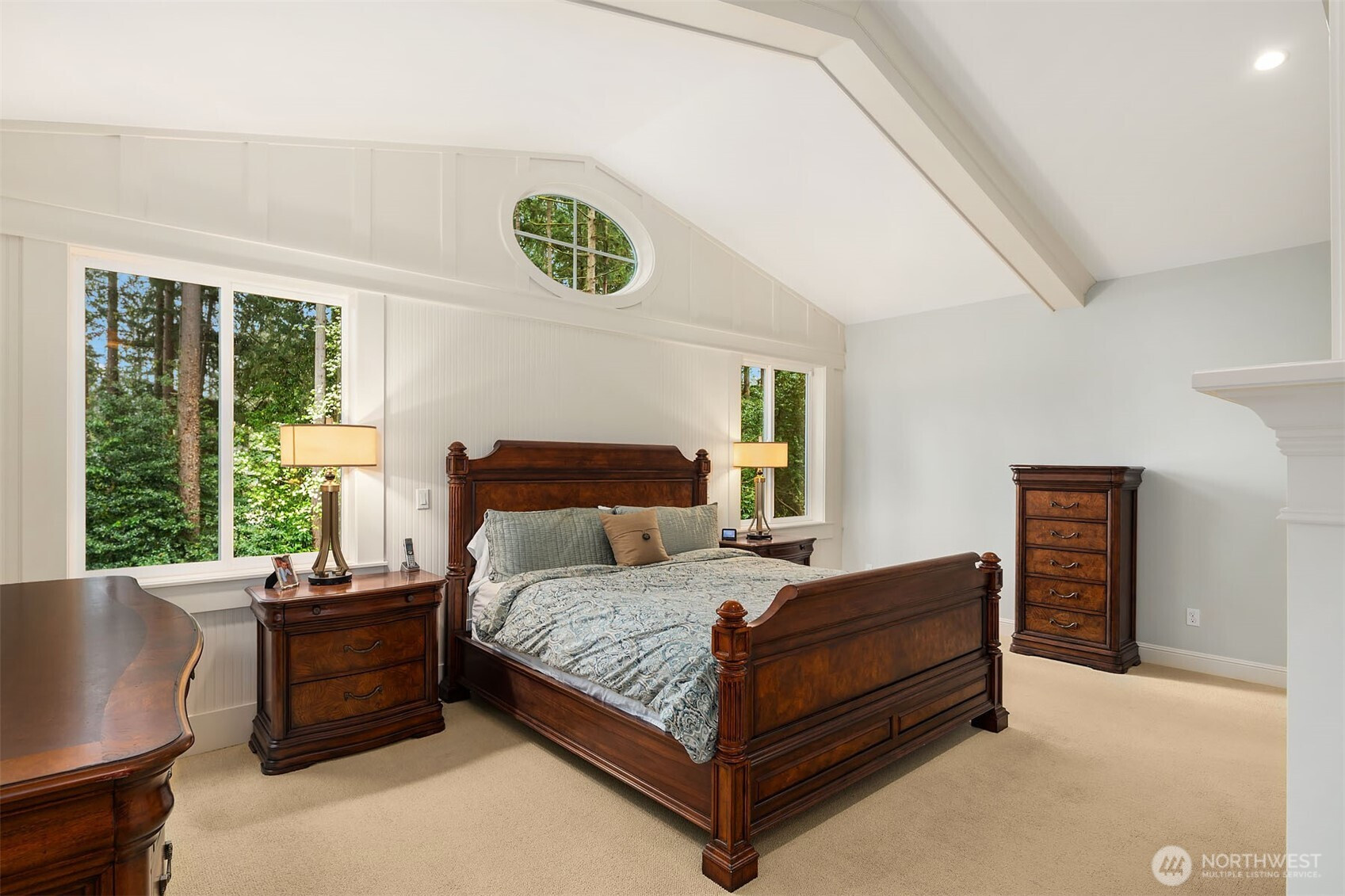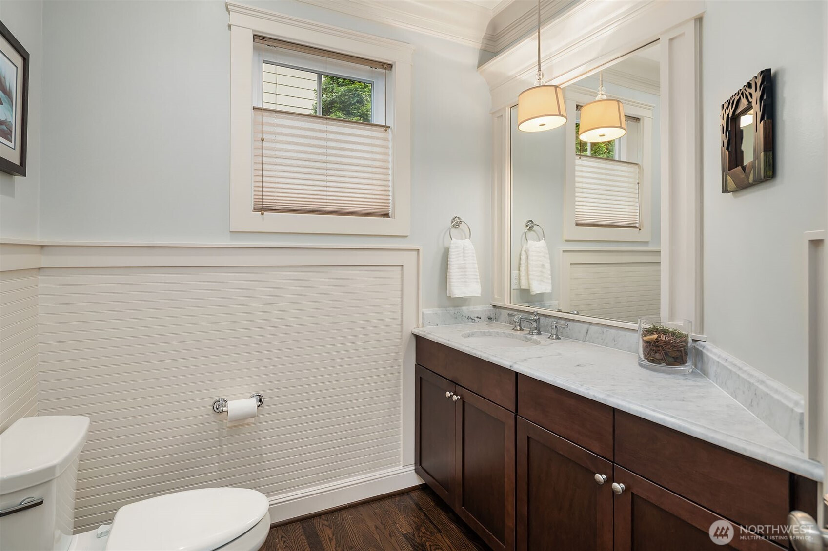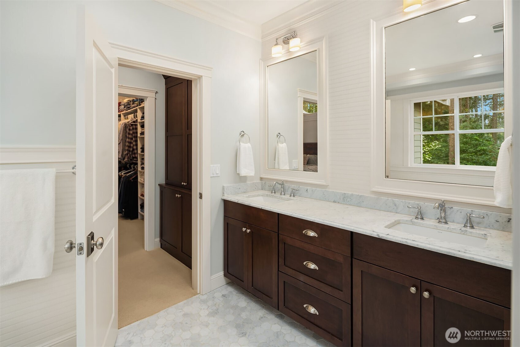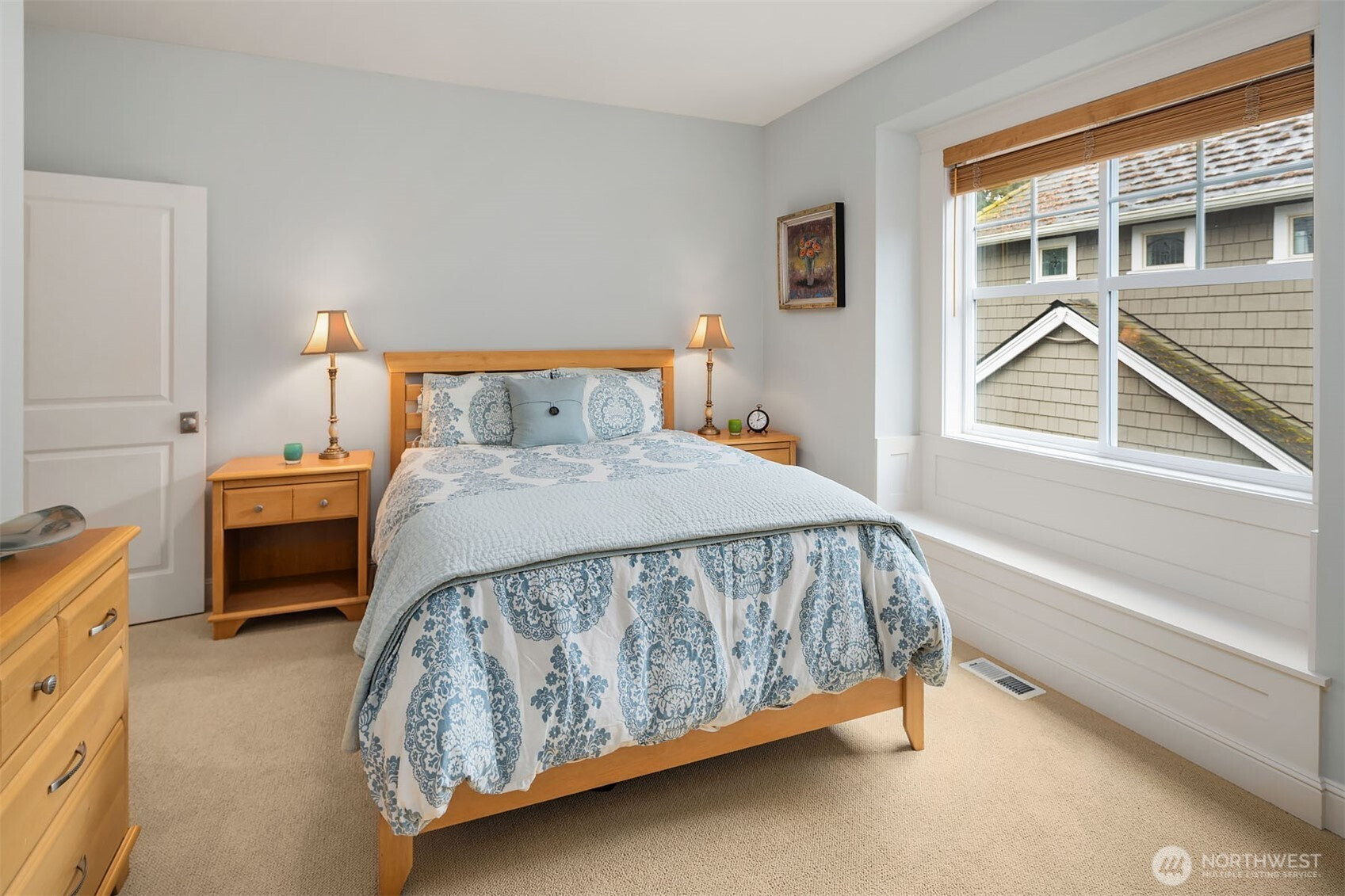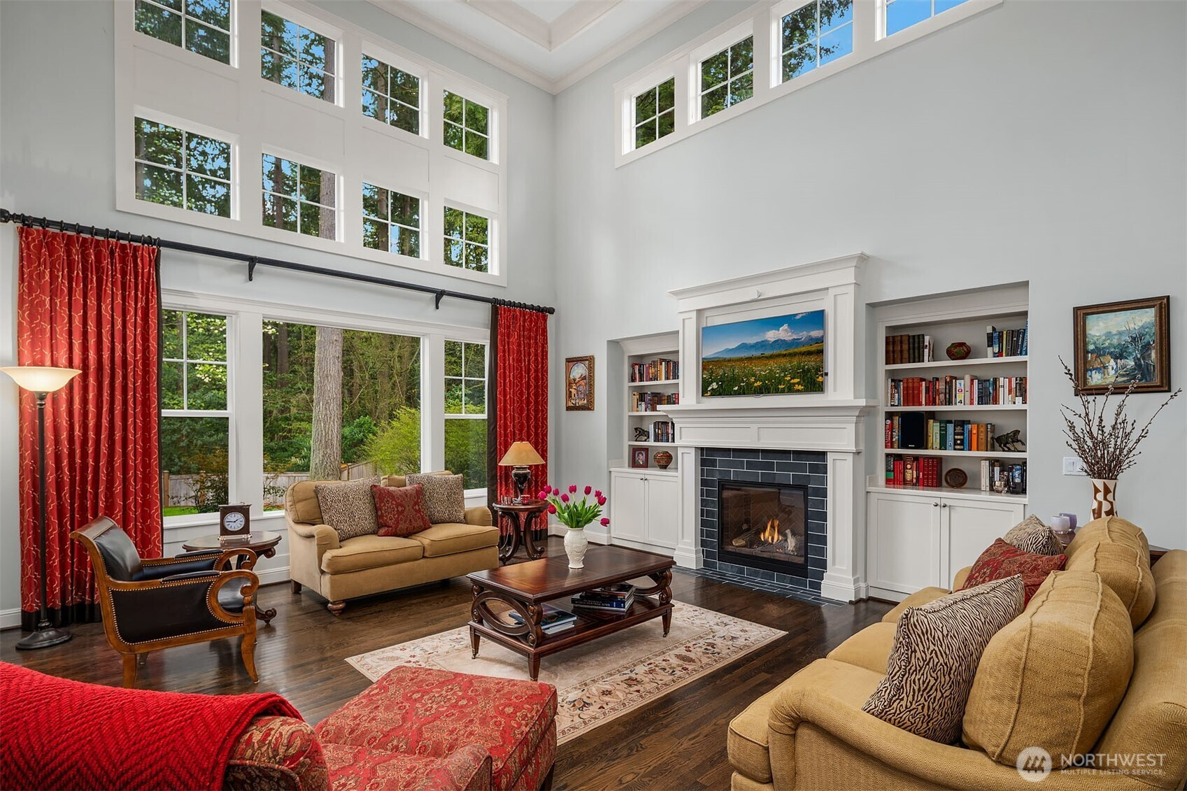 Timeless elegance meets modern comfort in this beautifully crafted one-owner home accented with rich hardwoods, extensive millwork, gorgeous marble, and expansive windows. A welcoming covered front porch opens to a grand rotunda entry highlighted by a stunning bridal staircase. The masterful kitchen is generous in size and functionality with premium appliances, walk-in pantry, an impressive island with breakfast bar, and a slider to the covered patio. Open to the kitchen, the inviting family room showcases a cozy gas fireplace, custom built-ins, dramatic 2-story box-beam ceilings, and clerestory windows that flood the space with natural light. Enjoy formal and casual dining options ideal for both elegant gatherings and everyday living. The main floor den offers flexibility with French doors, built-ins and a closet—a comfortable home office or guest space. Upstairs, the primary suite offers vaulted ceilings, fireplace, luxurious 5-piece bath, and a walk-in closet. 2 additional storybook bedrooms share a Jack-and-Jill bathroom, and the 4th bedroom features a continental bath. The spacious bonus/media room adds versatility and provides the perfect get-away. The gorgeous setting with southern exposure features landscaped garden beds, a charming white picket fence, and a private fenced yard with a covered patio and built-in speakers for optimal outdoor entertaining. The desirable location is just blocks to neighborhood parks, Enatai Elem and minutes to downtown Bellevue and I-90.