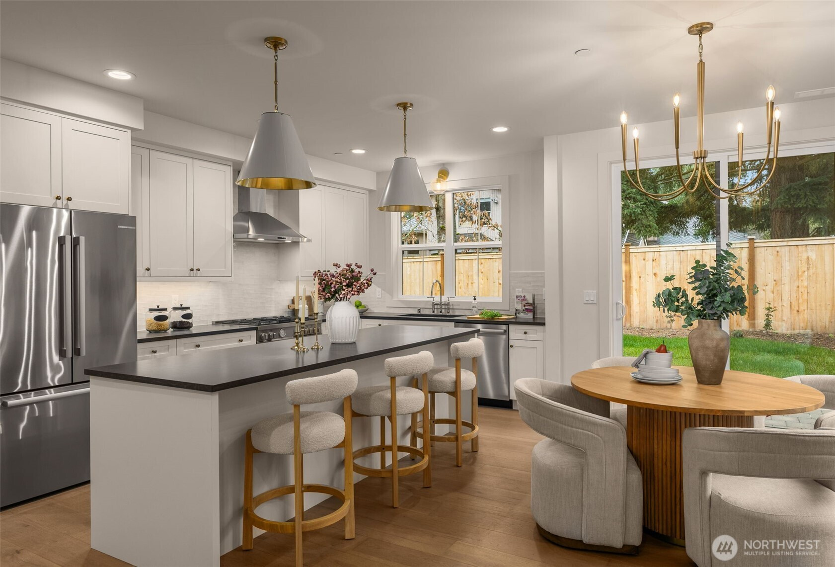 Gerry Homes proudly presents a thoughtfully designed new construction single family home blending timeless craftsmanship with modern livability in the heart of Kirkland. This beautifully appointed home offers an ideal floor plan with elegant finishes and intentional spaces throughout. The main level features an open concept living, dining, and kitchen area designed for both everyday comfort and entertaining. The kitchen is anchored by a large island, ample cabinetry, walk-in pantry, and a premium appliance package featuring Bertazzoni Italia, Bosch, and Samsung, flowing effortlessly into the living area with a cozy fireplace. Step outside to the private patio; perfect for relaxing or hosting guests. A charming covered front porch, powder room, and direct access to the attached garage add both style and convenience. Upstairs, the serene primary suite is a true retreat featuring a spa-inspired bath (wired for tub lights) with dual vanities, soaking tub, walk-in shower, and a generous walk-in closet. Two additional bedrooms, a full bath, and an upstairs laundry room provide flexibility for today’s lifestyle.The home offers exceptional parking with two garage spaces, one attached and one detached, plus driveway and off-street parking. Ideally located near Carillon Point, parks, waterfront/marina access, dining, and top-rated Lake Washington Offering a 1% temporary rate buydown through the preferred lender, Loan Depot.