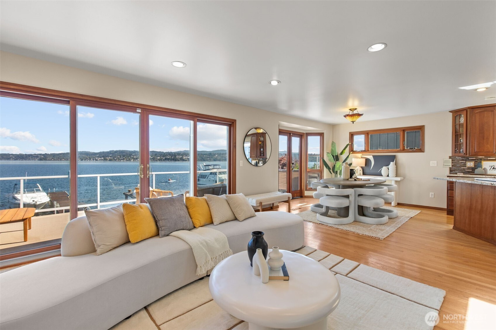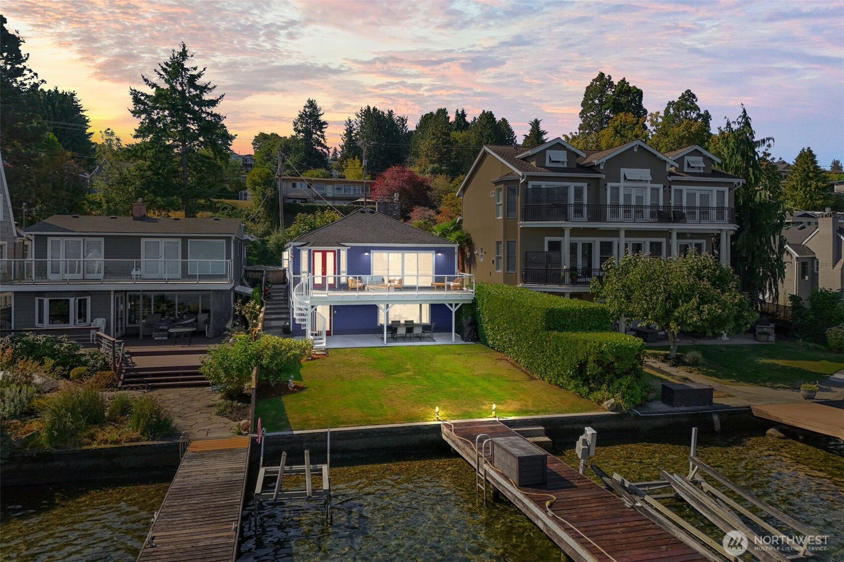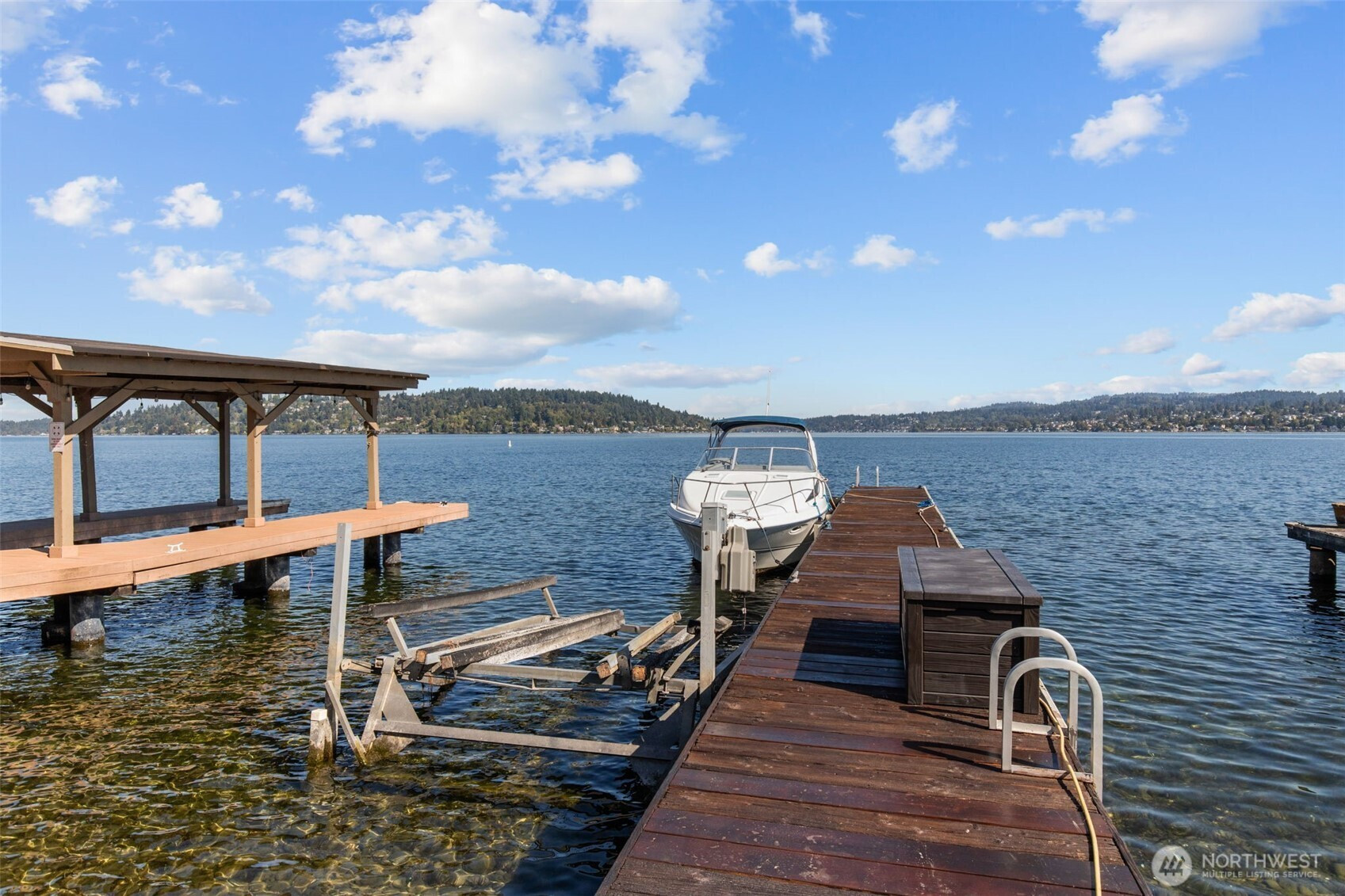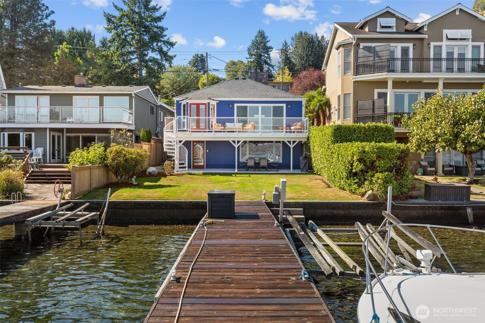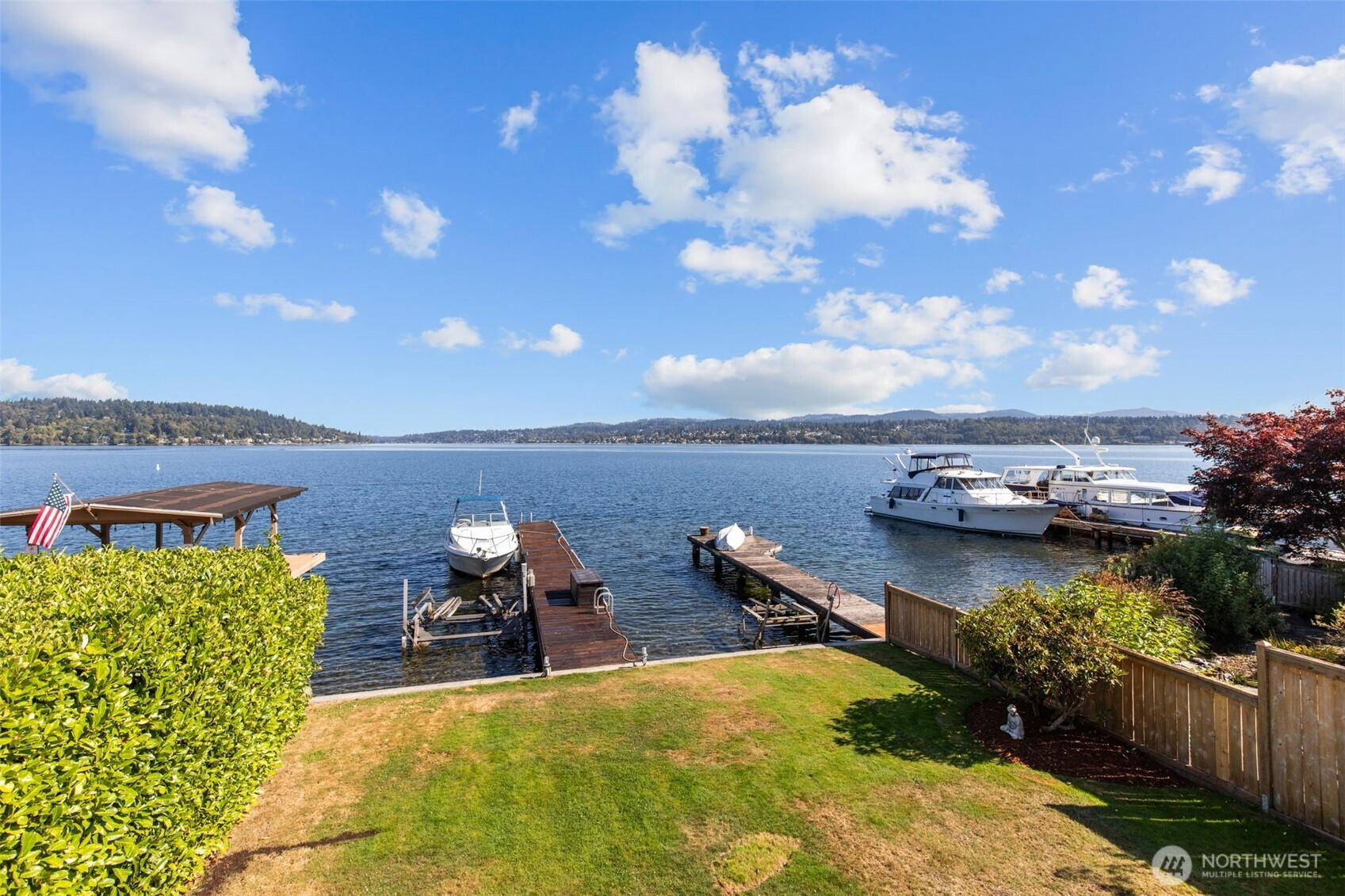 Experience the ultimate lakefront lifestyle with 40’ of prime Lake Washington waterfront! This low-bank property offers moorage, dock, and boat slip. Take in stunning views of the lake, mountains, and city from this beautifully finished home. A large deck creates the perfect space for entertaining. The main floor boasts a great room with kitchen, dining, and living areas, featuring oak hardwood floors and cherry cabinets. The primary suite includes an en-suite bath with dual shower and two-person jetted tub. The lower-level “Lodge” style family room highlights a striking river stone fireplace. Nestled on a quiet private lane, this home combines serenity, comfort, and unmatched waterfront living.