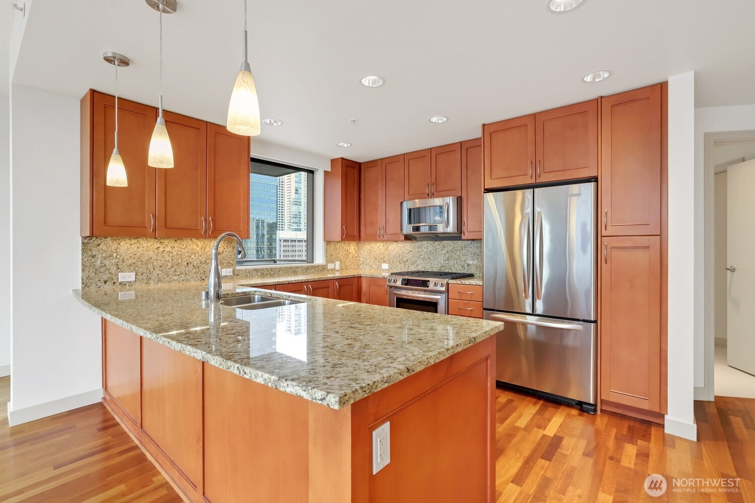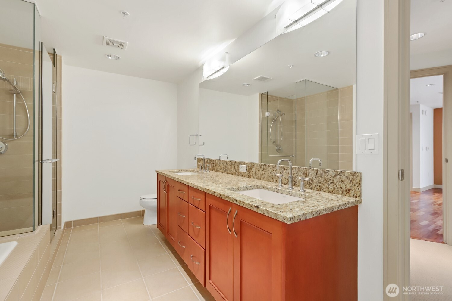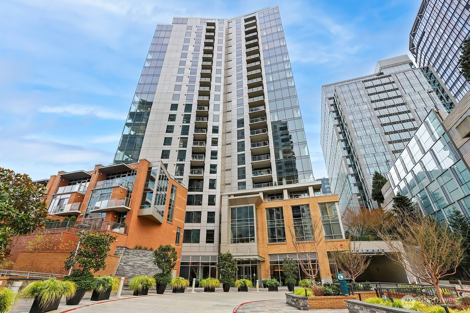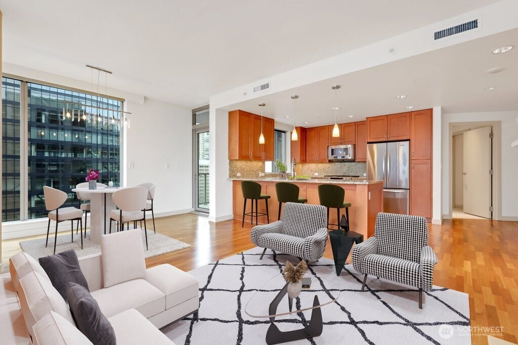 Luxury urban lifestyle awaits in the vibrant core of Downtown Bellevue. This 15th floor, 2 bed 2 bath SE facing corner residence boasts a spacious balcony, accessible from the dining room and primary suite. Floor-to-ceiling glass walls frame breathtaking city lights and Cascade mountain vistas. The open layout features rich hardwoods, slab granite counters, a gas FP, and automated window shades in the living and dining rooms. 2 secured parking spaces on P3 plus a storage unit on P2. Washington Square is ideally positioned just one block from Bellevue Square Mall. Resort-style amenities include a state-of-the-art fitness center, spa, owners lounge, game room, and concierge services. Steps from the Metro Transit Center. Monthly HOA is $1,420.36 including water/garbage/gas. The parking fee is $94.97/month for the 2 stalls and the sewer charge is $71.55/month.