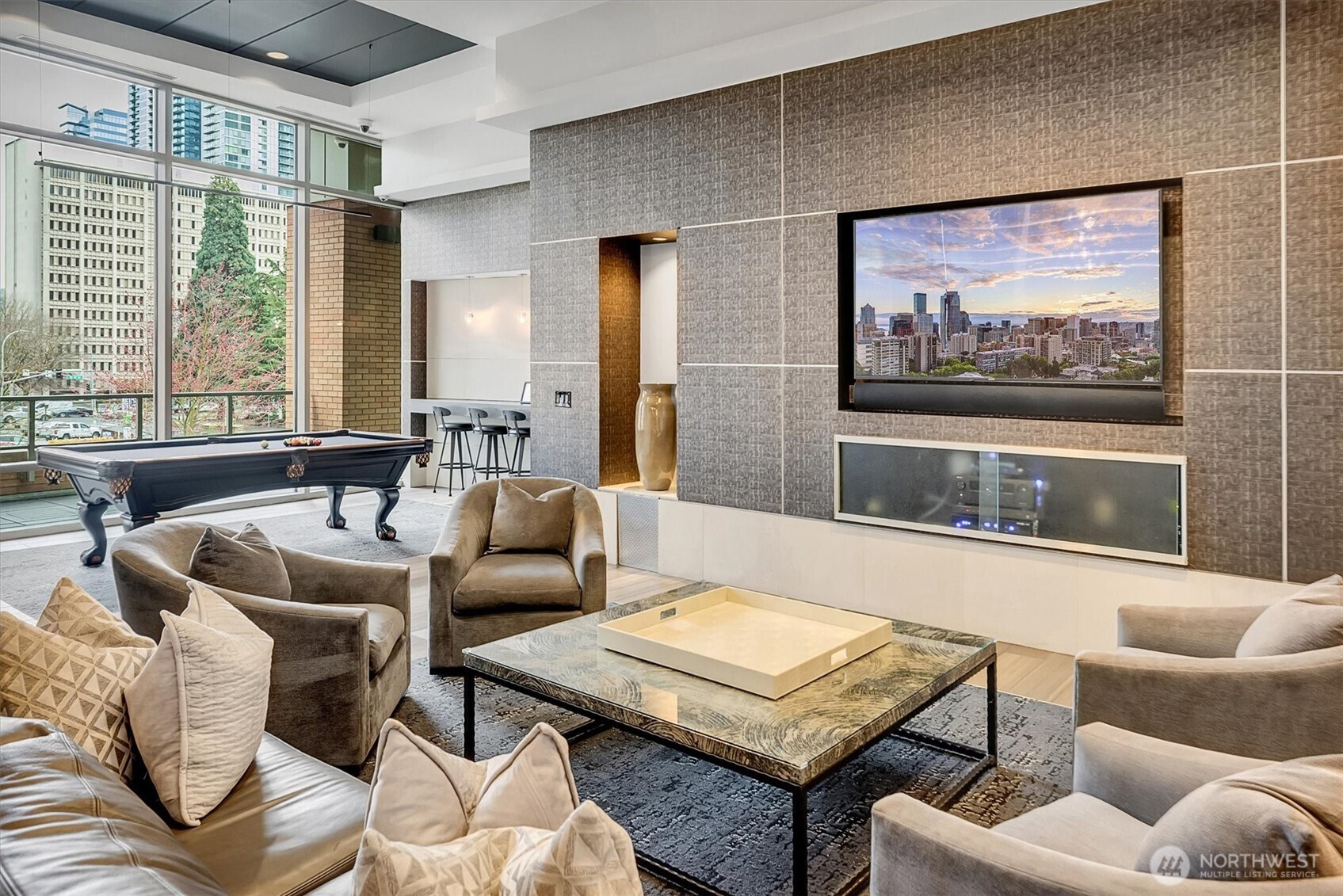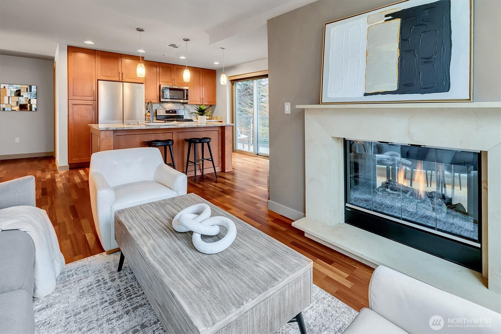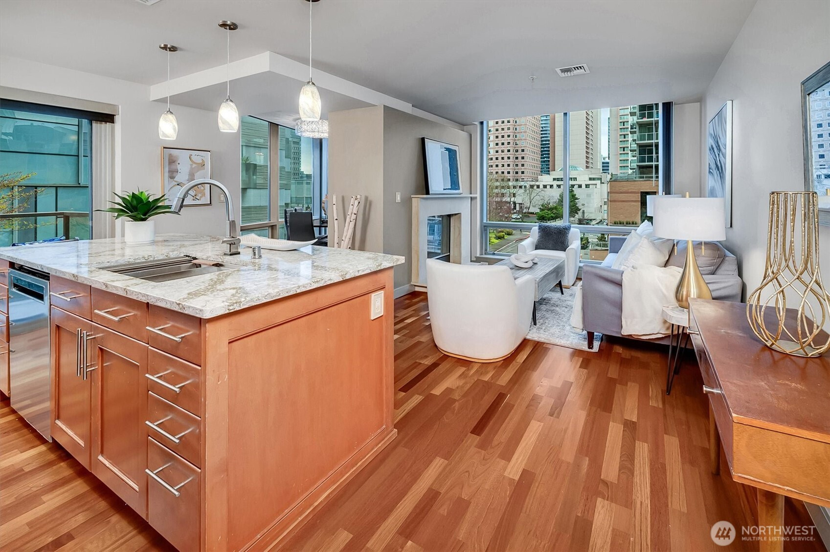 Experience the pinnacle of urban sophistication in this stunning corner residence at Washington Square! Freshly reimagined with quality upgrades and a designer 3-tone neutral palette. This home features a imported hardwoods, cozy double-sided gas fireplace and a large private balcony. The culinary center is a masterpiece, boasting Cambria Quartz island/surfaces, KitchenAid appliance suite, and a Delta electronic touch-faucet. Rare "peace of mind" infrastructure includes a brand-new HVAC system, Yale Wi-Fi keyless entry, and an electronic water control valve. The versatile oversized den is guest-ready with a nearly-new Murphy bed and custom privacy blinds. Both baths are meticulously refreshed with premium shower hardware, new mixing valves and stainless steel lines. Massive laundry room offers considerable storage options. 2 side-by-side parking spots and storage unit on the same level. Steps from Amazon, Bellevue Square, and Downtown Park. Residents enjoy a 24-hr concierge, updated fitness facility, spa, sauna and owner’s lounge. The ultimate, tech-forward hub for the those seeking an uncompromising lifestyle! 3rd Parking space available for purchase!