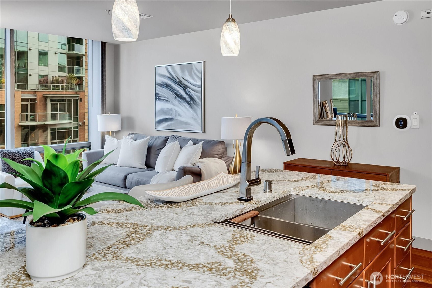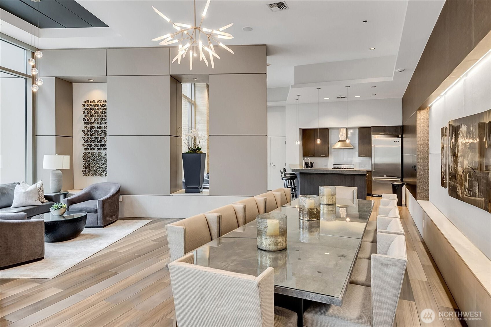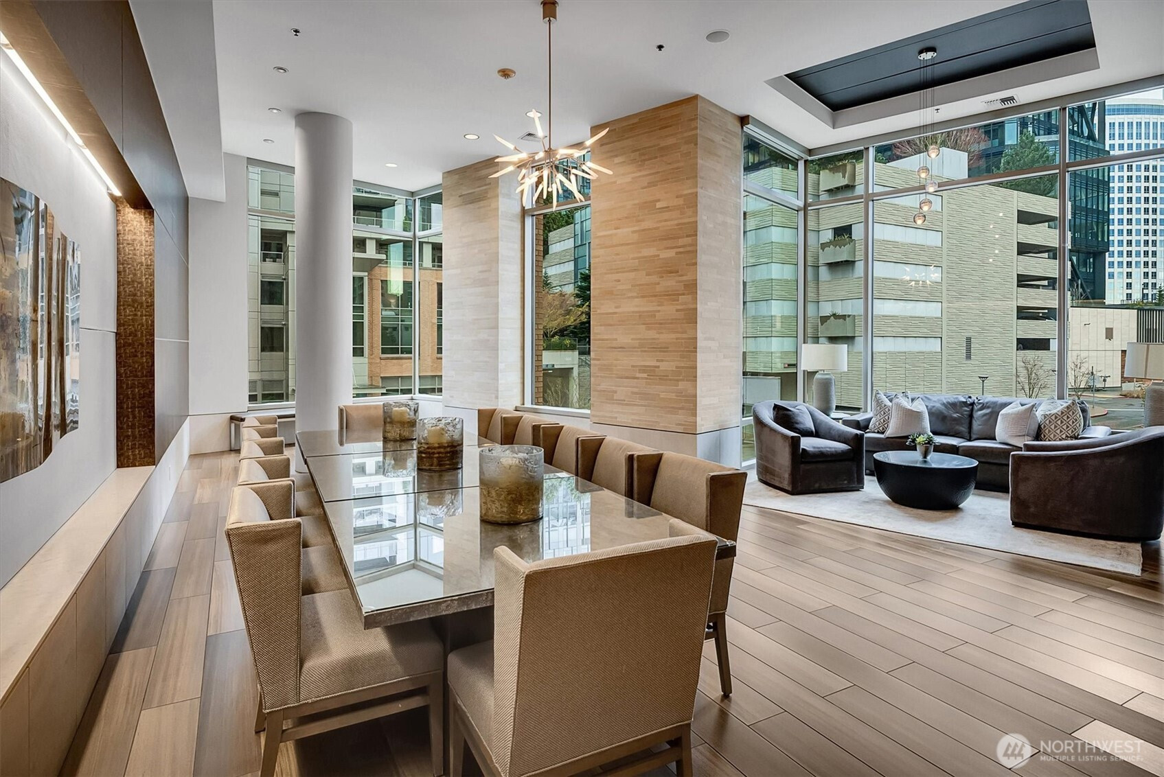 Experience the pinnacle of urban sophistication in this stunning corner residence at Washington Square! Freshly reimagined with quality upgrades and a designer 3-tone neutral palette. This home features a imported hardwoods, cozy double-sided gas fireplace and a large private balcony. The culinary center is a masterpiece, boasting Cambria Quartz island/surfaces, KitchenAid appliance suite, and a Delta electronic touch-faucet. Rare "peace of mind" infrastructure includes a brand-new HVAC system, Yale Wi-Fi keyless entry, and an electronic water control valve. The versatile oversized den is guest-ready with a nearly-new Murphy bed and custom privacy blinds. Both baths are meticulously refreshed with premium shower hardware, new mixing valves and stainless steel lines. Massive laundry room offers considerable storage options. 2 side-by-side parking spots and storage unit on the same level. Steps from Amazon, Bellevue Square, and Downtown Park. Residents enjoy a 24-hr concierge, updated fitness facility, spa, sauna and owner’s lounge. The ultimate, tech-forward hub for the those seeking an uncompromising lifestyle! 3rd Parking space available for purchase!