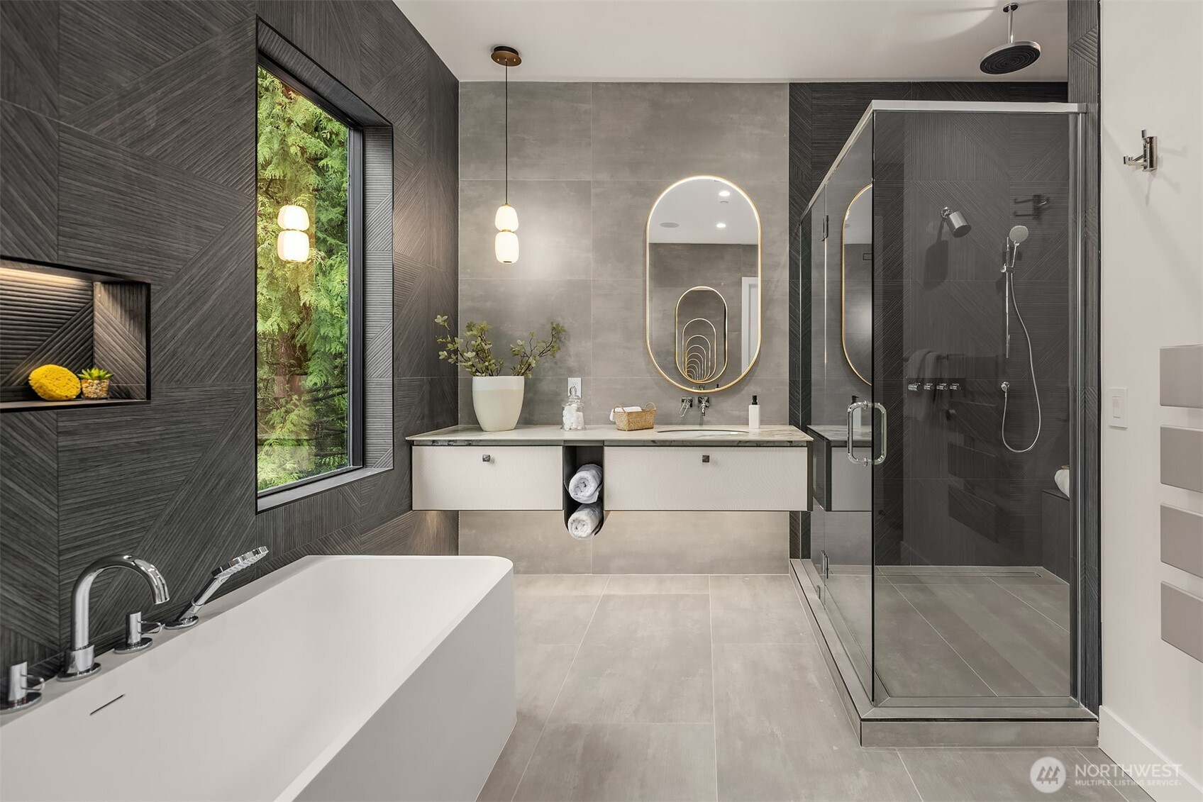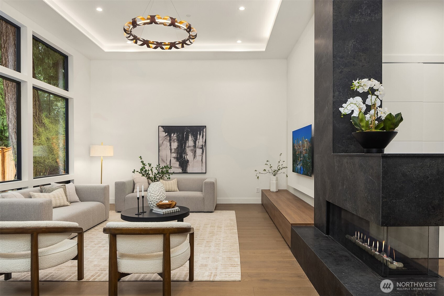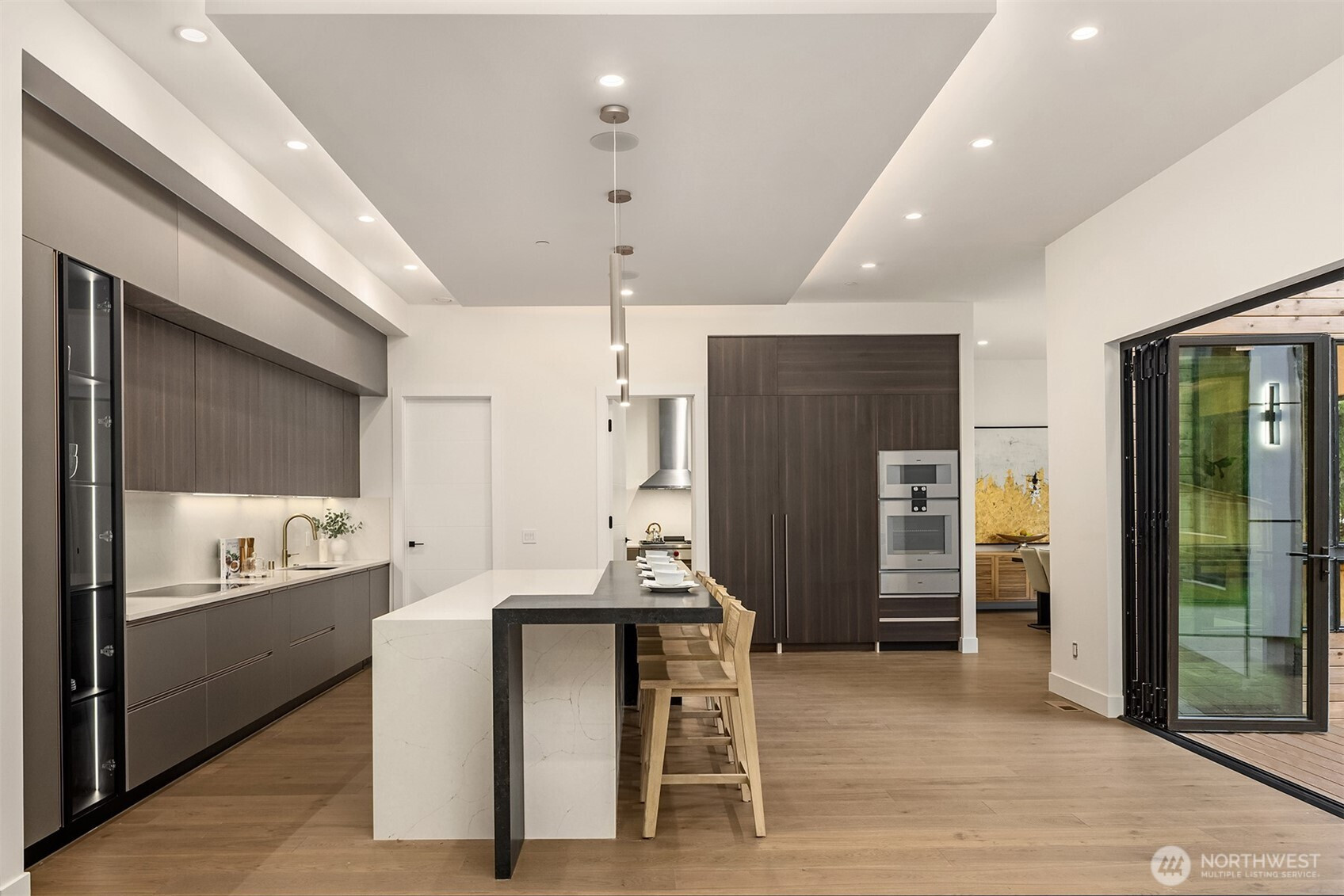 Everything on your dream list lives here. Conceived as the builder's personal residence and designed by the acclaimed Diagonal D Architects, this home is a rare union of inspired design and flawless function. A custom pivot door welcomes you into a residence that immediately impresses — a sculptural staircase with wood treads and glass handrail draws the eye upward, while the expansive great room opens seamlessly to a private backyard. Two kitchens define the culinary experience. The primary kitchen showcases rich Italian walnut cabinetry, wide-plank white oak floors, honed Caesarstone countertops, and a full suite of Gaggenau appliances — including a 60" paneled refrigerator and induction cooktop. The dedicated spice kitchen features a Wolf gas cooktop with hood. The thoughtfully designed main floor includes a bedroom and private office. Upstairs, 4 generous bedrooms and a light-filled flex room offer space for every need. The primary suite is a true retreat — spa-caliber amenities and a showpiece closet. The entertainment level is built for living well: a curated wine cellar, private theater, and custom cedar sauna. Integrated smart home technology and designer lighting adapt to your lifestyle, wherever the day takes you. Outside, a massive deck overlooks a tranquil water feature, with a neighborhood park directly accessible from your backyard. This is not just a home. It's a new standard of luxury living in the heart of Bellevue.
