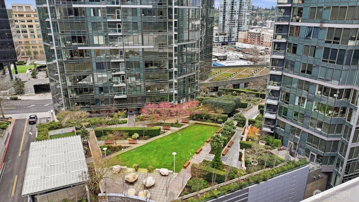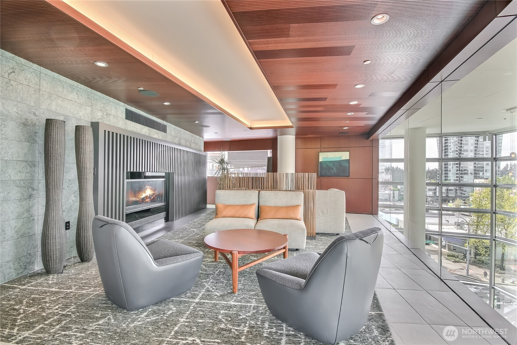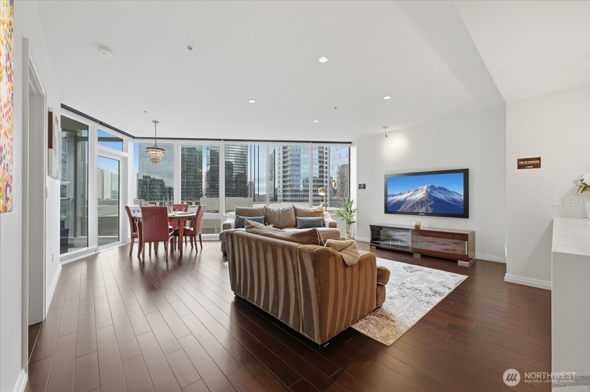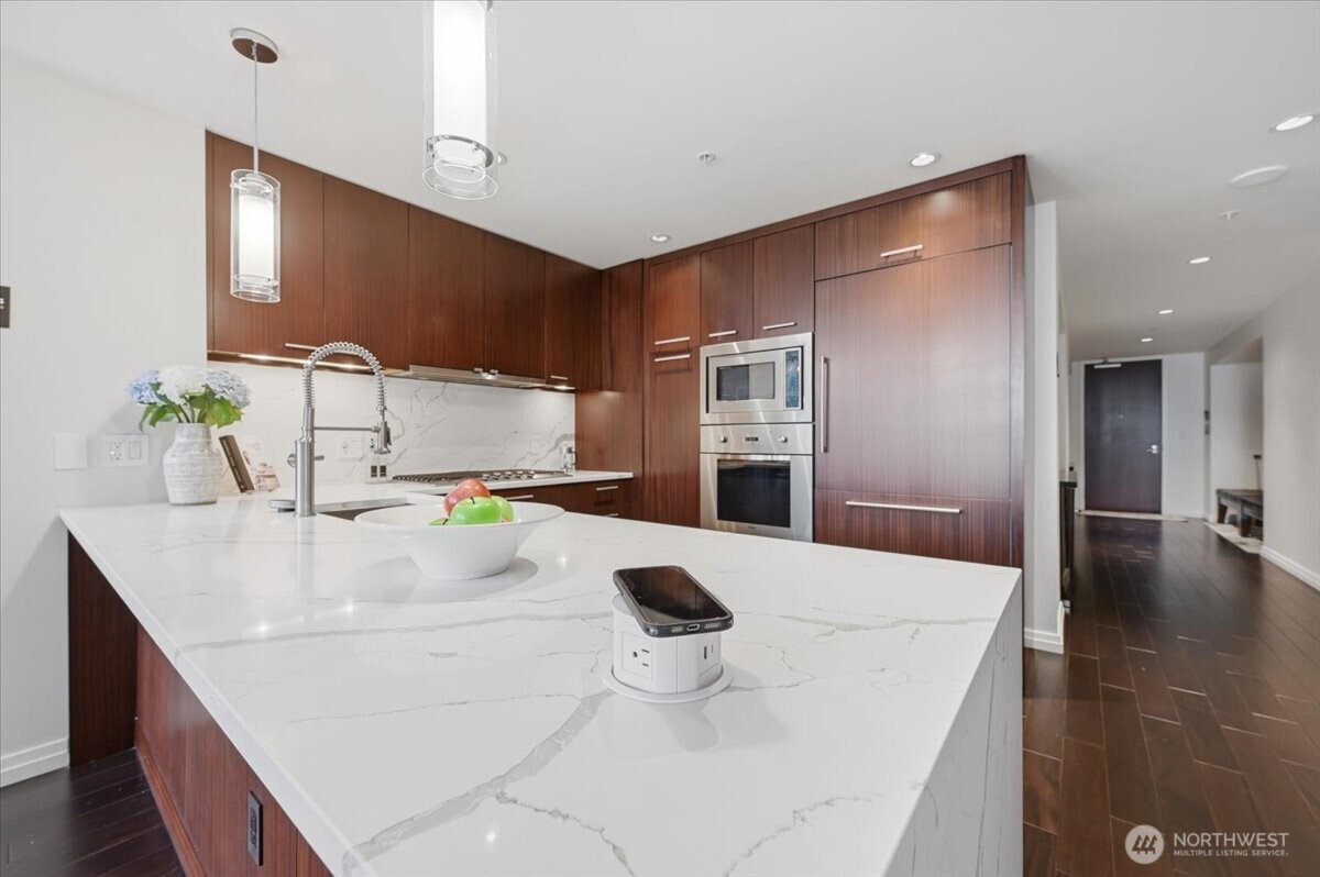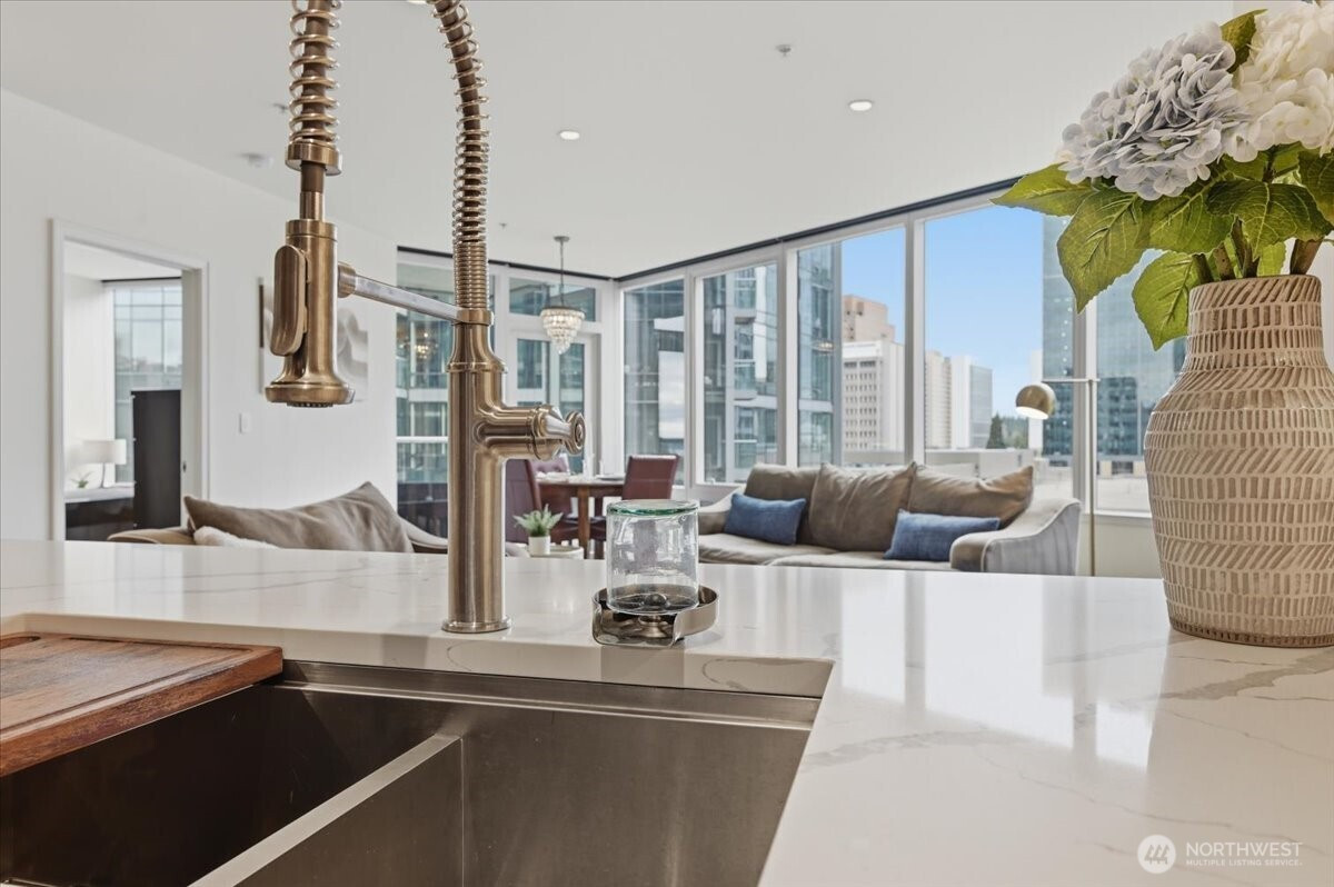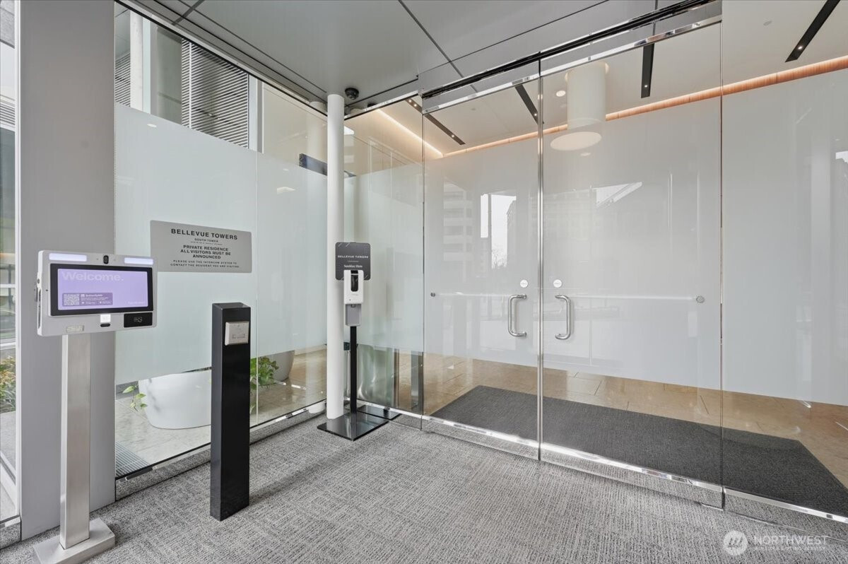 Experience refined urban living in this exceptional Bellevue Towers residence. This spacious 1,354 sq. ft. floor plan features a gallery entry that flows into an open-concept living area—perfect for maintaining positive Qi (energy).Balancing modern luxury and timeless elegance, this residence features sweeping city views and premium finishes throughout for an elevated lifestyle in the heart of downtown. Recently installed gleaming solid hardwood floors and a chef-inspired kitchen with quartz slab countertops and backsplashes, the unique backlit Cristallo stone accents in the custom-built den and bathrooms, creating a sophisticated ambiance. Nine-foot ceilings and abundant natural light highlight the clean architectural lines designed for seamless entertaining. The spacious primary suite accommodates a king-size bed and boasts a walk-in closet and a luxurious ensuite with dual vanities and a walk-in shower. A private deck with a BBQ hookup extends the living space outdoors, while a separate laundry room serves also as additional storage space. This smart home controls automated blinds on all windows, lighting, and a Nest thermostat. For added convenience, the dedicated parking space is ideally located close to the elevator. Residents enjoy world-class amenities: two fitness centers, a spa with a sauna, steam room, and plunge pool, a screening room, and an urban garden with fireplaces. Just steps from Bellevue’s premier dining and shopping, this is where luxury meets location.