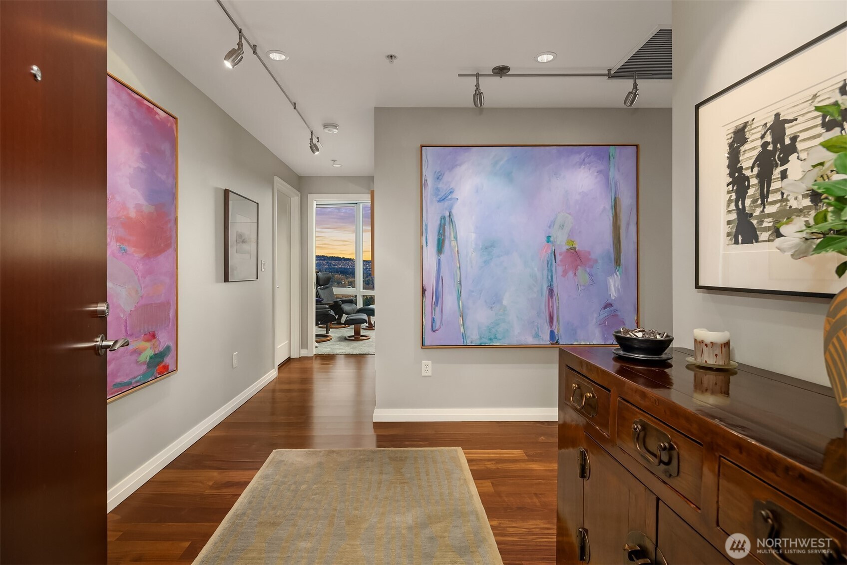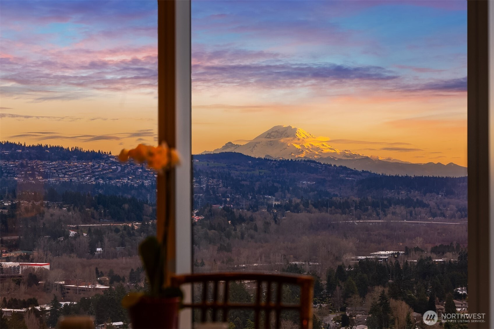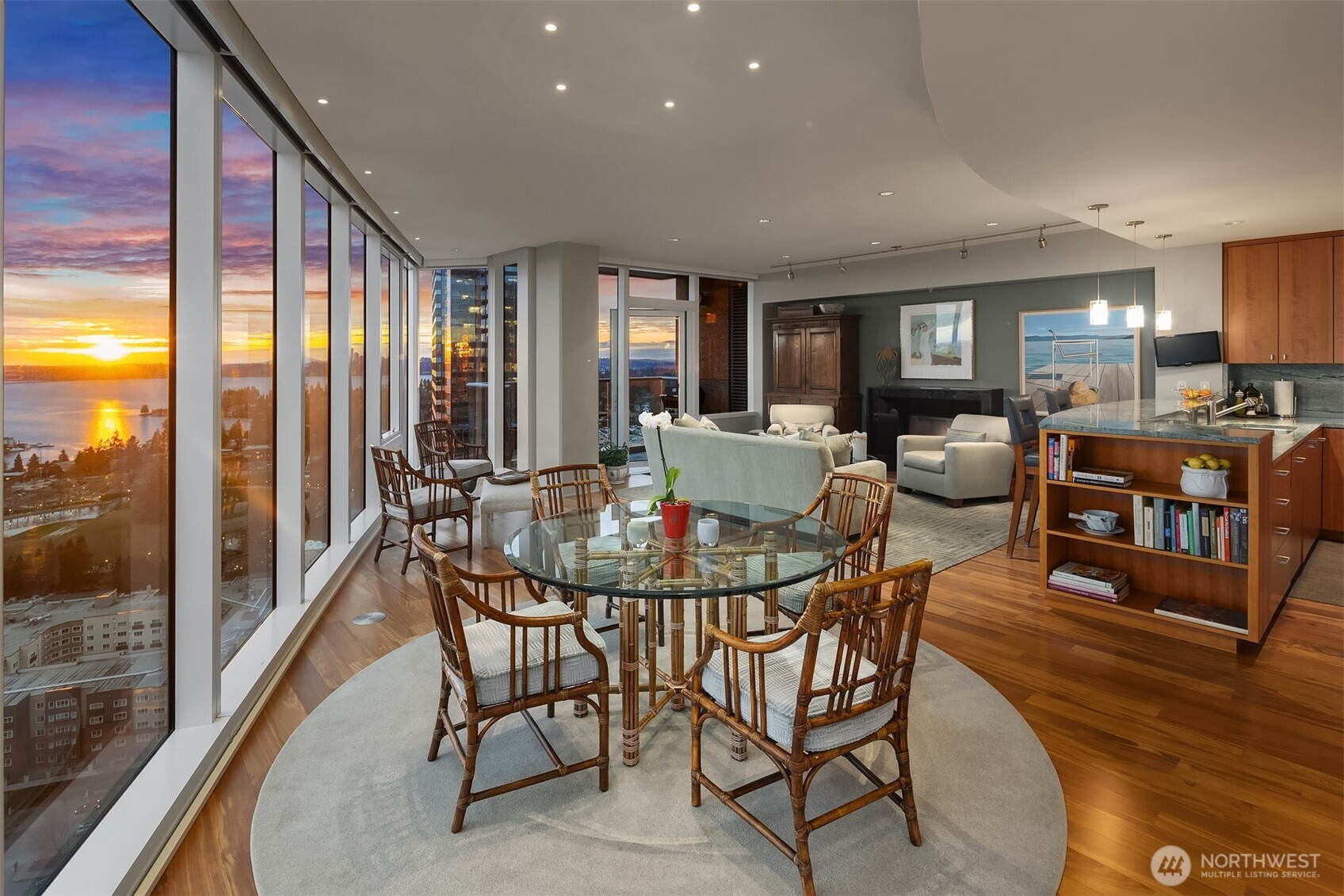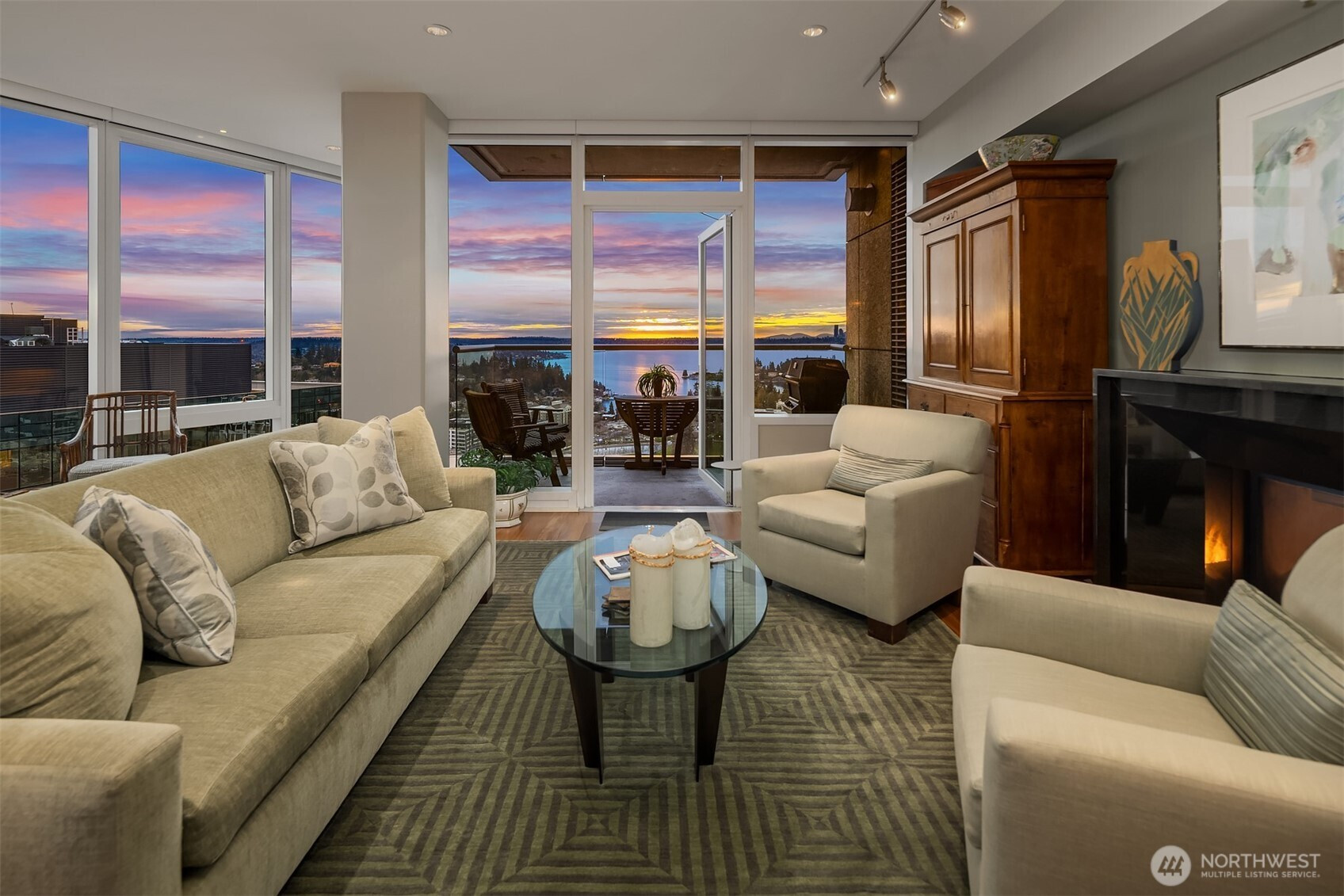 Expansive southwest views. Graciously appointed interiors. Elevated urban living. Home 3016 has it all. This refined residence is centered around a stunning great room featuring a fireplace with custom stone surround and showcasing stunning views of Mt. Rainier, Lake Washington, the Olympics, as well as both downtown Bellevue and Seattle. The gourmet kitchen is beautifully designed with custom cabinetry and bespoke slab stone countertops, ideal for both everyday living and entertaining. The generous primary suite offers a serene retreat with breathtaking Mt. Rainier views and a spa-like five-piece bath. A thoughtfully designed secondary bedroom features custom built-ins, including a wall bed, allowing flexible use as a media room or guest suite. A large home office with two built-in workstations adds exceptional functionality. Additional highlights of the home include 9’ ceilings, custom art lighting, a balcony with gas for grilling, newer HVAC, two side-by-side parking spaces with EV charging, and a large storage unit. LEED Gold–certified Bellevue Towers offers recently remodeled amenities including state-of-the-art fitness rooms, a whirlpool spa with sauna and steam room, dining room with kitchen, community and game rooms, theater, outdoor terraces, a half-acre park, and concierge services. Enjoy the very best of downtown Bellevue at yourdoorstep—world-class shopping, dining, and the iconic Bellevue Downtown Park.