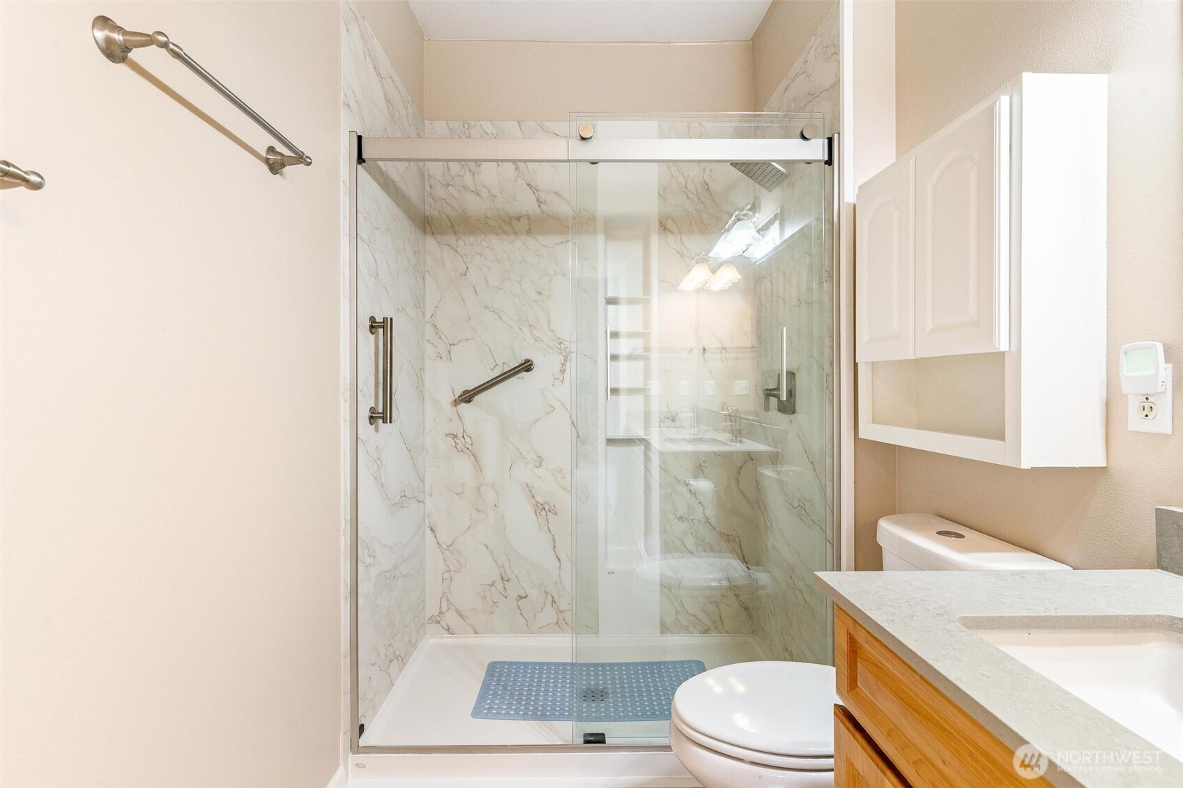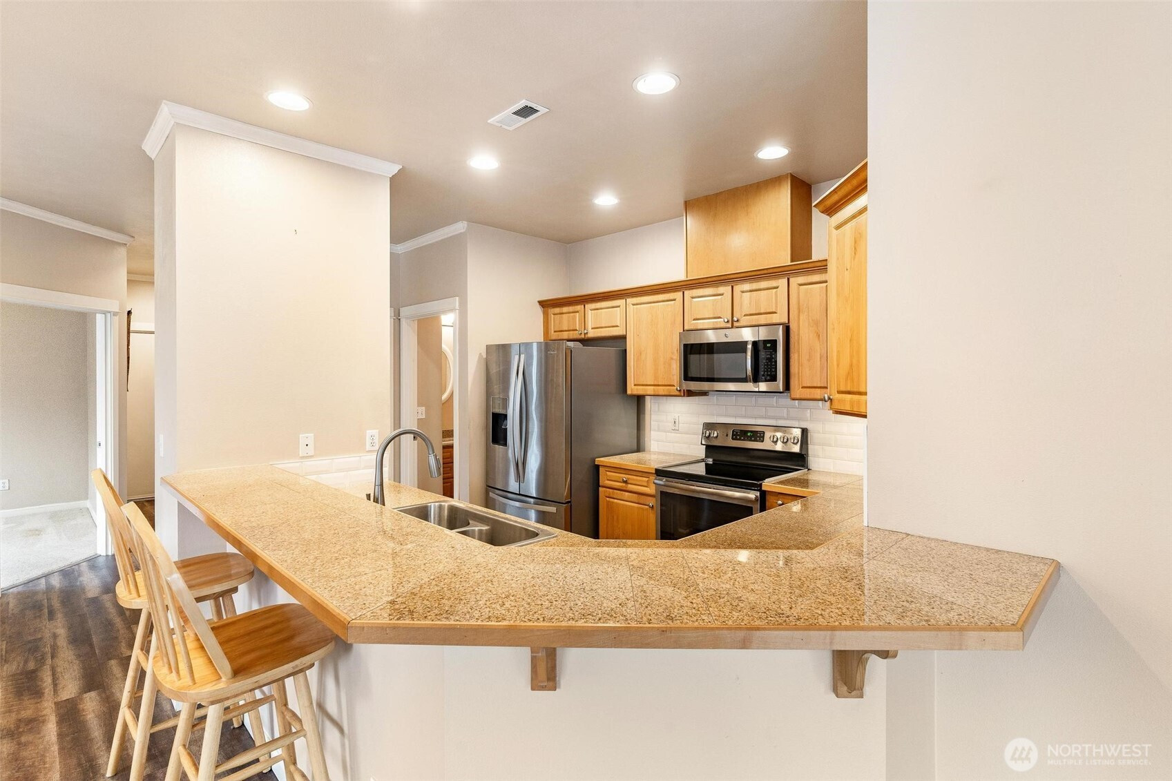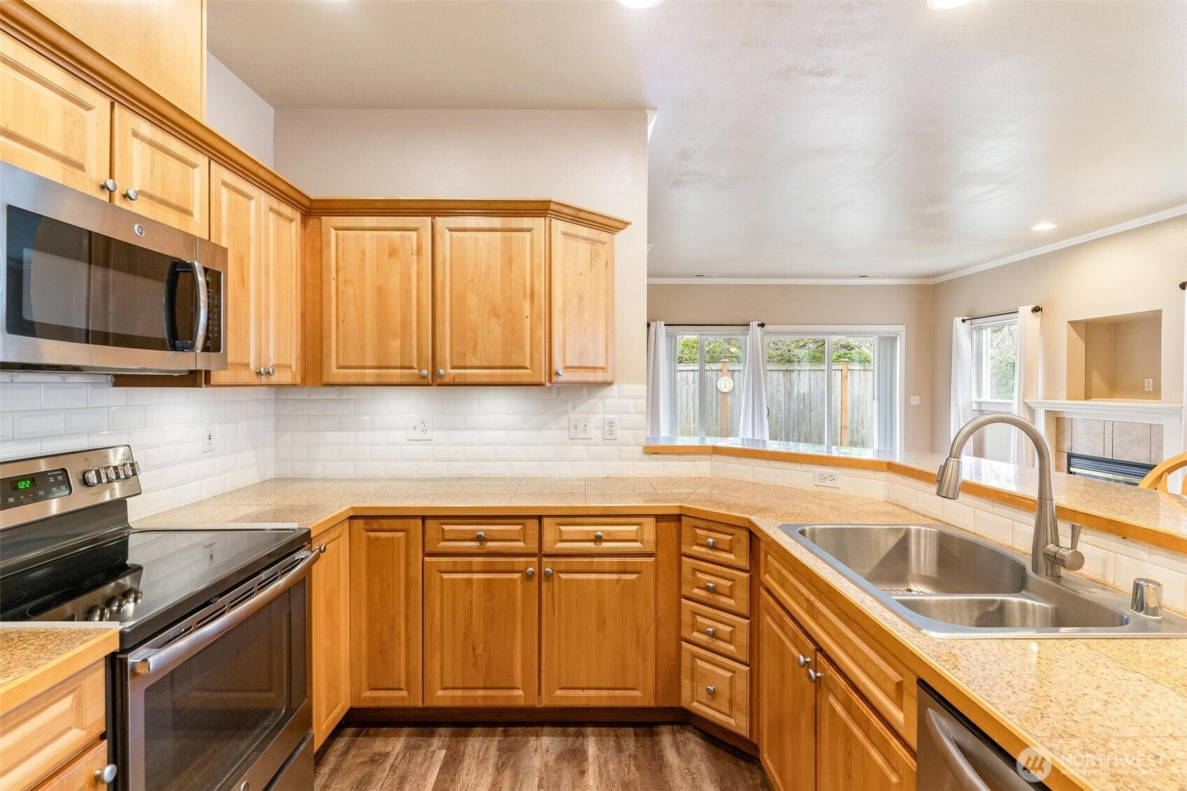 Welcome to the sought-after gated community of Hampton East, offering easy, low-maintenance living in an unbeatable location. This beautifully designed one-level home features three bedrooms, open-concept living, and a cozy gas fireplace that creates a warm and inviting atmosphere. The spacious primary suite offers a private ensuite bath with quartz countertops and a generous shower. Enjoy peaceful mornings or relaxing evenings on the serene back patio, all within a quiet, well-maintained community near the community center and ample visitor parking. An attached two-car garage provides abundant parking and storage. Ideally located just minutes from dining, shopping, Target, Home Depot, East Hill amenities, Lake Meridian, Kent-Meridian High School, and with easy access to HWY 167, this home truly offers comfort, convenience, and effortless living in one exceptional setting.