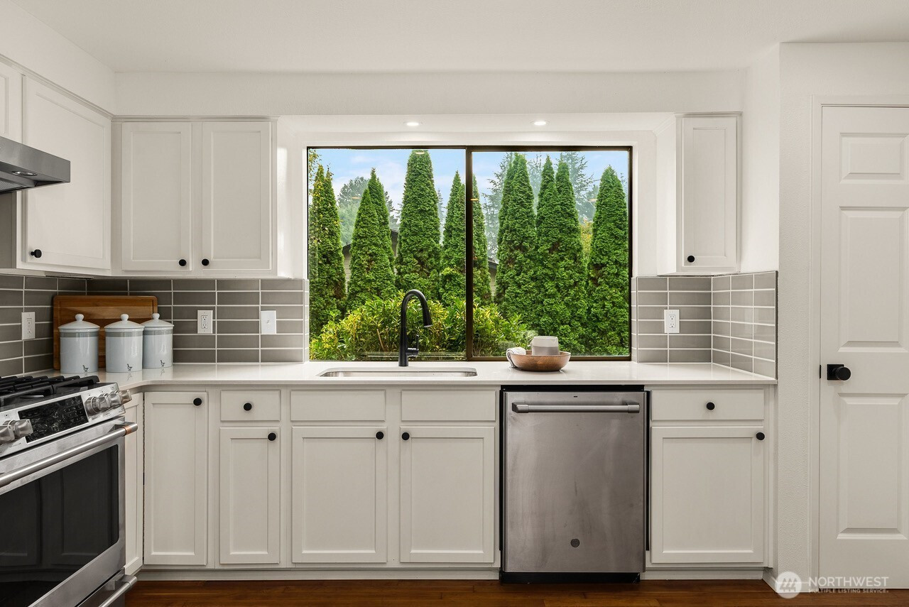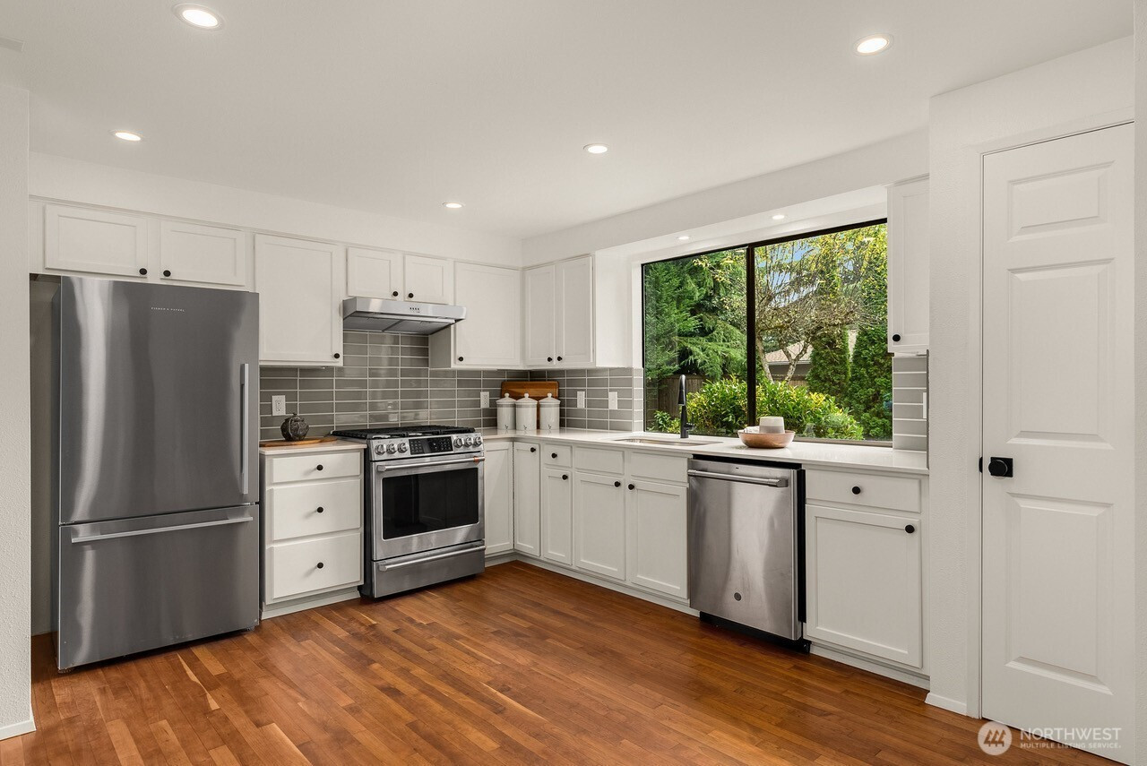 Location, location, location! Enjoy the coveted Houghton lifestyle in this beautifully updated 4-bedroom, 2.5-bath home at 10703 NE 53rd St in Kirkland. Set on a level, private, fully fenced lot, this home offers comfort, style and unbeatable convenience. Just steps to Lake Washington waterfront, Carillon Point, Eastrail, Carillon Woods and shopping including Metropolitan Market. Less than one mile to I-520 and I-405 for quick access to Seattle, Bellevue and Redmond. The 2,680 sq ft interior features stainless steel appliances, quartz countertops, hardwood and clay tile flooring, and spacious living areas perfect for everyday living and entertaining. Quiet dead-end street with Lake Washington views from the street. Located in the highly sought-after Lake Washington School District. Move-in ready and ideally located near parks, dining and waterfront amenities.