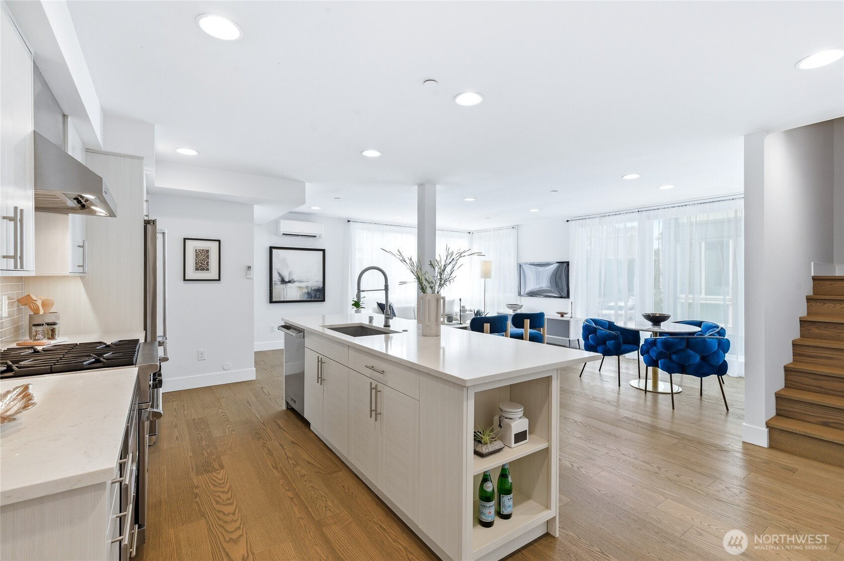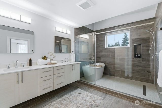 View, Upscale & convenience! Nestled in a serene enclave just steps from downtown, this stunning 3-bedroom+Den corner unit Townhome offers the perfect blend of urban lifestyle and peaceful retreat. 2 car private garage, spectacular views and luxurious amenities. open floor plan, walls of windows & sunlit rooms. A gourmet kitchen featuring high-end Viking appliances, undercabinet lighting, quartz countertops, and sleek modern finishes, all flowing seamlessly into the family and dining spaces—perfectly designed for both everyday living and entertaining. The primary suite is a true sanctuary, Oversized room with a sitting area, and a beautifully remodeled spa-inspired bathroom with heated floors, a soaking tub & tile wall wrapped shower room. The crowning jewel is the sparkling views from private rooftop deck, featuring a gas grill stub and breathtaking 360-degree Seattle & Downtown Bellevue skyline and mountain views, perfect for entertaining or unwinding above the city. Designed for modern living, the home includes smart features, AC, Honeycomb blinds, and a spacious 2 garage, EV charging & additional storage. Well managed HOA with low dues, no rental cap, and walk to top-rated Bellevue schools and major tech hubs, this home meets commuter ‘s dream and phenomenal investment potential. This is more than a cozy home, it’s where your good life begins. Must see!