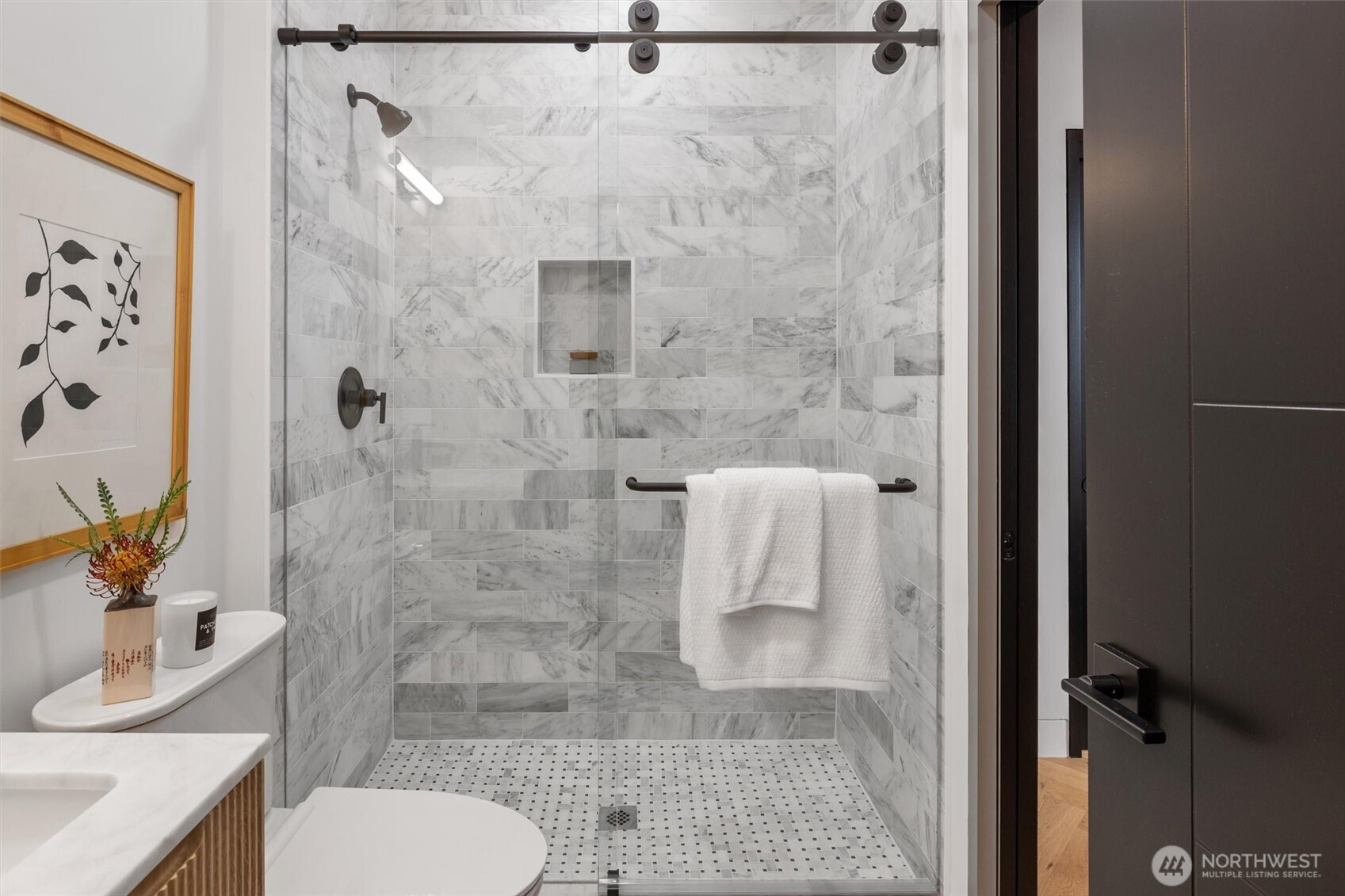 Beautiful new construction by Ava Homes llc. 10731B 17th Ave NE emphasizes high quality craftsmanship designed for modern living. Hidden gem location nestled between Maple Leaf and Victory Heights neighborhoods. A modest two-story home surprises once inside. A spacious floorplan with 2165 square feet of well designed finished living space. Main floor features luxury appointed kitchen with Nova Cucina cabinetry and Bianco Carrera countertops imported from Italy. Open concept design invites gatherings and provides easy access to a wrap around deck. Main floor includes an office/den and a 3/4 bath. Second floor offers a gracious primary suite with vaulted ceilings. An additional two bedrooms and full bath and a loft bonus room complete the second level. A truly wonderful masterpiece by Ava Homes with solid core walnut doors featuring frameless hardware and euro style hinges from noted Italian manufacturer Barausse. Bathrooms appointed with Puntotre cabinetry and Terrazzo tile flooring imported from Italy. Oversized two-car attached garage with EV charging. A surface parking stall provides for a dedicated third parking spot. Convenient to Northgate, Maple Leaf, Hazel Wolf K-8 STEM school, I-5 and Northgate Light Rail. Tremendous value, a must see!! This one may not last long.