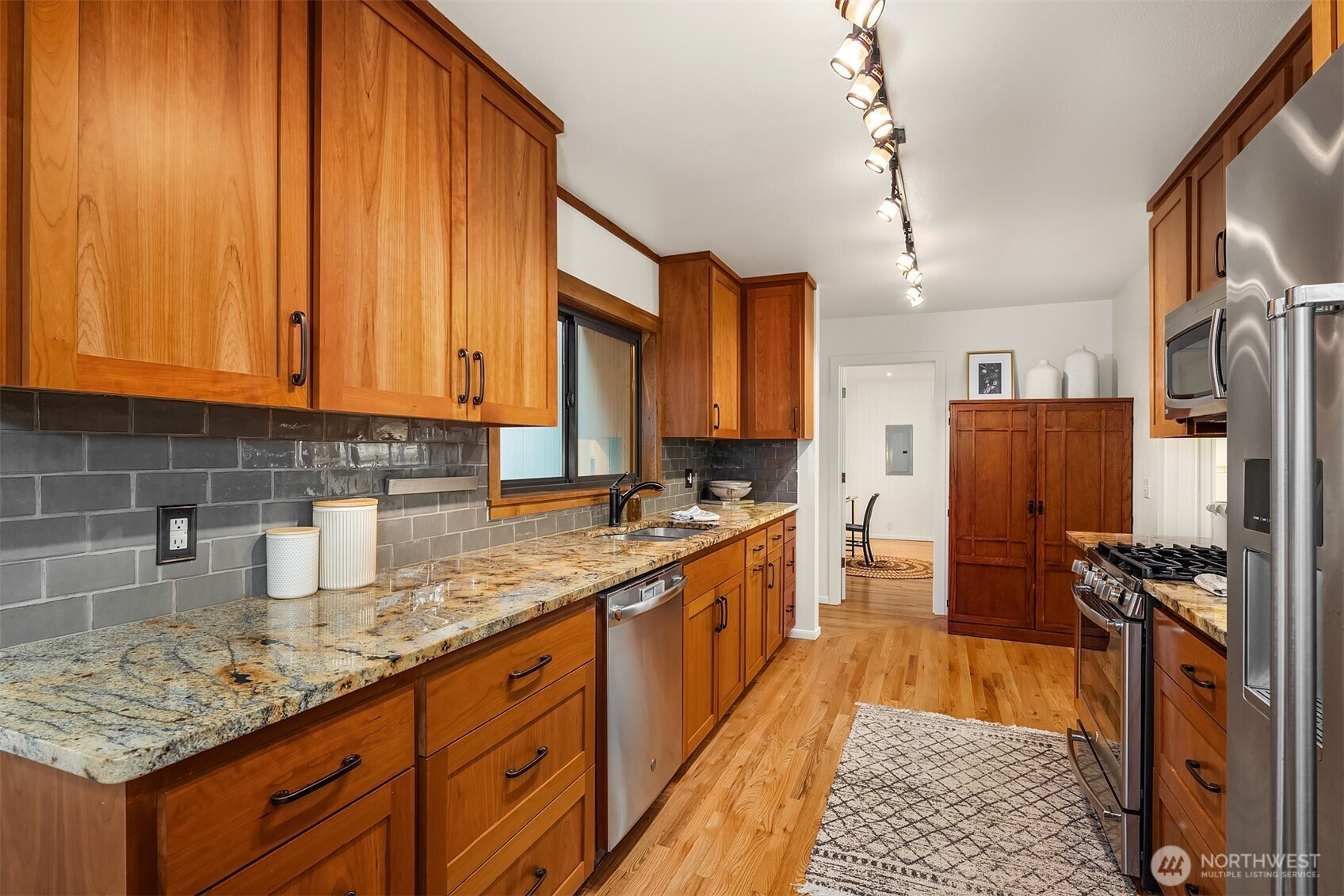 This is it! Ideal floorplan with generously sized rooms, unbeatable location that’s only getting better, loads of natural light, and significant structural and system upgrades. Host a dance party in the huge living room, or have a snuggly evening gathered around the fireplace. Get creative in a kitchen worthy of your favorite cooking show. Have everyone over for a Bunco tournament in the GIANT main floor rec room (big enough for a regulation sized pool table). With three bedrooms, including a tucked away primary suite, all on the main, plus a private deck off of the dining room, this large home lives even larger and we haven’t even gotten to the lower level. Downstairs is currently set up as a short-term rental, with its own separate entrance, laundry, kitchen, living room,bedroom and bathroom, BUT it is easily incorporated into the main living space. The front gardens feature native plantings and attract many birds, while the back deck and patio create areas for relaxation, stargazing, and entertaining. The home has radiant in-floor heating and a tankless water heater. Unbelievable location, close to Northgate Light Rail Station, the library, post office, shopping, restaurants, Kraken Community Iceplex, and, soon, Northgate Town Square, a vibrant community hub.