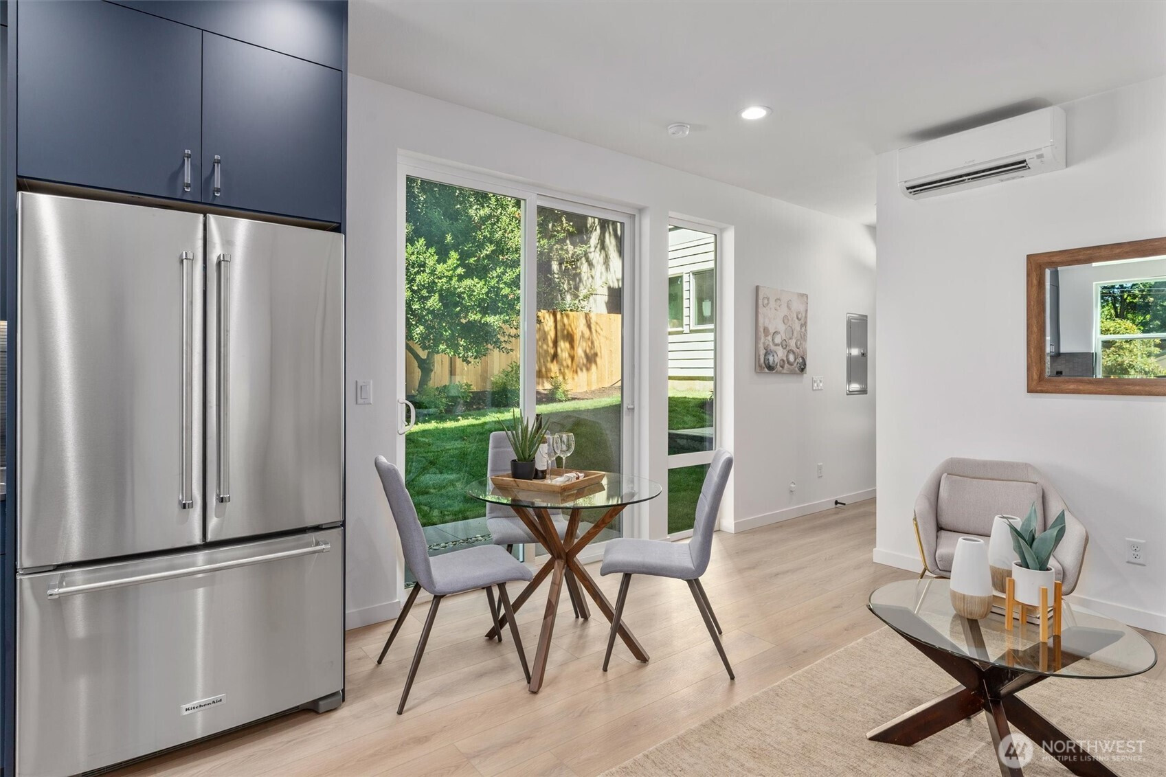 Sophisticated style meets everyday comfort in this newly built Northgate residence with its own private yard. The open-concept main level is anchored by a designer kitchen showcasing rich navy cabinetry, quartz counters, premium stainless steel appliances, and a striking tile backsplash. Expansive windows fill the living and dining areas with natural light and create a seamless connection to the outdoors. Upstairs, the serene primary suite offers a private balcony and spa-inspired bath, while a flexible second bedroom adapts to your needs. An expansive rooftop deck delivers sweeping treetop views, perfect for entertaining or relaxing. EV-ready off-street parking, efficient ductless heating/cooling, and close proximity to Northgate Station, neighborhood parks, shops, and dining make this home a standout.