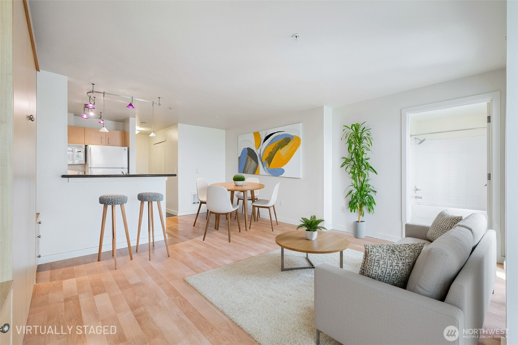 City living made simple—and surprisingly spacious. This thoughtfully designed downtown studio invites you to settle in and make it your own, with a queen Murphy bed, built-in bookcases, and flexible living space that shifts effortlessly from workday to evening unwind. The kitchen is both functional and stylish with stone counters, GE appliances, and contemporary lighting, while a tucked-away nook offers the perfect place to read, work, or recharge. A Juliet balcony brings in light and fresh air, complemented by a California walk-in closet, full bath, and in-unit laundry. Enjoy the shared outdoor terrace and gathering spaces, then step out and explore—just moments to the waterfront, stadiums, International District, and multiple transit options. With no rental cap, this is a place to live, invest, or simply enjoy the best of Seattle.