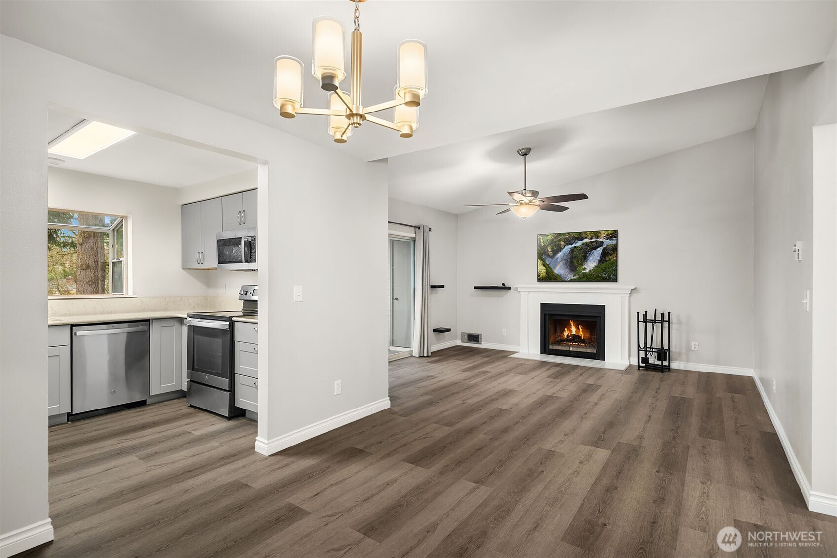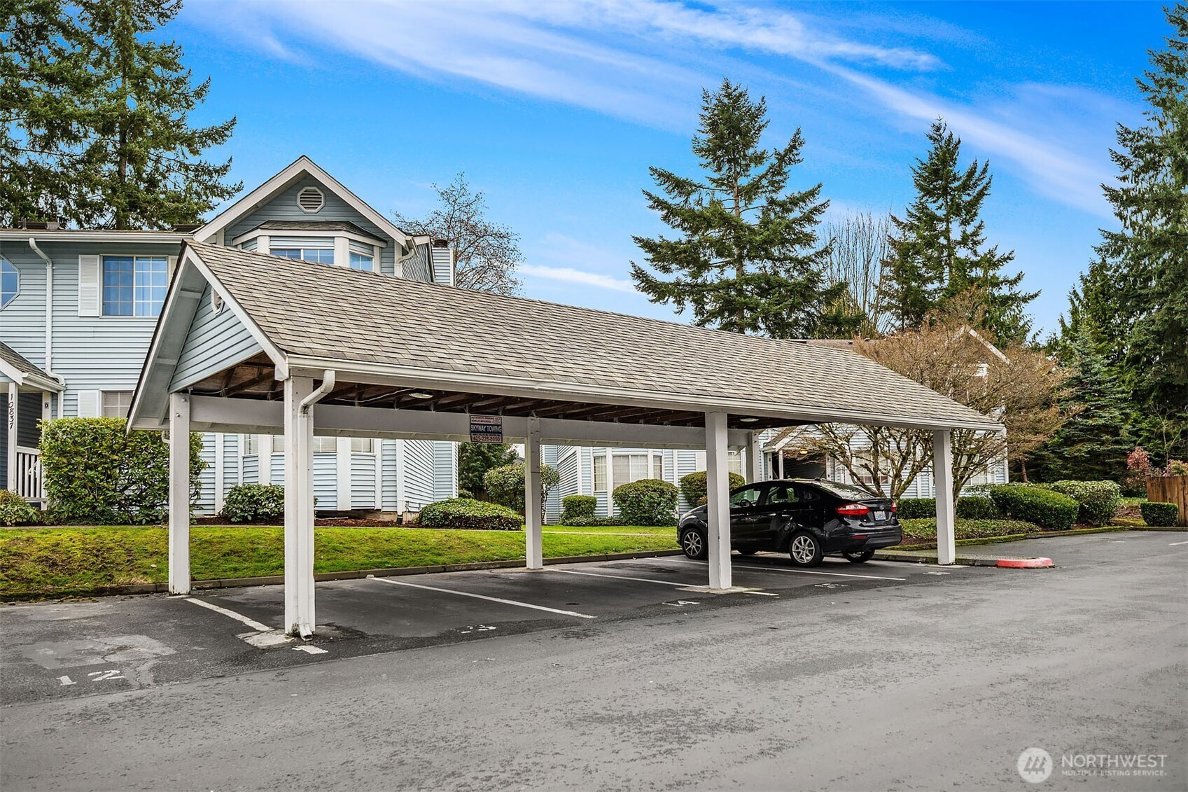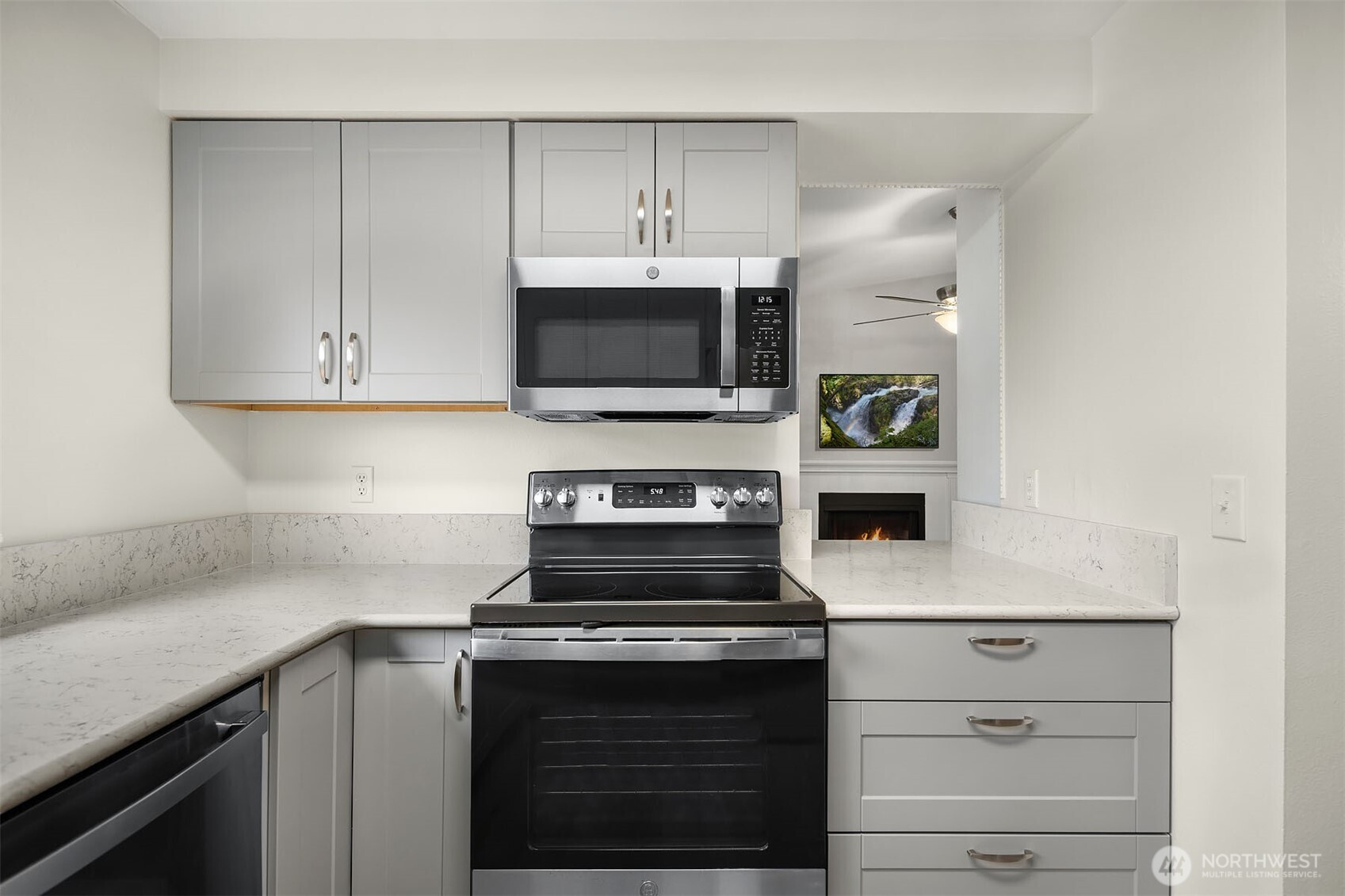 A 'Must See" condo in the desirable Benson Hill neighborhood. Top flloor, end unit provides exceptional privacy. This 2 bedroom, 1.75 bath unit features desirable vaulted ceilings, and has been completely updated. Fabulous kitchen features gorgeous slab quartz counters, shaker cabinetry and newer stainless appliances. Both bathrooms have also been updated using fabulous finishes and they both also feature skylights. Spacious living room features vaulted ceilings, a wood burning fireplace with brick surround and attractive mantel. Glass slider leads out to your private deck with storage closet, perfect for relaxing. This unit comes with both a reserved covered carport space plus a permit for additional parking. Desirable location, close to shopping and easy access to Eastside and Seattle. This unit is gorgeous and very affordable.