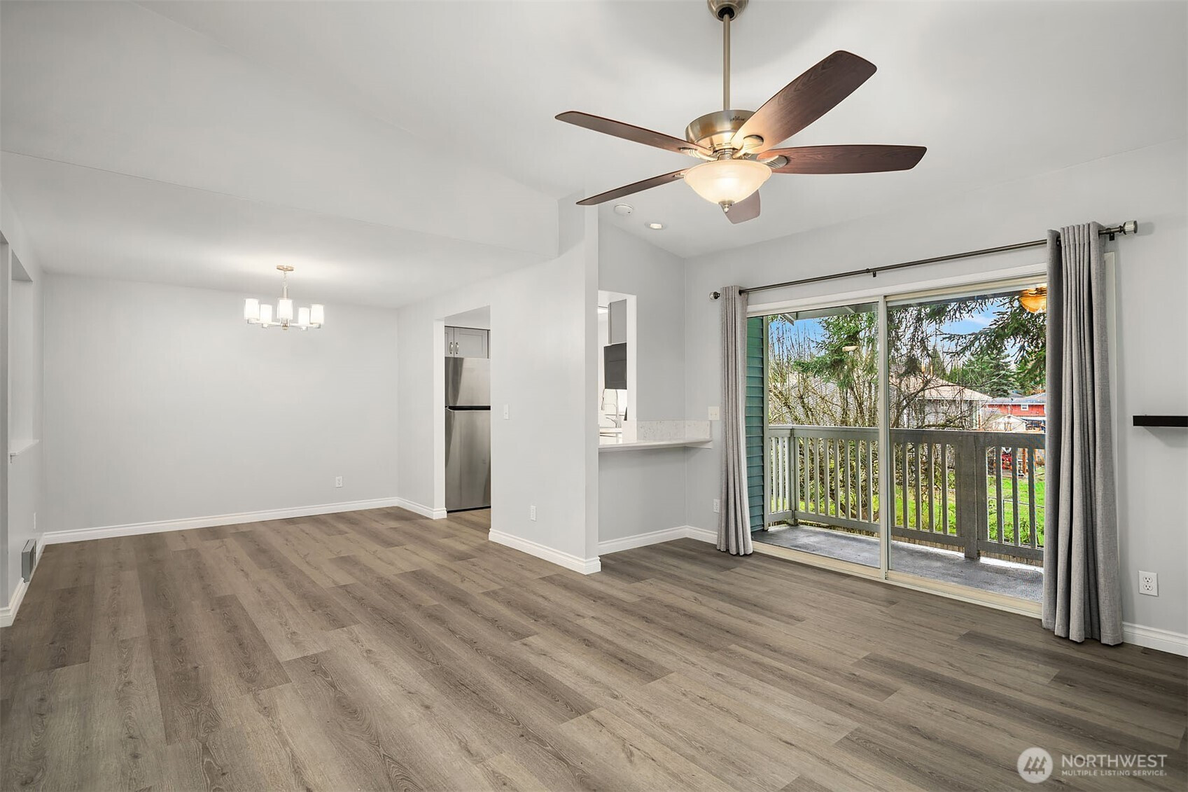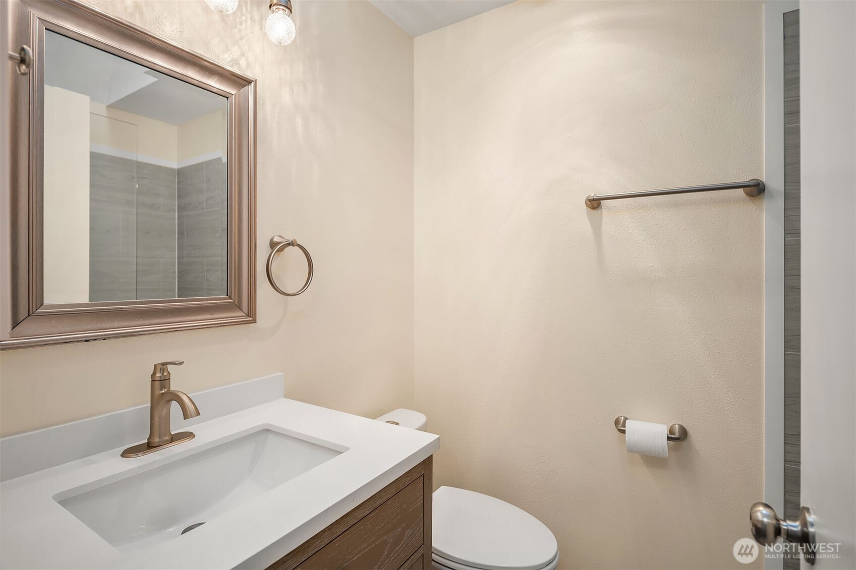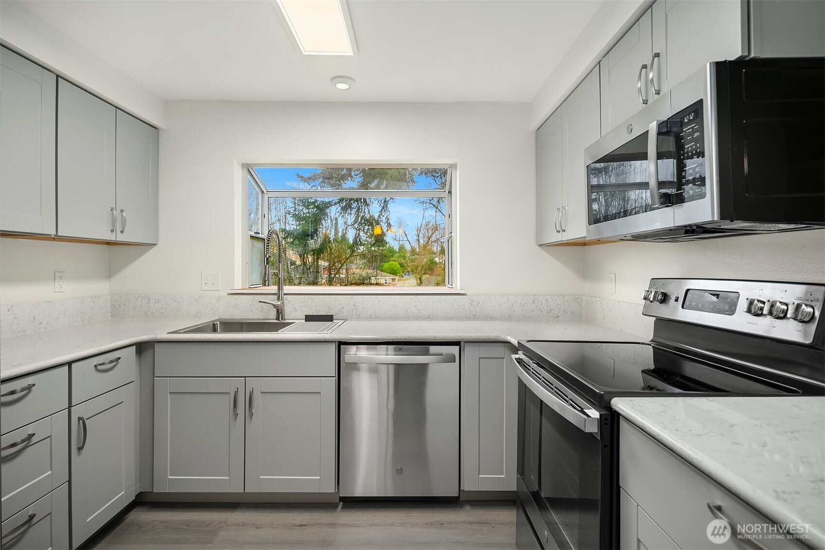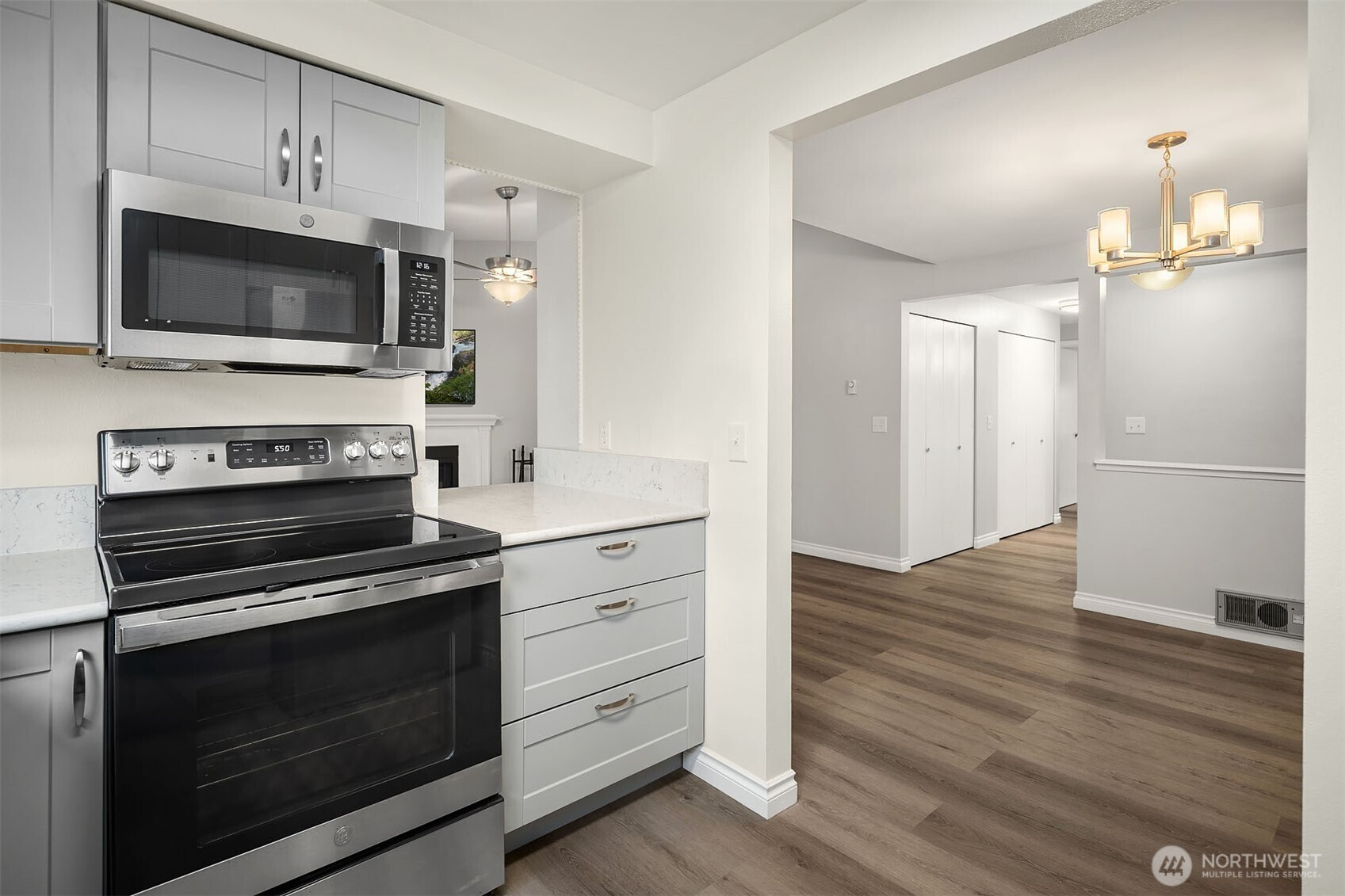 A 'Must See" condo in the desirable Benson Hill neighborhood. Top flloor, end unit provides exceptional privacy. This 2 bedroom, 1.75 bath unit features desirable vaulted ceilings, and has been completely updated. Fabulous kitchen features gorgeous slab quartz counters, shaker cabinetry and newer stainless appliances. Both bathrooms have also been updated using fabulous finishes and they both also feature skylights. Spacious living room features vaulted ceilings, a wood burning fireplace with brick surround and attractive mantel. Glass slider leads out to your private deck with storage closet, perfect for relaxing. This unit comes with both a reserved covered carport space plus a permit for additional parking. Desirable location, close to shopping and easy access to Eastside and Seattle. This unit is gorgeous and very affordable.