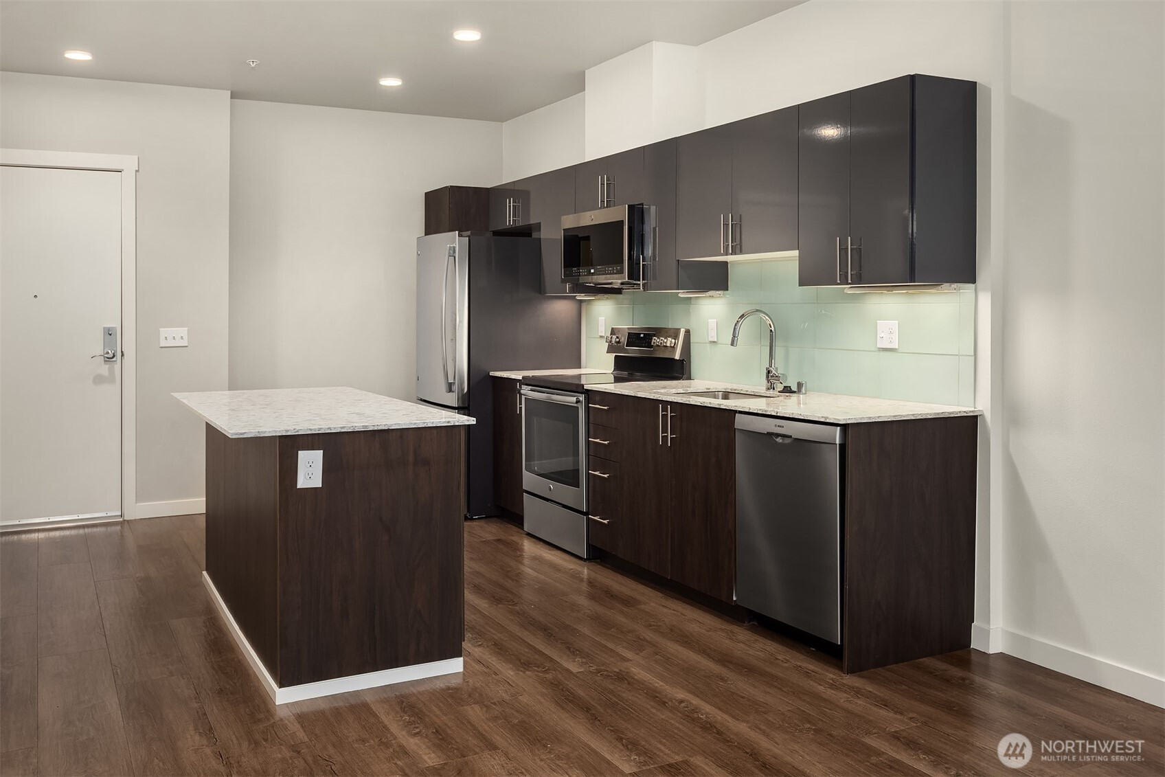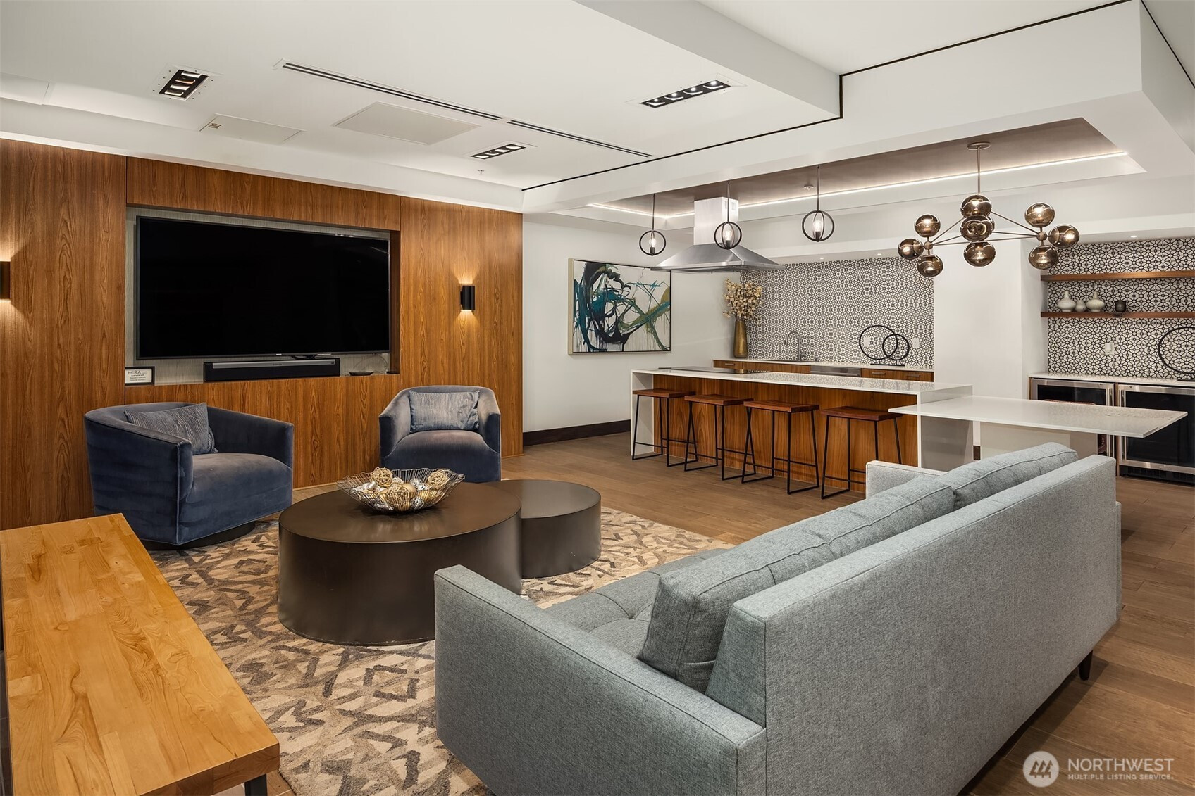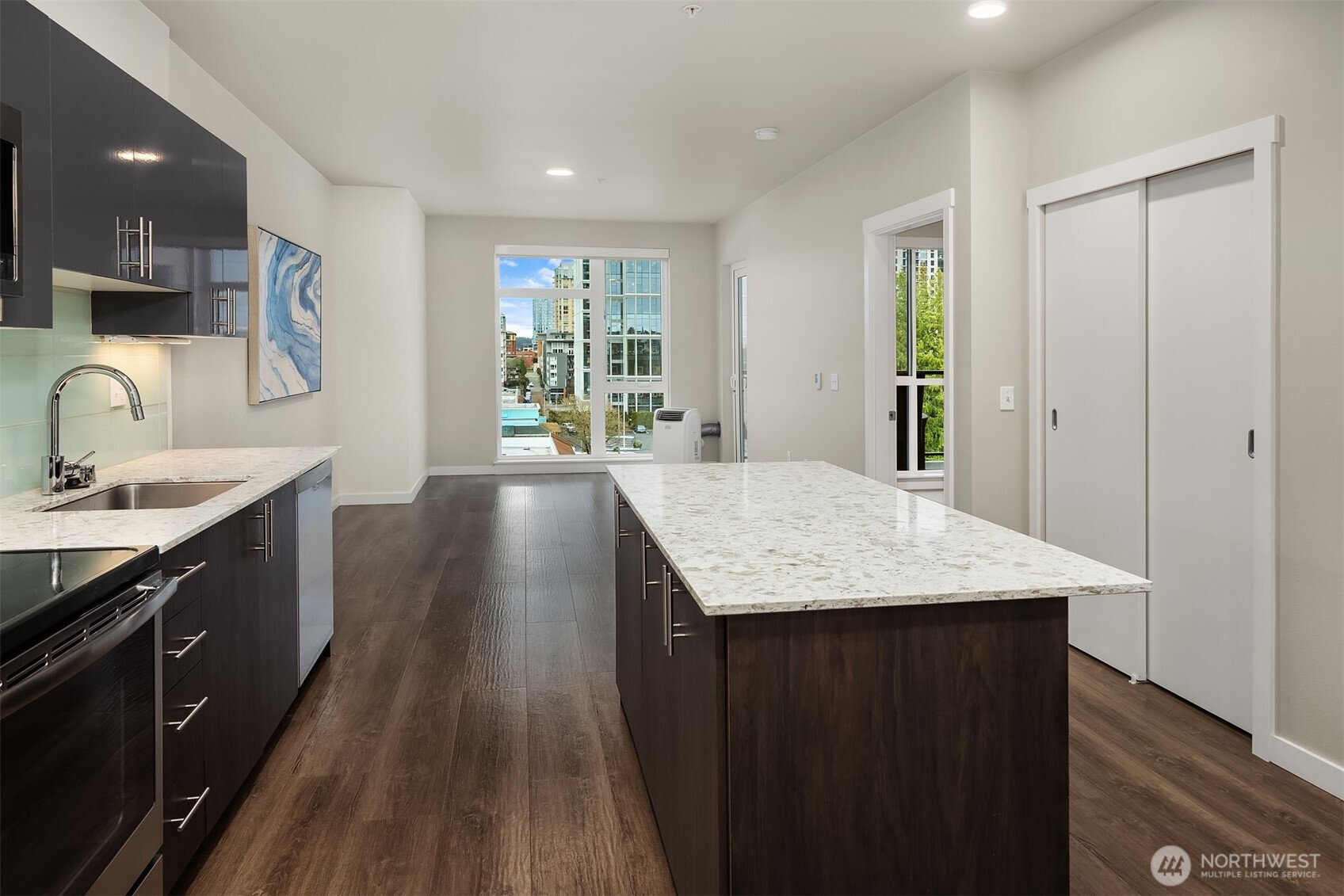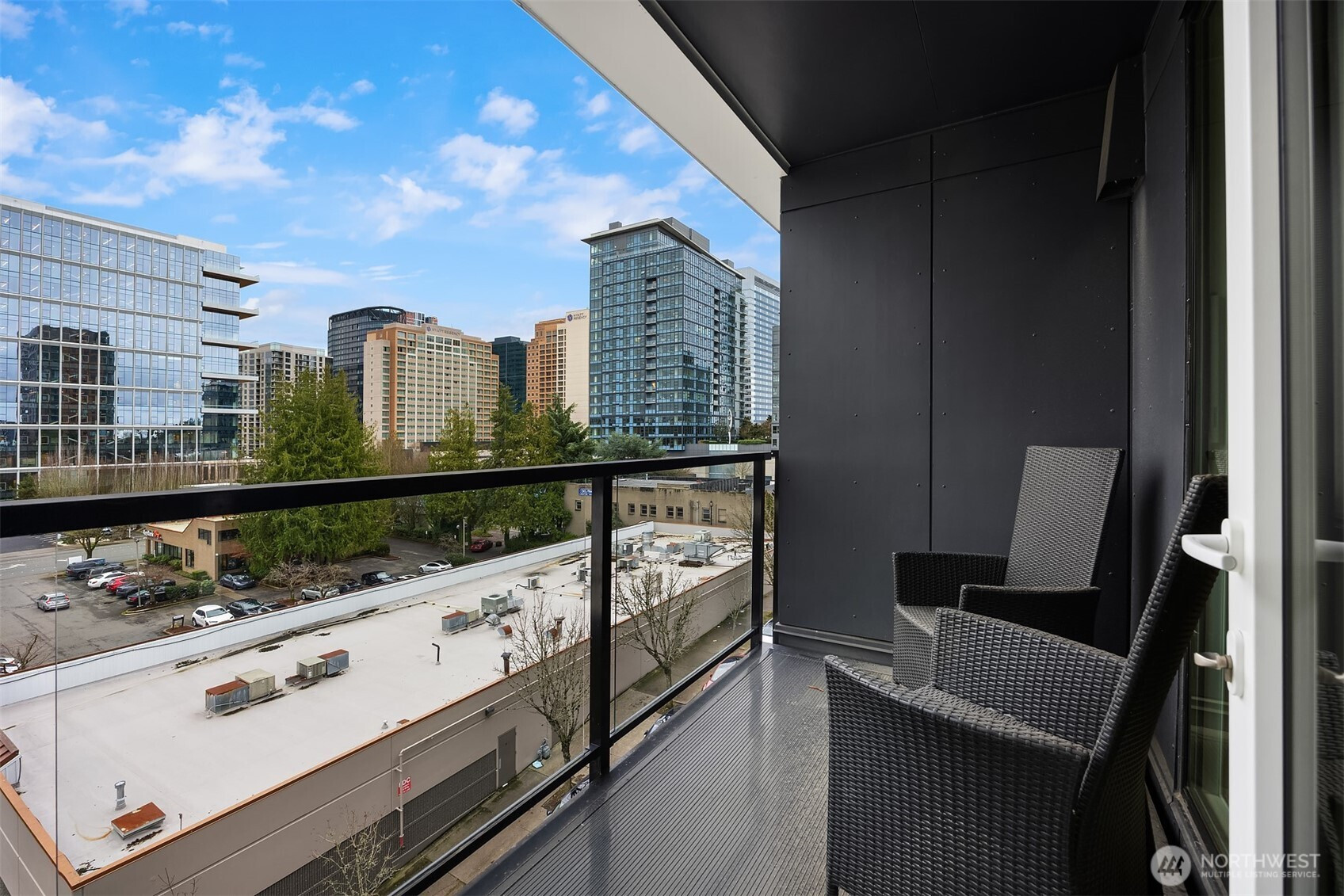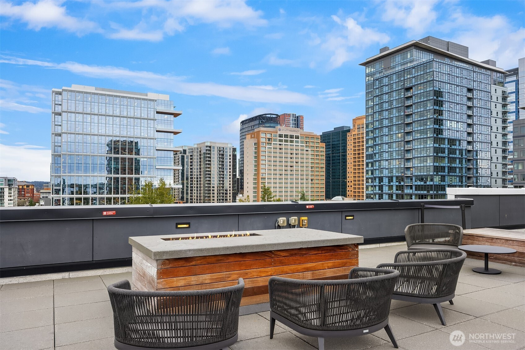 Modern luxury east-facing condo offering a bright, open living experience with unobstructed city views and a private balcony. The thoughtfully designed interior features quartz countertops, stainless steel appliances, a spacious kitchen island, sleek cabinetry with under-cabinet lighting, a custom-made bedroom closet, and newly replaced dishwasher and microwave. Expansive windows bring in abundant natural light while maintaining privacy. Residents enjoy a refined rooftop retreat with open seating, BBQ area, fire pit, and pet area, plus concierge service, clubhouse, dog wash station, bike storage, and secured garage parking. Exceptional walkability with easy access to Bellevue Square, shopping, dining, cafés, and nearby parks. No rental cap.