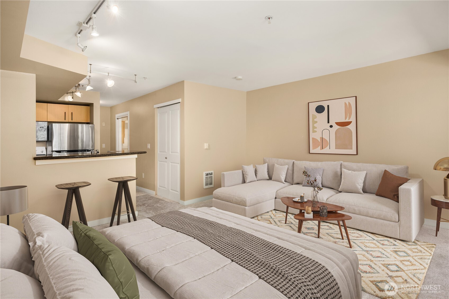 Tranquil Urban Retreat – Move-In Ready! Rare 3rd-floor home with direct access to a private gated patio. Large windows fill the space with bright, leafy views/super private. Open layout features granite kitchen with raised bar, in-unit W/D, & large walk-in closet, newer carpets. Dual elevators—no stairs needed! Prime location 98 Walk Score-near business district, hospitals, shopping, dining, nightlife, rail, ferry, & sports fields. Tobira offers community lounge, shared workspaces, no rental cap, & strong HOA reserves ($1.3M). Dues $421.88 include W/S/G, insurance & more—no special assessments. Secure garage parking options often for rent+ample public parking. Pet friendly. A rare chance to own in a desirable downtown community!