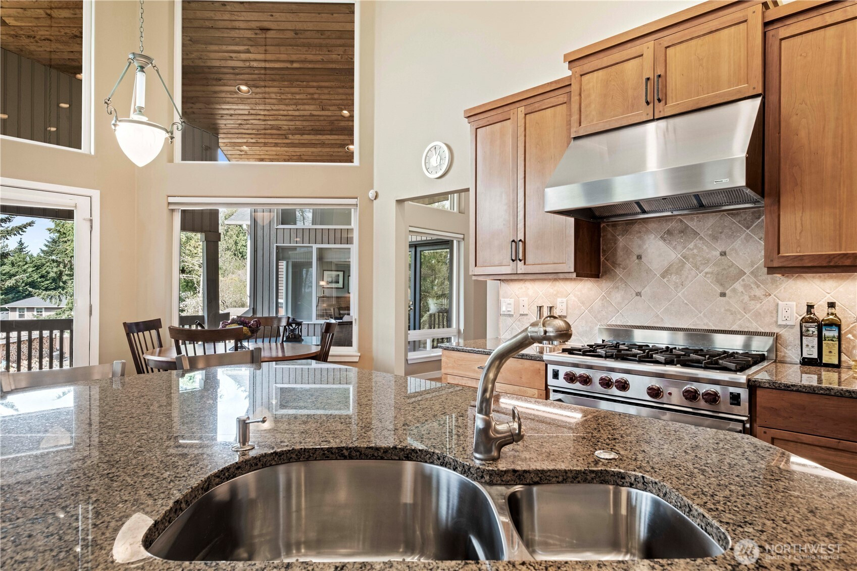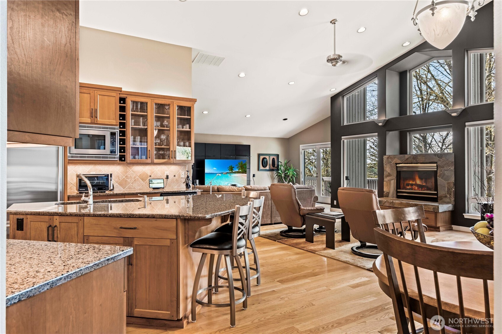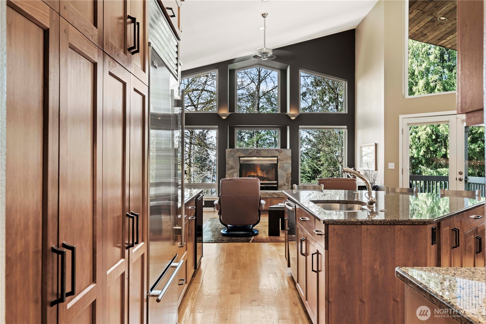 One-of-a-kind, meticulously maintained contemporary rambler offering awe-inspiring filtered views of Lake Sammamish and the Seattle skyline—delivering peaceful country living just minutes from everything. Vaulted ceilings, gleaming hardwood floors, and expansive windows bathe the home in natural light, creating a warm and inviting ambiance throughout. The formal living room captures stunning lake views, while the chef’s kitchen is a true showpiece featuring a Wolf range, Sub-Zero refrigerator, Bosch dishwasher, custom cherrywood cabinetry, wine refrigerator, granite countertops, and a large island ideal for entertaining. The spacious great room boasts floor-to-ceiling windows, a cozy gas fireplace, built-in shelving, and a professionally installed Bose surround sound system. A private den/office with built-ins offers flexibility for today’s lifestyle. The luxurious primary suite features a walk-out deck to take in the views, a spa-like bath with marble counters, jetted soaking tub, dual sinks, and a custom walk-in closet. Two additional bedrooms are generously sized. Set on a rare ½-acre double lot, the home offers an expansive covered deck, fully fenced yard, and professionally landscaped grounds with mature trees. Additional highlights include a new presidential roof, A/C, generator wiring, 2-car garage, and large storage area. Ideally located near top-rated Lake Washington District schools, parks, trails, SR-520, I-90, Redmond, Issaquah, Microsoft, Amazon & Cascade Mtns.
