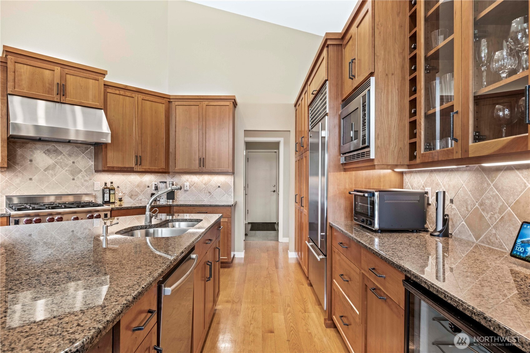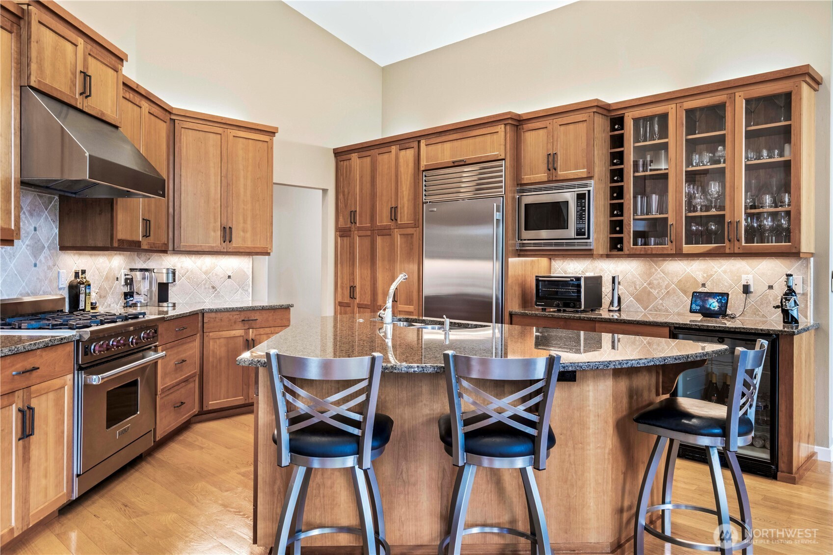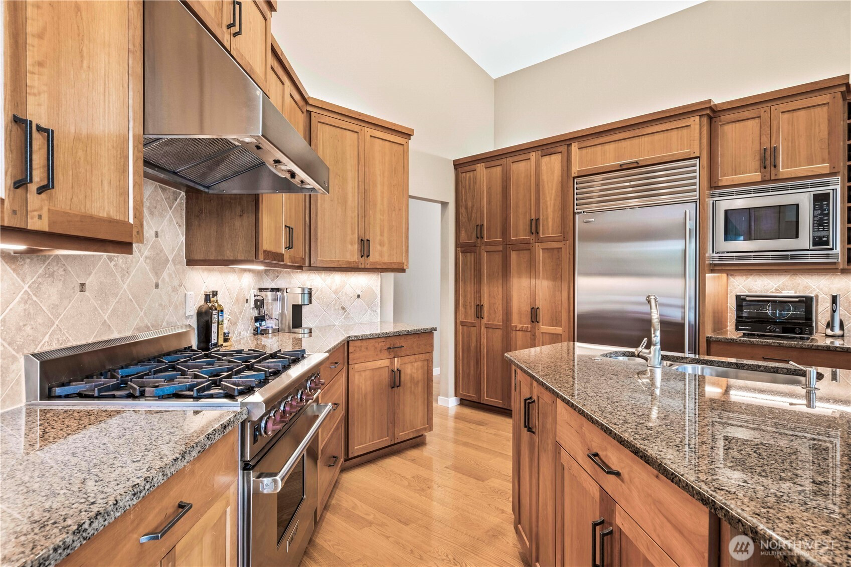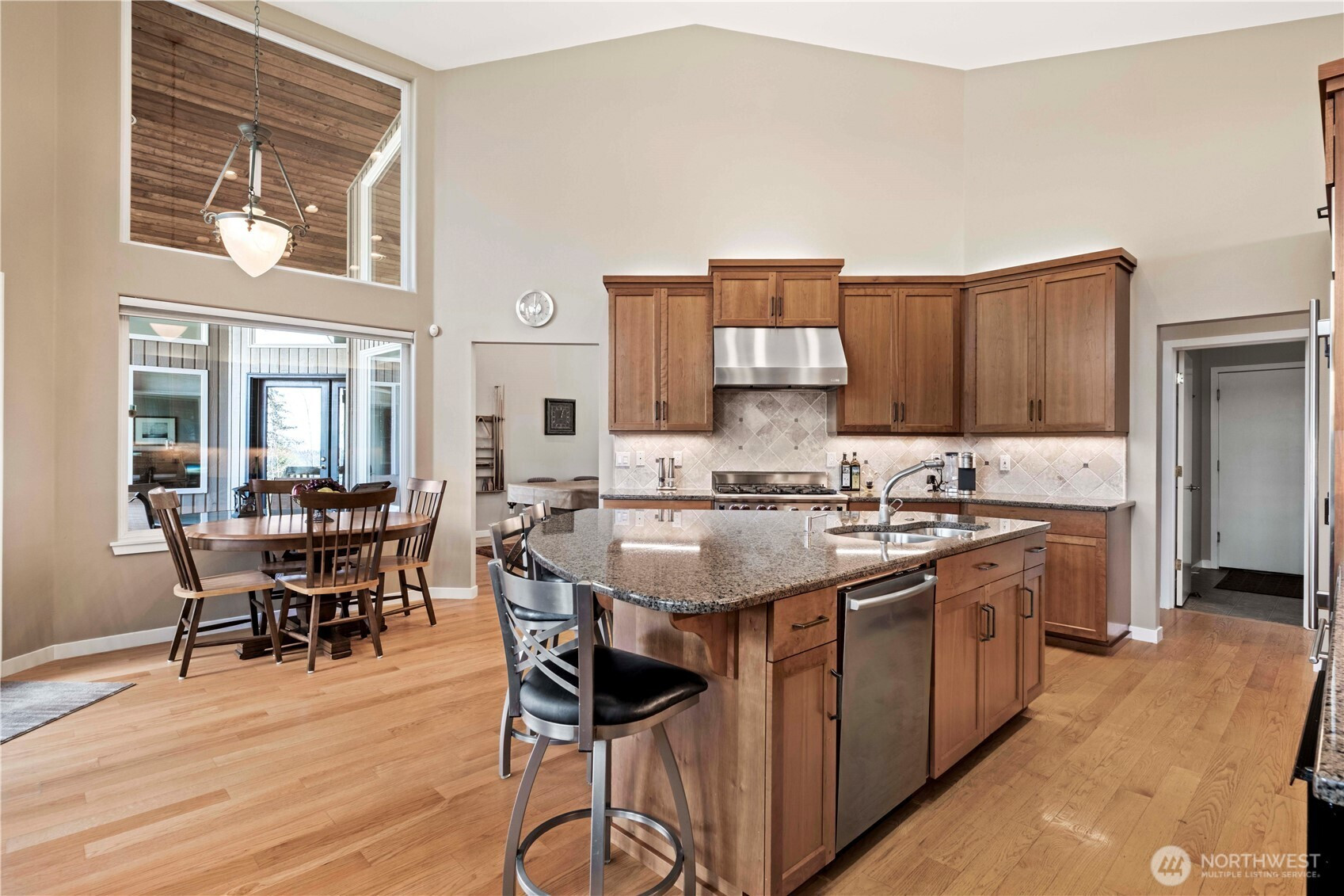 One-of-a-kind, meticulously maintained contemporary rambler offering awe-inspiring filtered views of Lake Sammamish and the Seattle skyline—delivering peaceful country living just minutes from everything. Vaulted ceilings, gleaming hardwood floors, and expansive windows bathe the home in natural light, creating a warm and inviting ambiance throughout. The formal living room captures stunning lake views, while the chef’s kitchen is a true showpiece featuring a Wolf range, Sub-Zero refrigerator, Bosch dishwasher, custom cherrywood cabinetry, wine refrigerator, granite countertops, and a large island ideal for entertaining. The spacious great room boasts floor-to-ceiling windows, a cozy gas fireplace, built-in shelving, and a professionally installed Bose surround sound system. A private den/office with built-ins offers flexibility for today’s lifestyle. The luxurious primary suite features a walk-out deck to take in the views, a spa-like bath with marble counters, jetted soaking tub, dual sinks, and a custom walk-in closet. Two additional bedrooms are generously sized. Set on a rare ½-acre double lot, the home offers an expansive covered deck, fully fenced yard, and professionally landscaped grounds with mature trees. Additional highlights include a new presidential roof, A/C, generator wiring, 2-car garage, and large storage area. Ideally located near top-rated Lake Washington District schools, parks, trails, SR-520, I-90, Redmond, Issaquah, Microsoft, Amazon & Cascade Mtns.