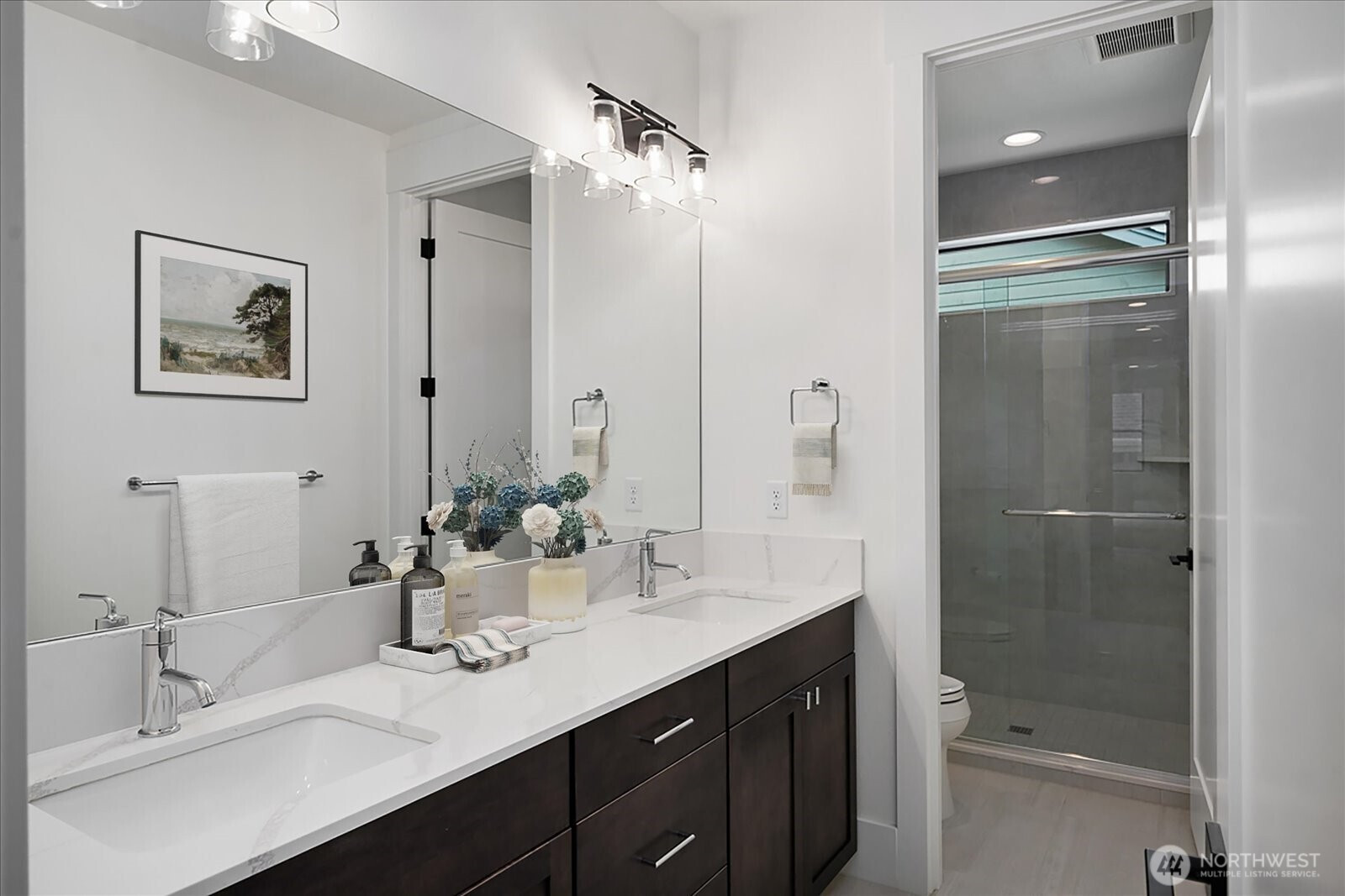 (503) 893-8874Welcome to this like-new, beautiful JayMarc modern farmhouse resale, located on a quiet cul-de-sac in the highly desirable location of Enatai. Entertain in the kitchen like a pro with a seamless indoor/outdoor connection to the covered bbq area & gas fireplace. Ten foot ceilings and a multitude of windows flood the space with natural light. Downstairs, the private guest quarters are positioned perfectly for extended stays. Upstairs, retreat to the sumptuous primary with lavish bathroom w/heated floors & oversized shower/tub. In addition to 3 more bedrooms upstairs, you will enjoy the large media & bonus rooms plus laundry room with 2 sets of washers & dryers. 3 car garage, AC, fully fenced level yard with sprinkler system. Virtual staging