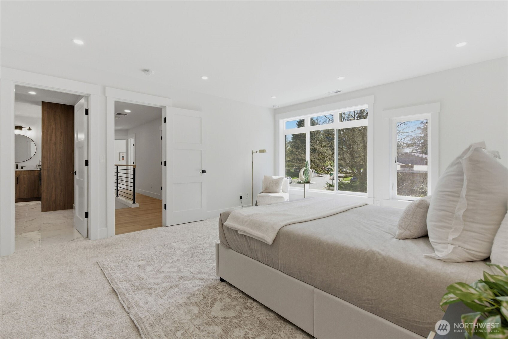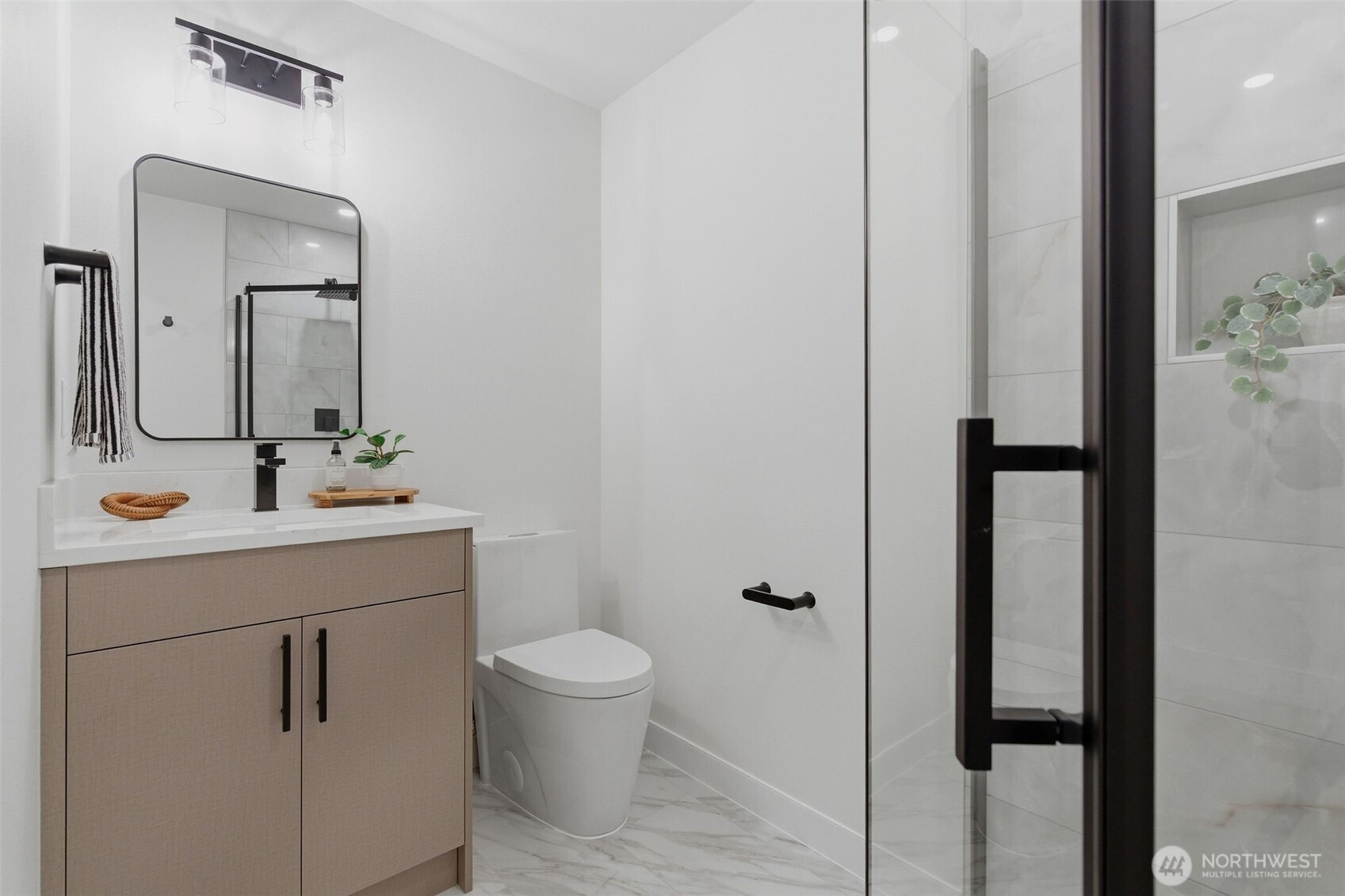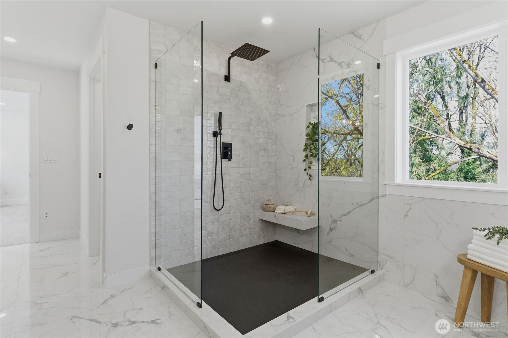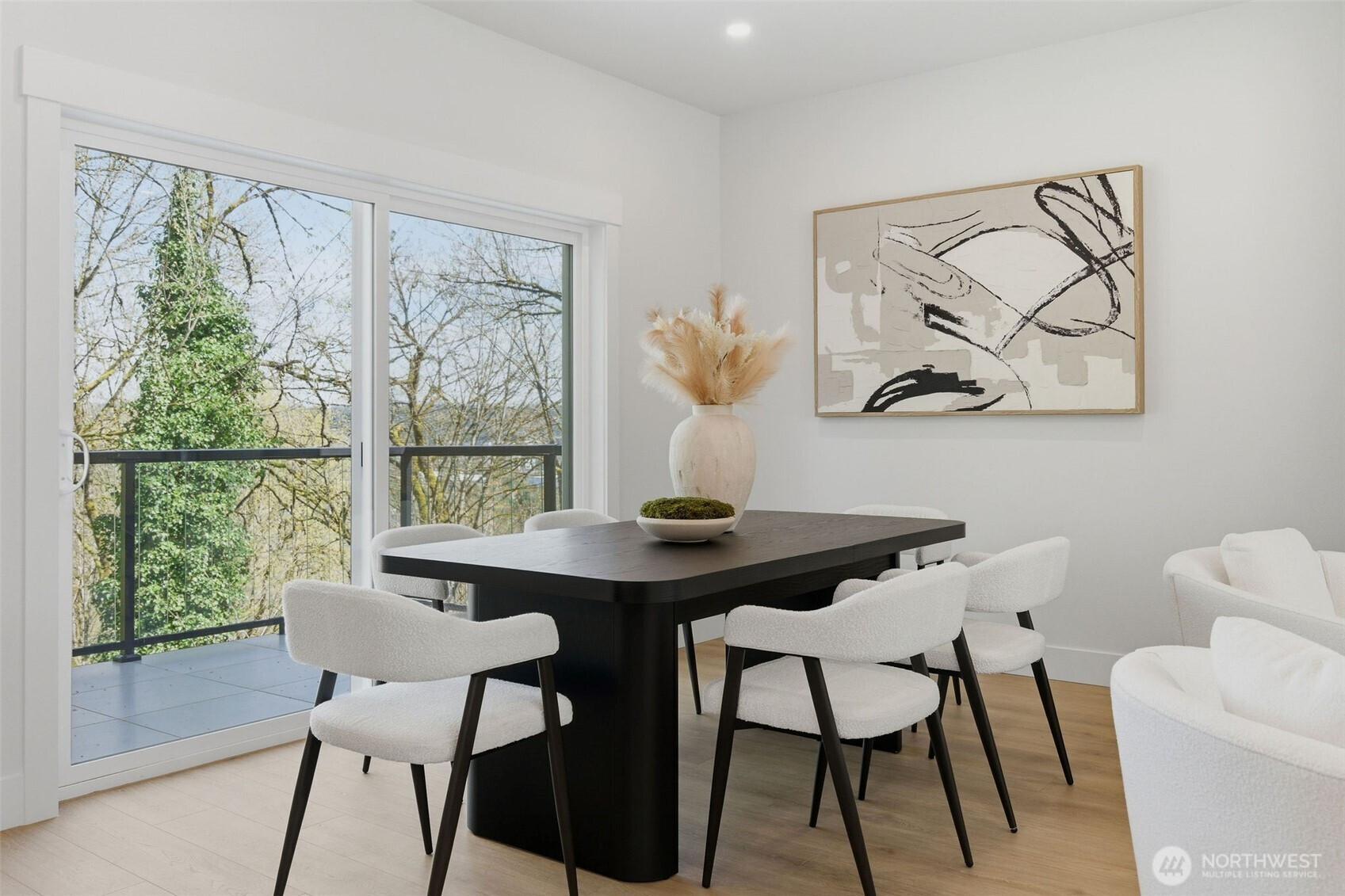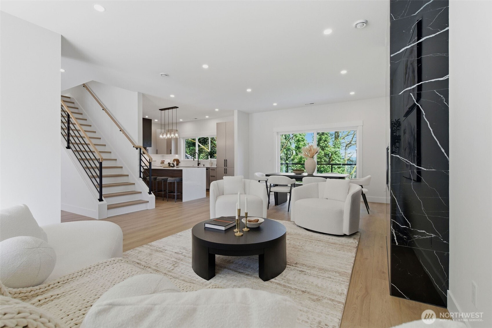New construction, completed 2026. 3,132 square feet backing directly to greenbelt — no rear neighbors, full tree canopy, and consistent quiet due to the natural buffer behind the home. Four bedrooms across two levels. The kitchen features custom finishes and premium materials throughout — it's the centerpiece of the home for a reason. Bathrooms are finished well above typical new construction with high-end tile work, fixtures, and detailing that are worth seeing in person. Upper level includes three bedrooms and a primary suite with real separation from the rest of the house. Lower level offers a fourth bedroom with separate access and rough-in potential for a kitchenette — a natural fit for multigenerational living, long-term guests, or rental income. The greenbelt is what sets this one apart. The lot backs into mature tree cover with no development behind it. No sight lines from neighboring properties to the rear. Large decks extend directly out toward the greenbelt, putting you right at the edge of the tree line — usable outdoor space that feels connected to the natural surroundings rather than separated from them. Mornings are quiet, birds are a constant presence, and the deck-to-greenbelt connection makes the outdoor living space feel significantly larger than the lot itself. Totem Lake, Juanita, and top-rated Kirkland schools are all a few minutes away.