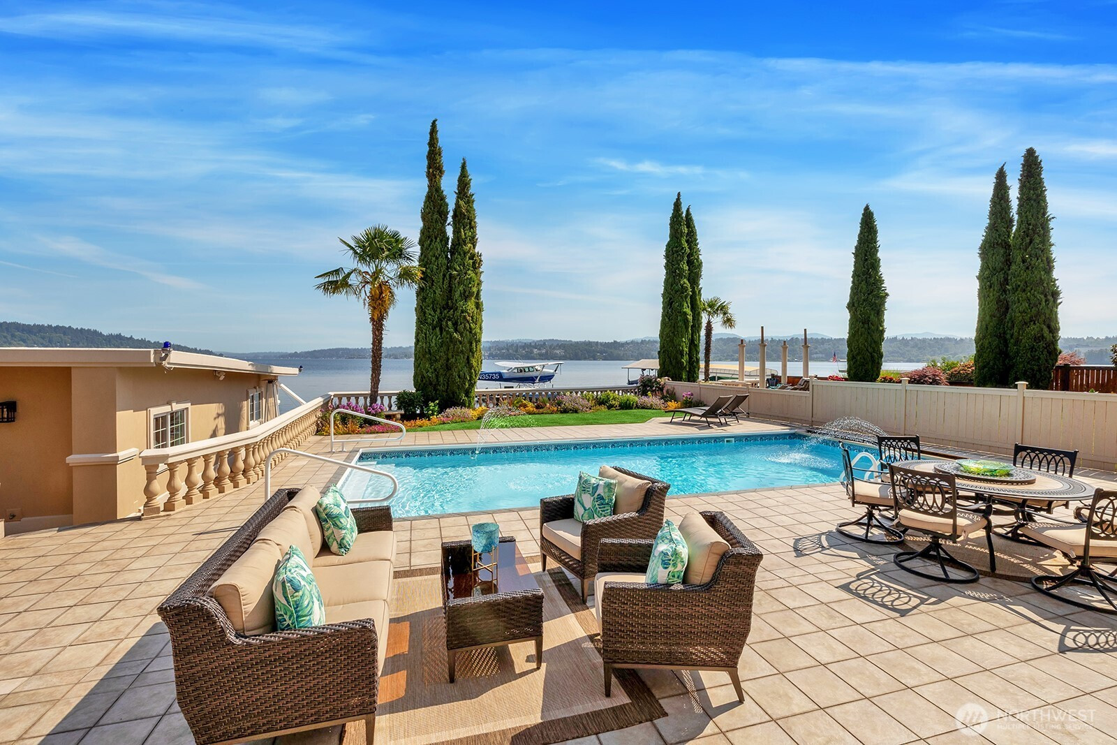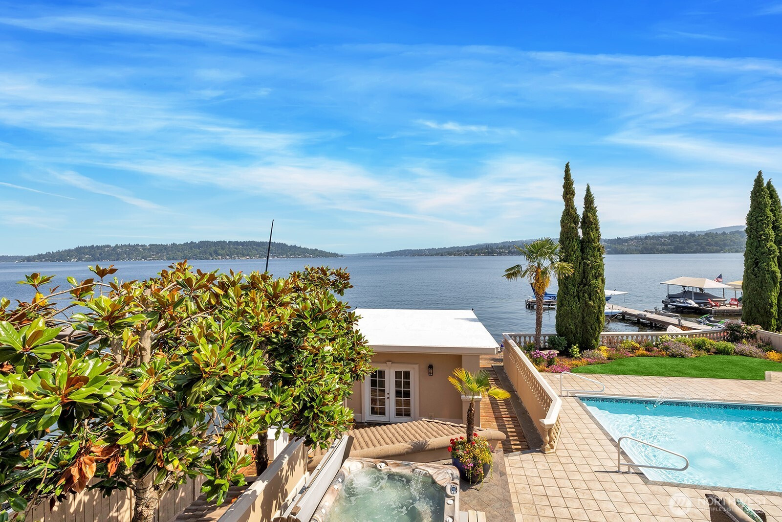 Discover luxury living on Lake Washington with this custom-built Hawaiian paradise. This stunning lakefront home features 33ft ceilings and panoramic views from every room, perfect for enjoying sunsets. The open floorplan seamlessly connects indoor and outdoor spaces, ideal for entertaining. Enjoy sweeping staircases, heated floors, custom murals, a secret room, an in-ground pool, new hot tub, a boat dock with lift and the option for an elevator. The primary suite offers stunning views from bed and a private balcony, while the gourmet kitchen boasts Dacor appliances, a massive island and a Butler's pantry. For convenience, there's a helipad on the fully finished boat house, a finished 2-car garage and gated entry.