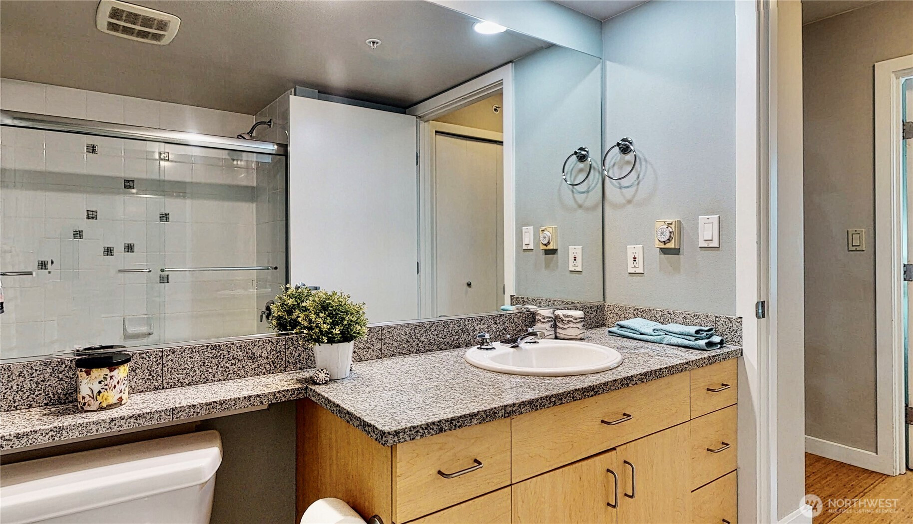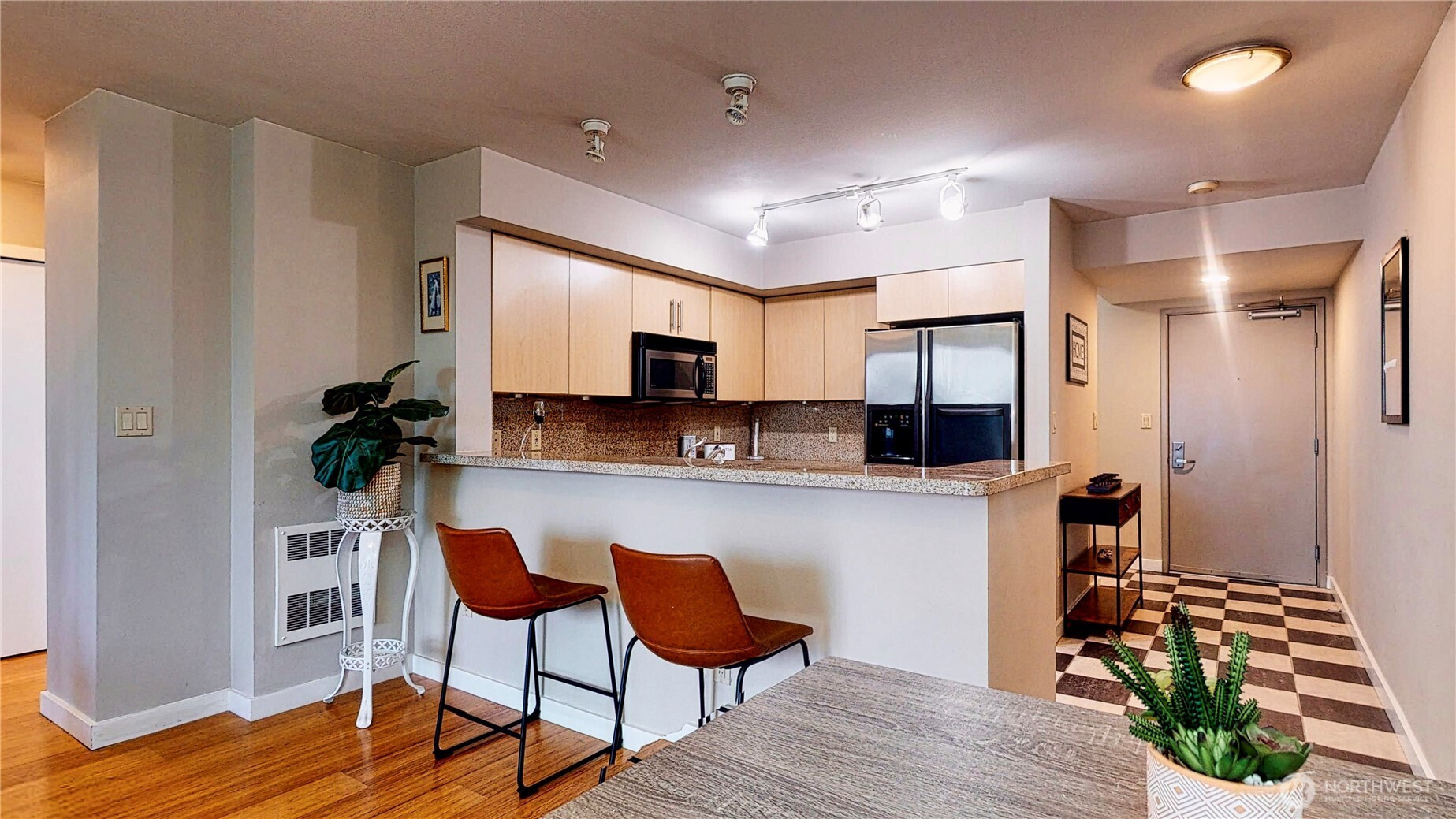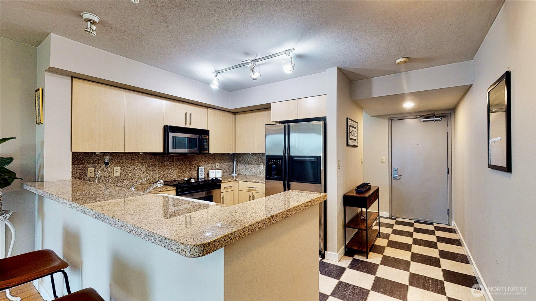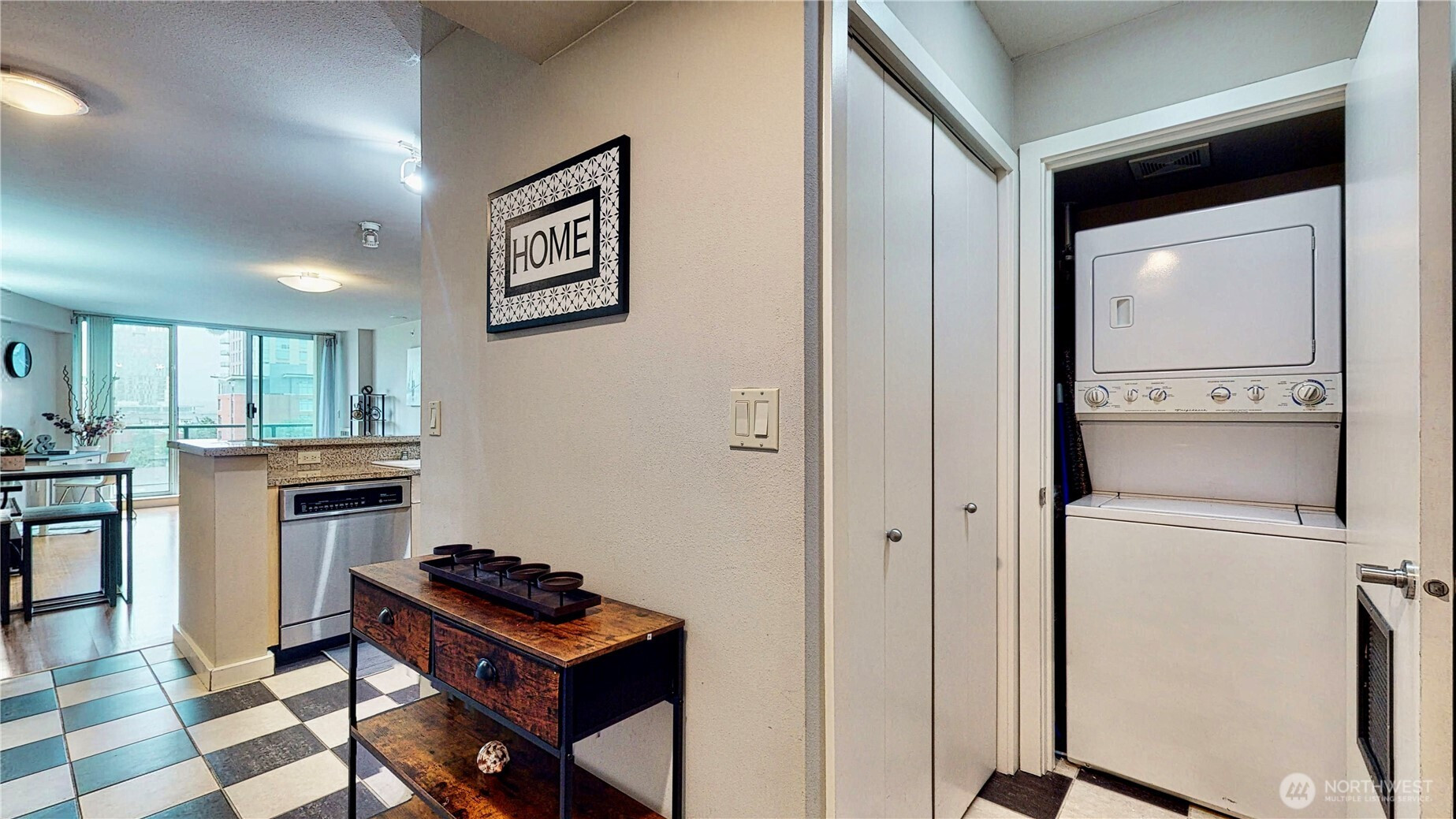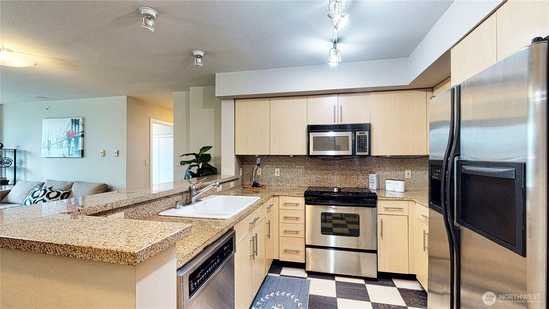 Enjoy sunrise Views+City Energy in this Central Bellevue Highrise condo. This 1 bed / 1 bath unit is ideally located in the heart of Central Bellevue and offers NO rental cap, making it perfect for both homeowners and investors. Enjoy the views of the Cascade Mountain & Downtown Bellevue from this 7th floor unit with 2-private balconies to welcome the morning’s beautiful east-facing sunrises. A wall of windows with a sliding glass door fills the home with natural light, The modern kitchen features sleek flat panel cabinetry, granite countertops, stainless steel appliances, a NEWer stove and a breakfast bar. The Bamboo floors offer a contemporary style while adding warmth to the space. The spacious bedroom has two closets and its own east facing balcony. The bathroom includes a tub/shower combination with a glass door. Portable AC easily cools the unit, in unit washer & dryer, new water heater & ample storage. Assigned secure garage parking included. Unbeatable location for an easy commute—less than a quarter mile to parks, the library, and the Bellevue Collection, the Northwest’s premier shopping and dining destination with over 200 shops, restaurants, and entertainment options. Building amenities include CONCIERGE service, guest suite, owners’ lounge, fitness center, and more.