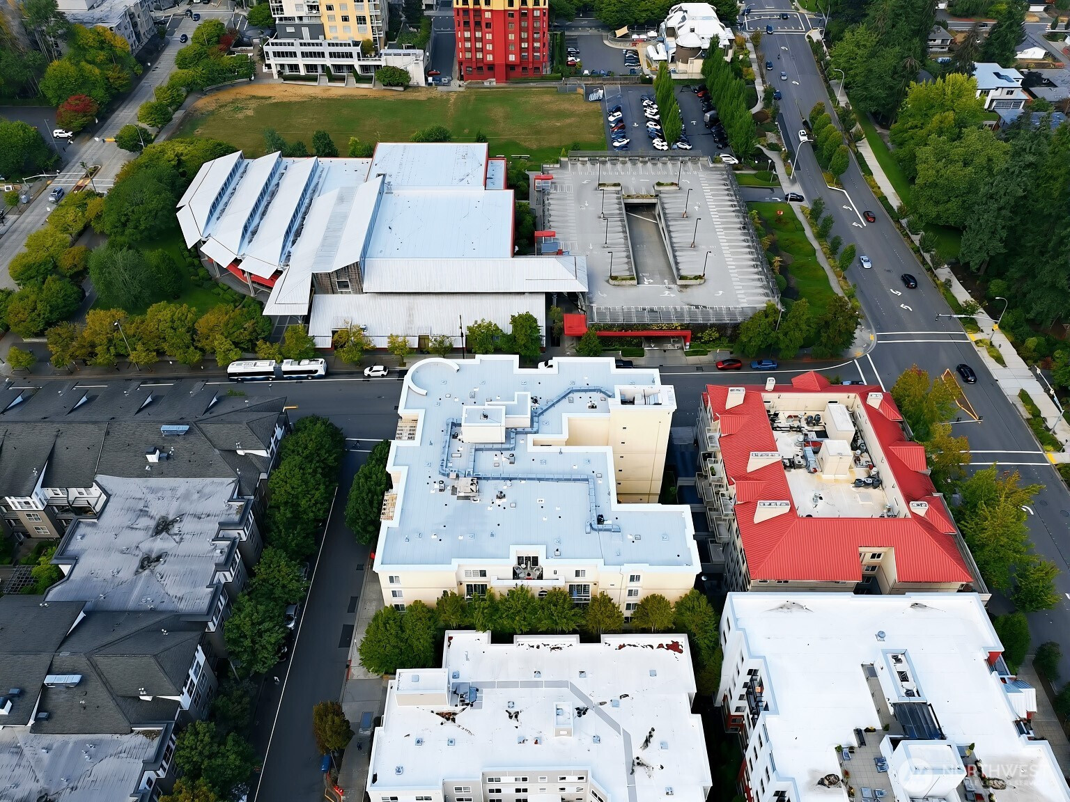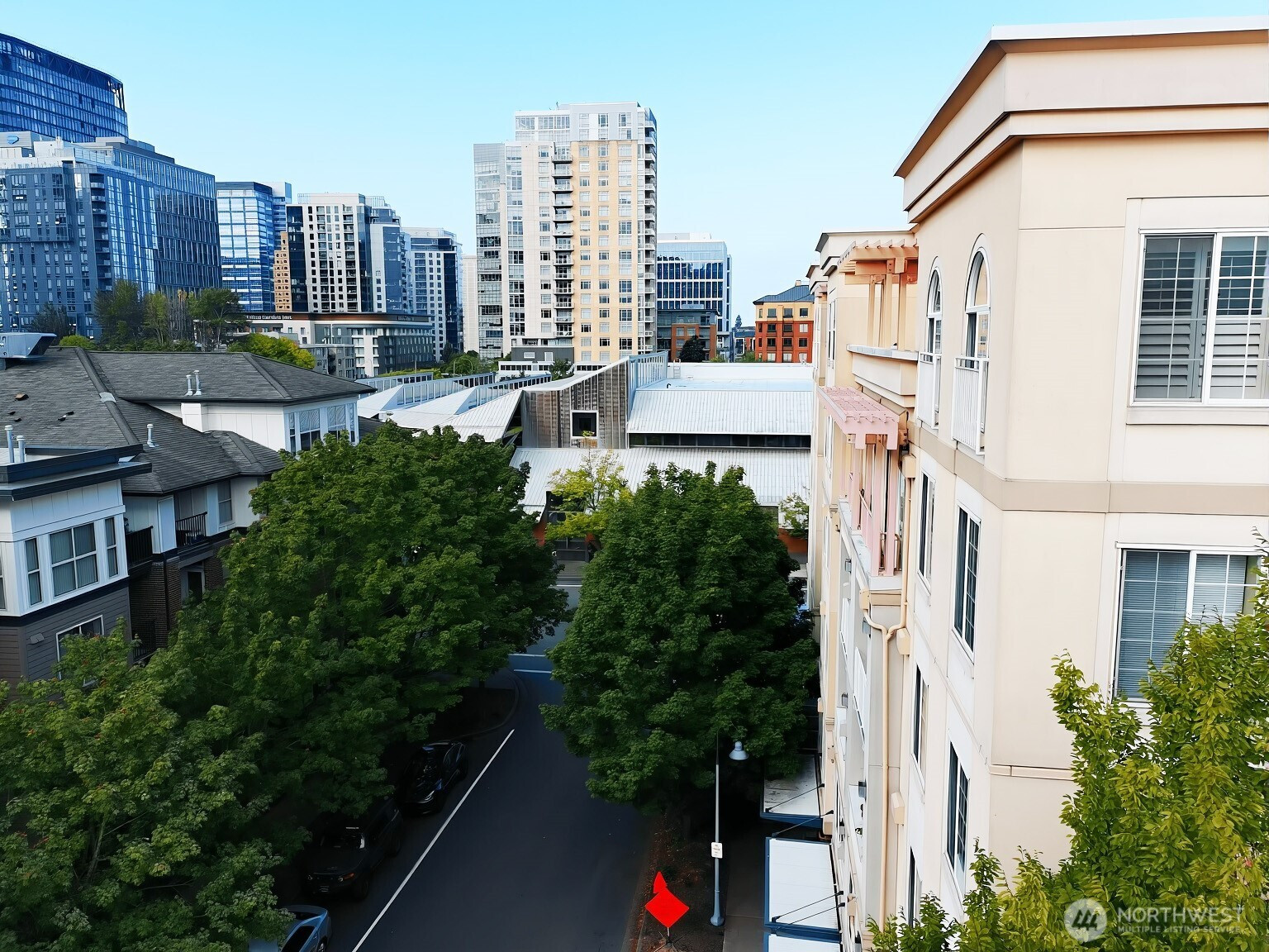 Experience the best of downtown Bellevue at Library Square! This rare corner condo with no shared walls offers unmatched privacy and quiet right in the city’s core. Featuring 990 sq ft, this 2-bedroom, 2-bath layout is bright and open with a modern kitchen, stainless appliances, bar seating, and a private balcony for year-round enjoyment. The spacious primary suite includes a walk-in closet and ensuite bath, complemented by a full second bath. Two deeded parking spaces, a well-managed HOA and no rental cap make this home a fantastic choice for buyers or investors alike. All just steps from Bellevue Library, shopping, dining, and the upcoming light rail!