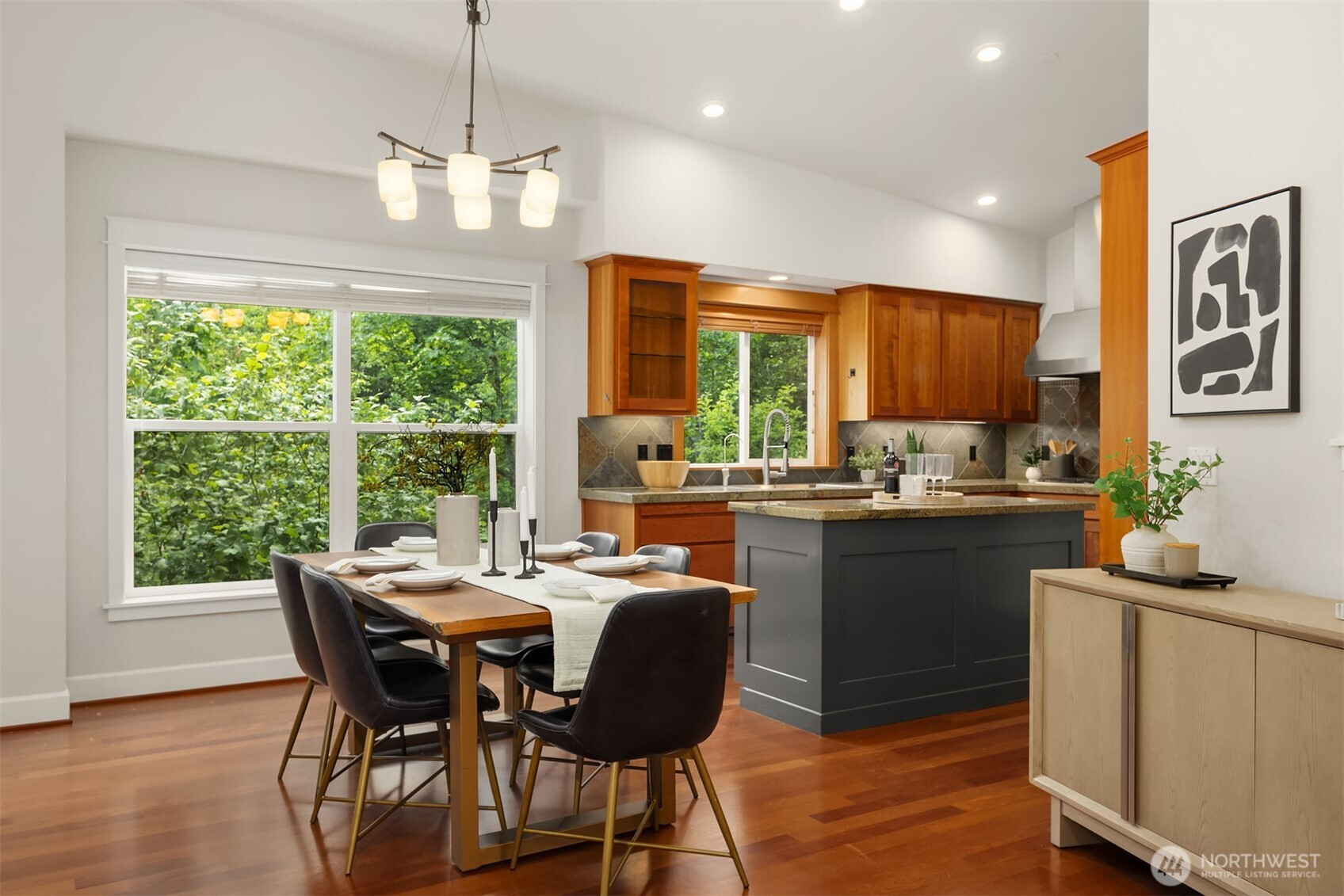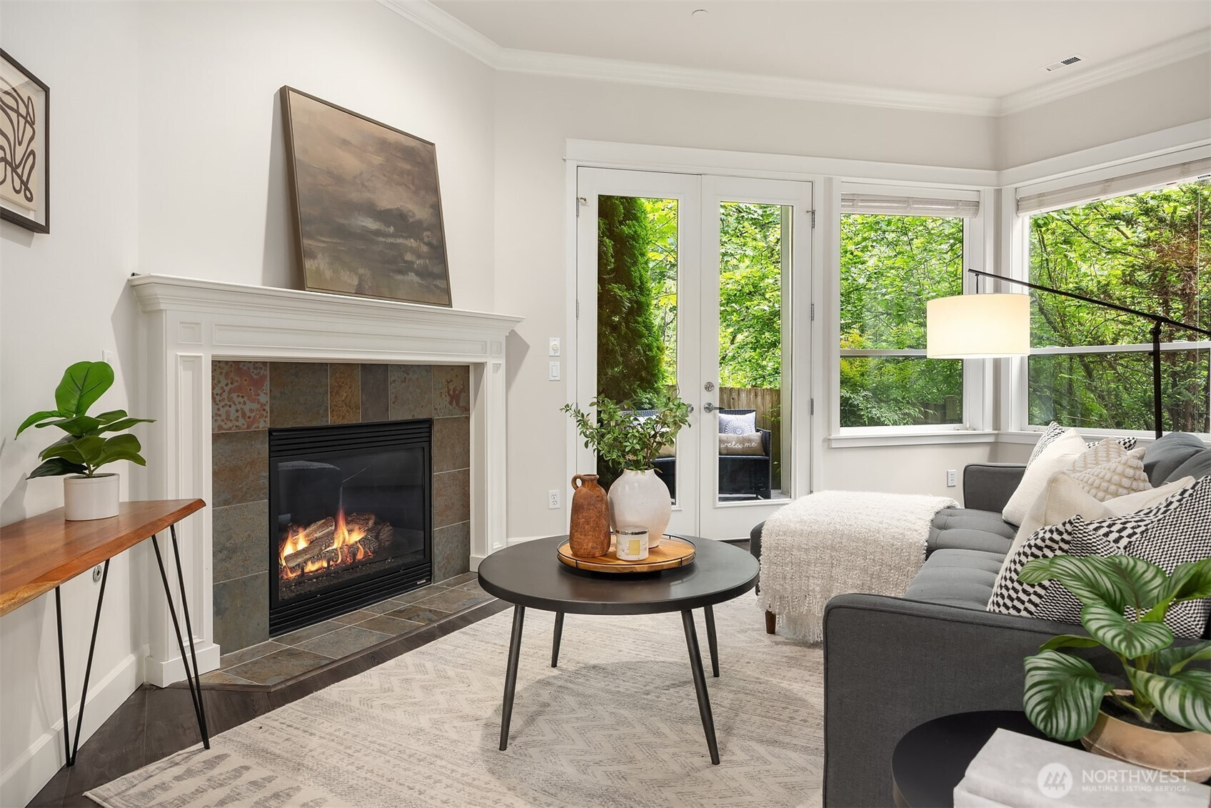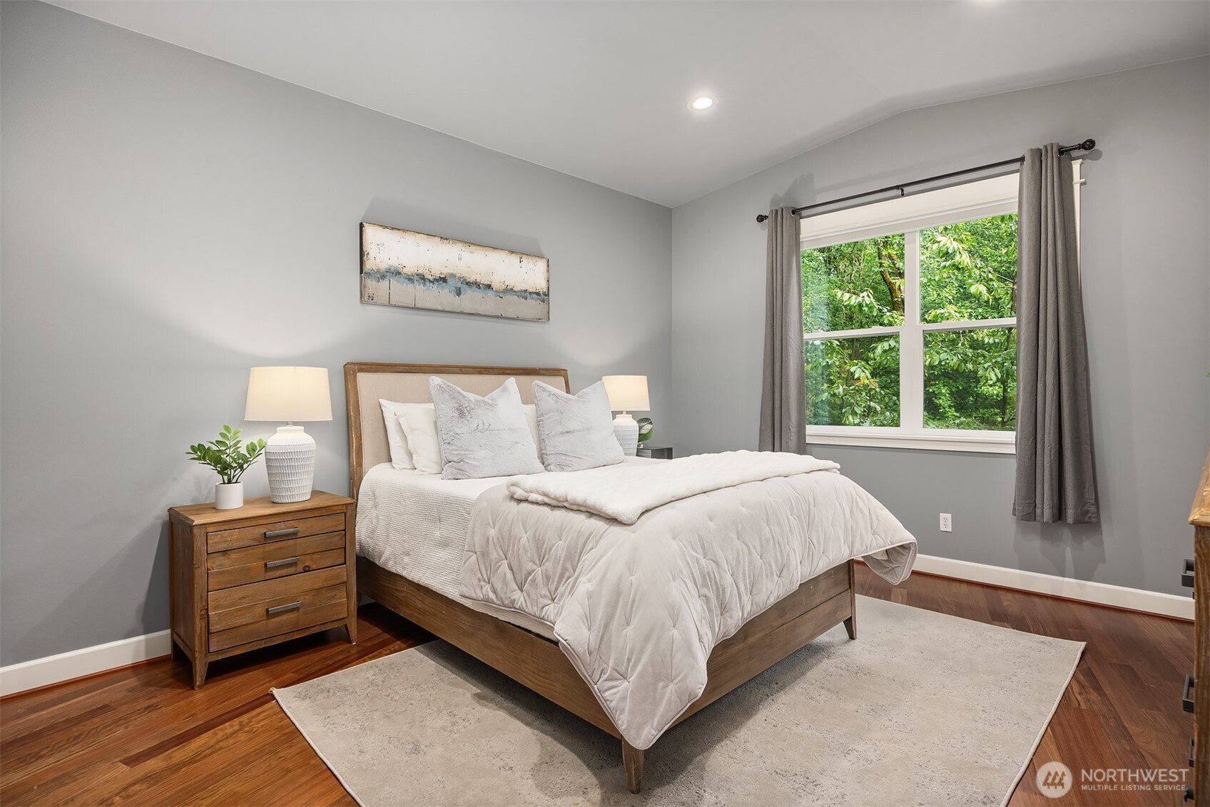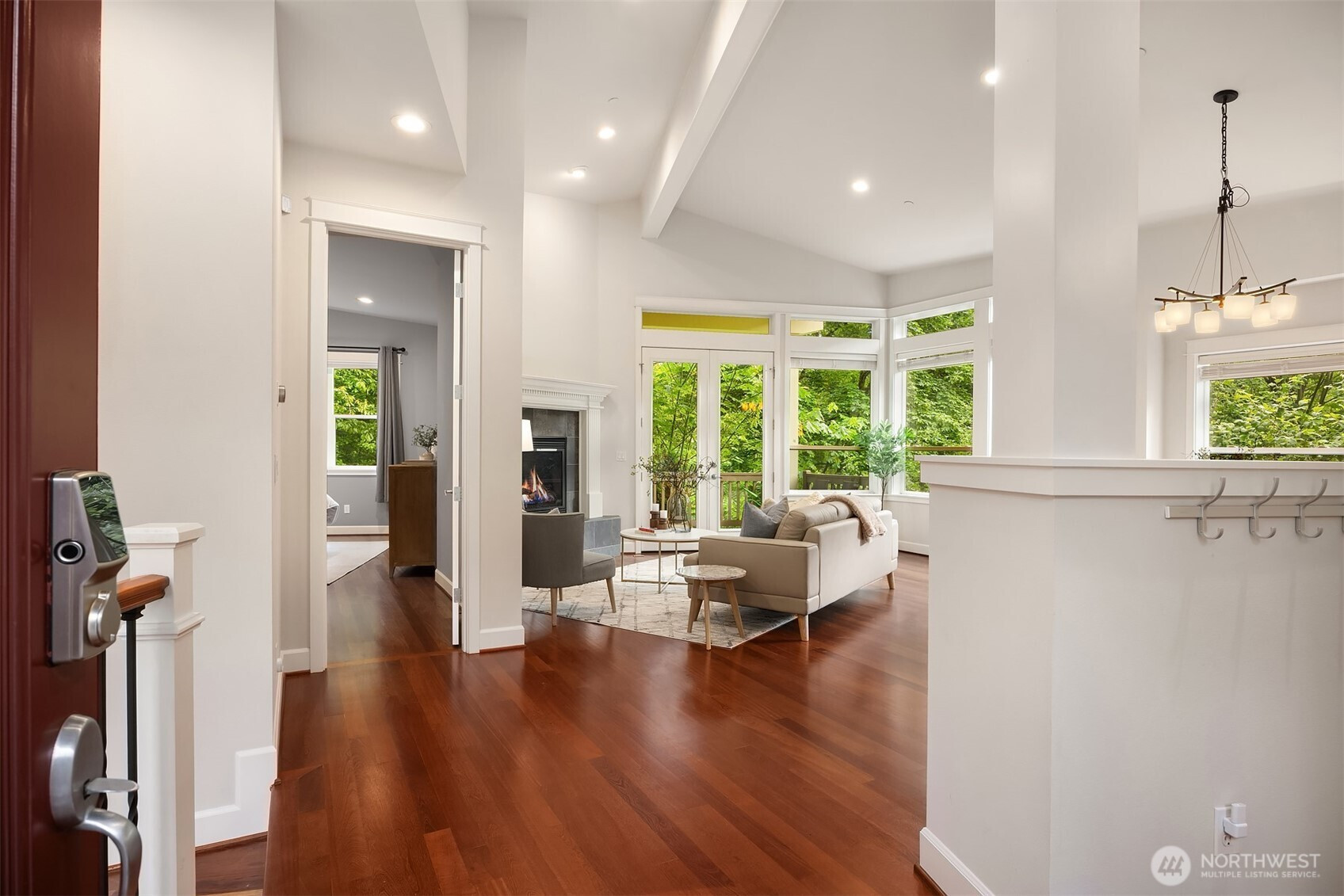 Private access to the Cross Kirkland Corridor Trail and a peaceful, treehouse-like setting make this home a rare find in the highly sought-after Kirkland Highlands. No HOA and central A/C for comfort and convenience. Vaulted ceilings, Brazilian cherry floors, gas fireplace, and wall of windows create an open, airy feel. French doors lead to a spacious deck, perfect for unwinding in nature. The kitchen features granite counters, cherry cabinets, and a gas cooktop. Main-level bedroom with vaulted ceiling, walk-in closet, and 5-piece bath. Downstairs includes a large family room, gas fireplace, patio access with a hot tub, and flexible work-from-home space. Conveniently located near local restaurants, shops, and everyday amenities.