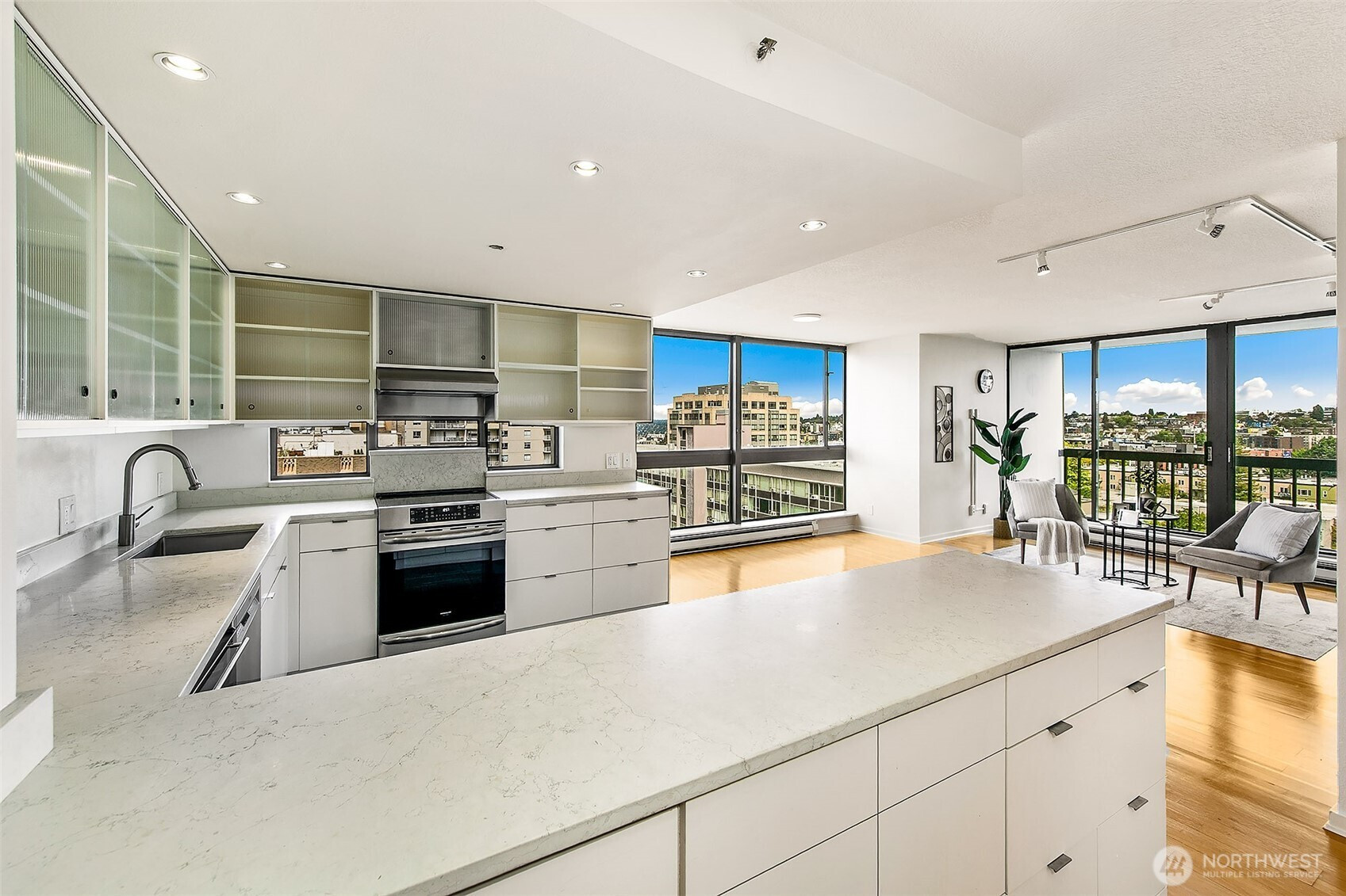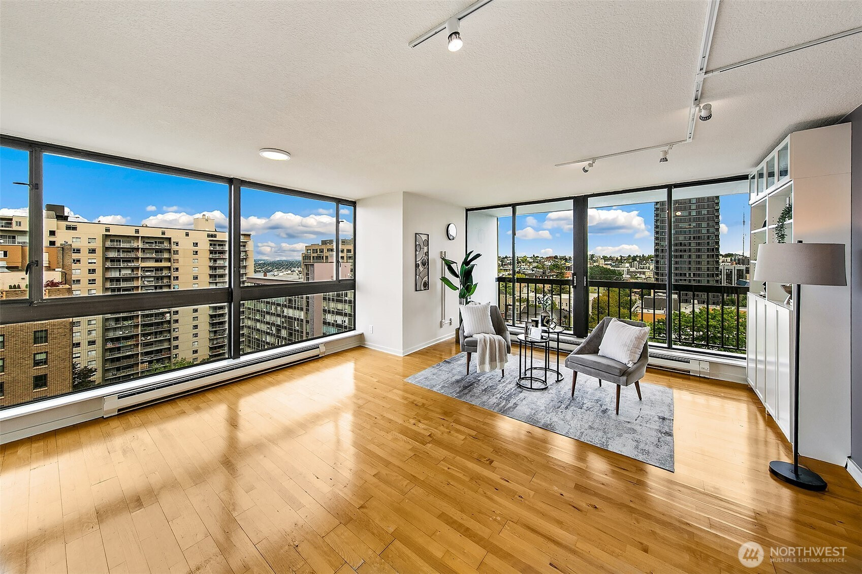 Commanding spectacular views from one of Seattle’s highest points atop First Hill, Parkview Plaza’s sophisticated double-corner pied-à-terre places you at the doorstep of the city amidst treelined streets, historic mansions and esteemed institutions. Floor-to-ceiling windows and private covered terraces flood open spaces with natural light. The entertainer’s kitchen is thoughtfully designed with quartz countertops, a Perlick wine cooler, Bosch dishwasher and under-cabinet lighting. Additional comforts include a large bonus pantry, Nuheat floors, Toto Washlet and custom storage throughout. Enjoy a skylit indoor pool, fitness studio, sauna and tranquil courtyard—all within a secure, well-managed community steps from the Frye and Town Hall.
