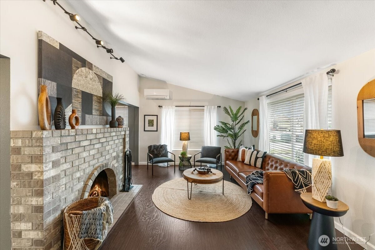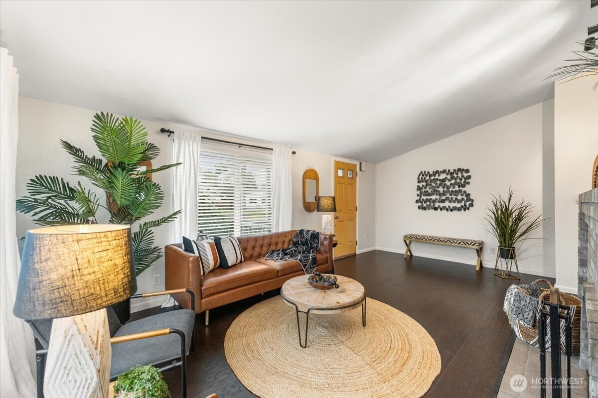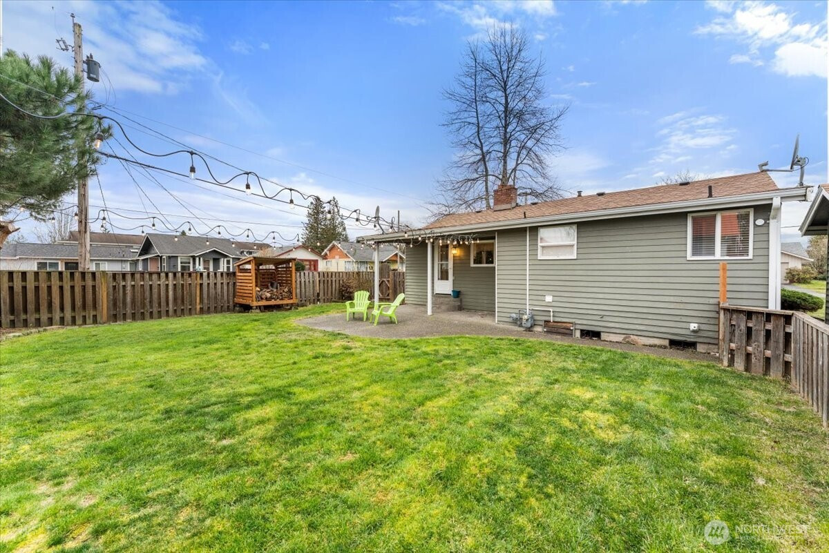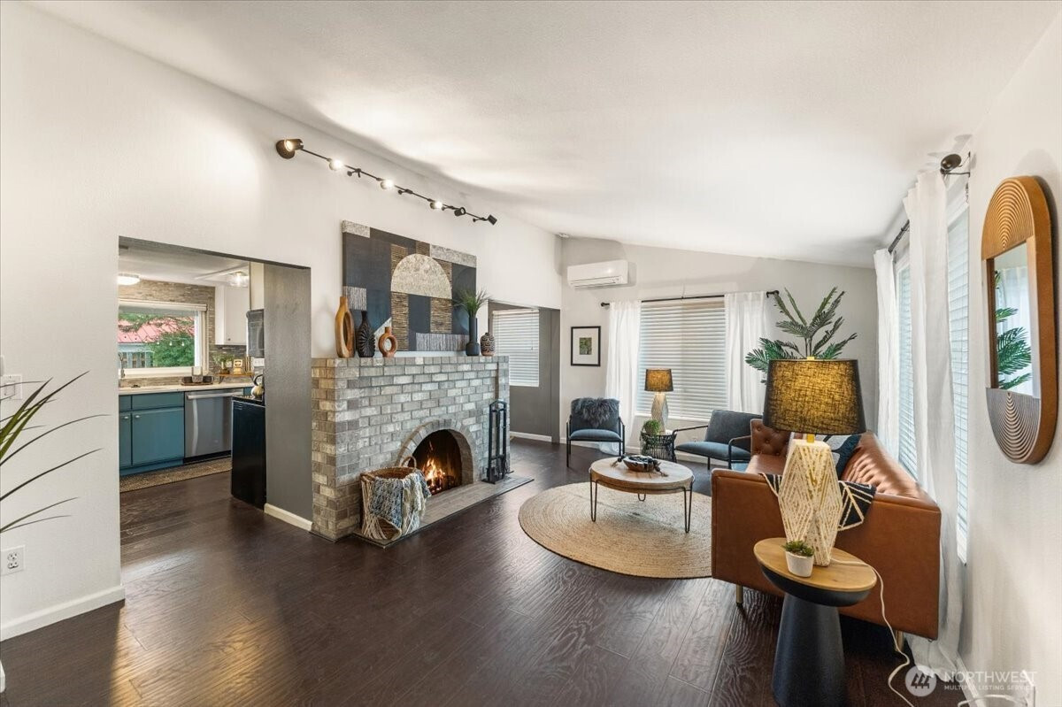 Welcome to this beautifully updated bungalow in the heart of downtown Enumclaw, offering 920 sq ft of thoughtfully designed living space with 2 bedrooms and 1 bath. This light-filled home features vaulted ceilings, durable LVP flooring, and a cozy wood-burning fireplace that creates a warm and inviting atmosphere. The updated kitchen shines with new quartz countertops, a stylish stacked stone backsplash, stainless steel appliances, and a generous pantry for added storage. Comfort is ensured year-round with new mini splits, and the large utility room includes a front-loading washer and dryer on a pedestal for added convenience. Step outside to enjoy the charming front porch and private back patio overlooking the level 7,000 sq ft fenced lot. The backyard is perfect for entertaining or relaxing, complete with festive string lights, raised garden beds, an attached storage closet, and a large shed for all your tools and hobbies. Convenient rear parking plus ample street parking adds to the functionality. The true highlight of this home is its unbeatable walkability to vibrant downtown Enumclaw, where local shops, dining, markets, and year-round community events create an energetic and welcoming small-town feel. This move-in ready home blends charm, modern updates, and an exceptional location all in one.