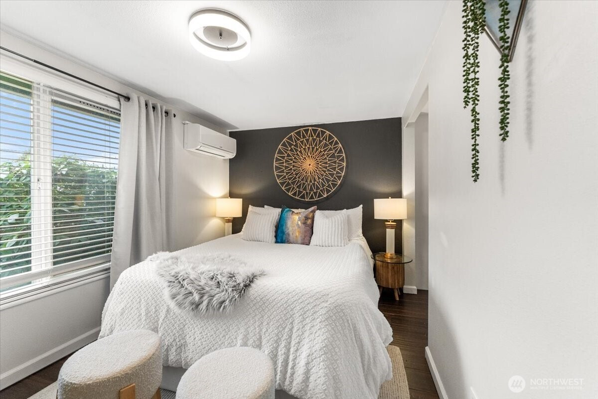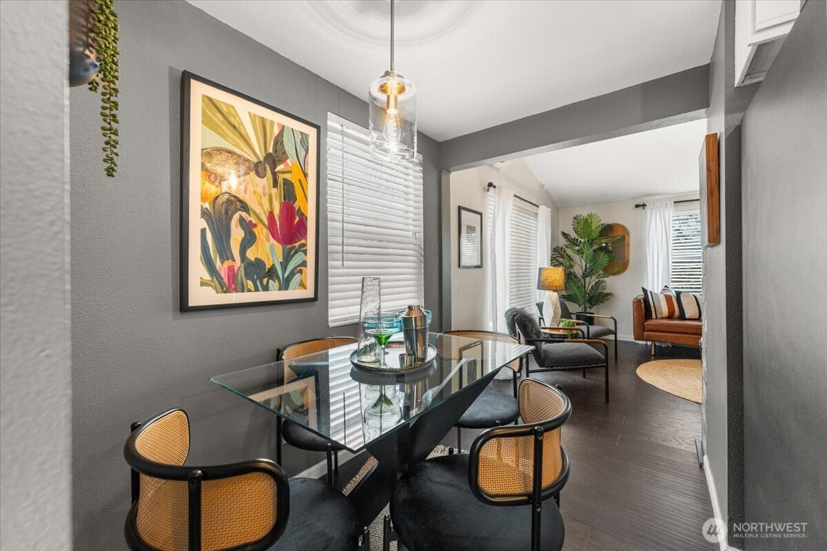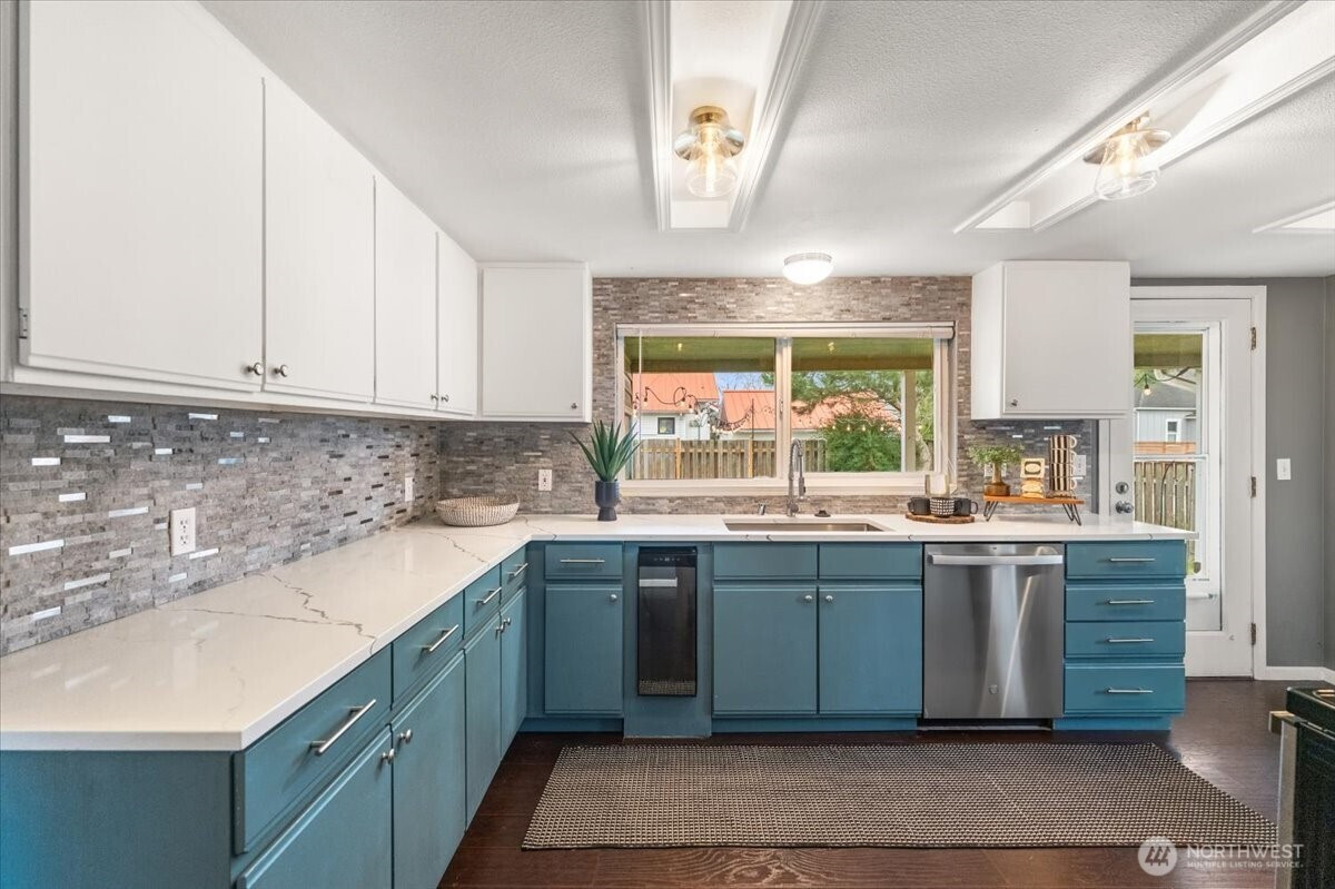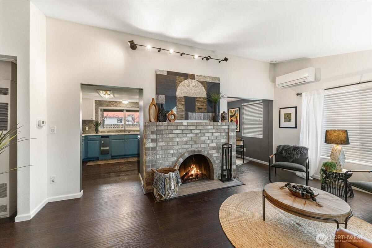 Welcome to this beautifully updated bungalow in the heart of downtown Enumclaw, offering 920 sq ft of thoughtfully designed living space with 2 bedrooms and 1 bath. This light-filled home features vaulted ceilings, durable LVP flooring, and a cozy wood-burning fireplace that creates a warm and inviting atmosphere. The updated kitchen shines with new quartz countertops, a stylish stacked stone backsplash, stainless steel appliances, and a generous pantry for added storage. Comfort is ensured year-round with new mini splits, and the large utility room includes a front-loading washer and dryer on a pedestal for added convenience. Step outside to enjoy the charming front porch and private back patio overlooking the level 7,000 sq ft fenced lot. The backyard is perfect for entertaining or relaxing, complete with festive string lights, raised garden beds, an attached storage closet, and a large shed for all your tools and hobbies. Convenient rear parking plus ample street parking adds to the functionality. The true highlight of this home is its unbeatable walkability to vibrant downtown Enumclaw, where local shops, dining, markets, and year-round community events create an energetic and welcoming small-town feel. This move-in ready home blends charm, modern updates, and an exceptional location all in one.