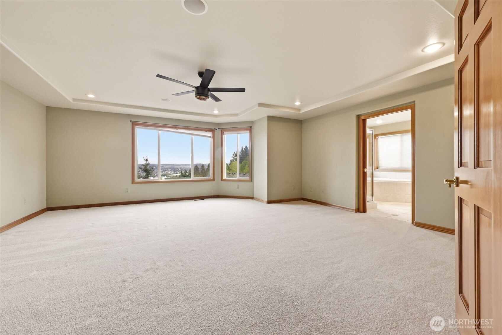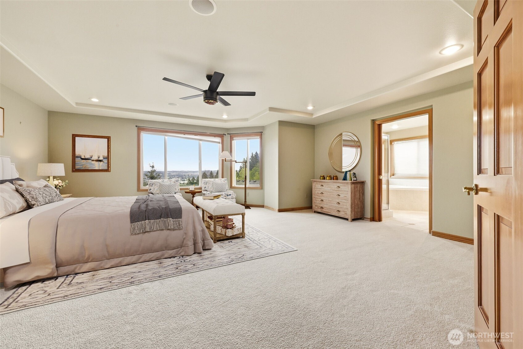 Experience luxury living with breathtaking panoramic views of Mt. Rainier and the Cascade Mountains from your expansive view deck—truly a “top of the world” setting. Nestled in the highly sought-after Jornada neighborhood, this stunning home showcases soaring ceilings and a light-filled open-concept family room and chef’s kitchen, framed by dramatic wall-to-wall windows. Designed for modern living, the home features a flexible main-level den with adjacent ¾ bath—ideal for multigenerational living or guest accommodations. Upstairs, retreat to a spacious primary suite alongside three additional bedrooms. The gourmet kitchen offers a generous island, abundant cabinetry, and a large walk-in pantry. Additional highlights include coffered ceilings, wainscotting, formal living and dining rooms, central A/C, a newer roof, and a 3-car tandem garage with lots of storage. Enjoy nearby parks and trails, plus convenient access to Hwy 167, Hwy 18, I-5, and the new light rail. A rare blend of privacy, space, and unforgettable views.