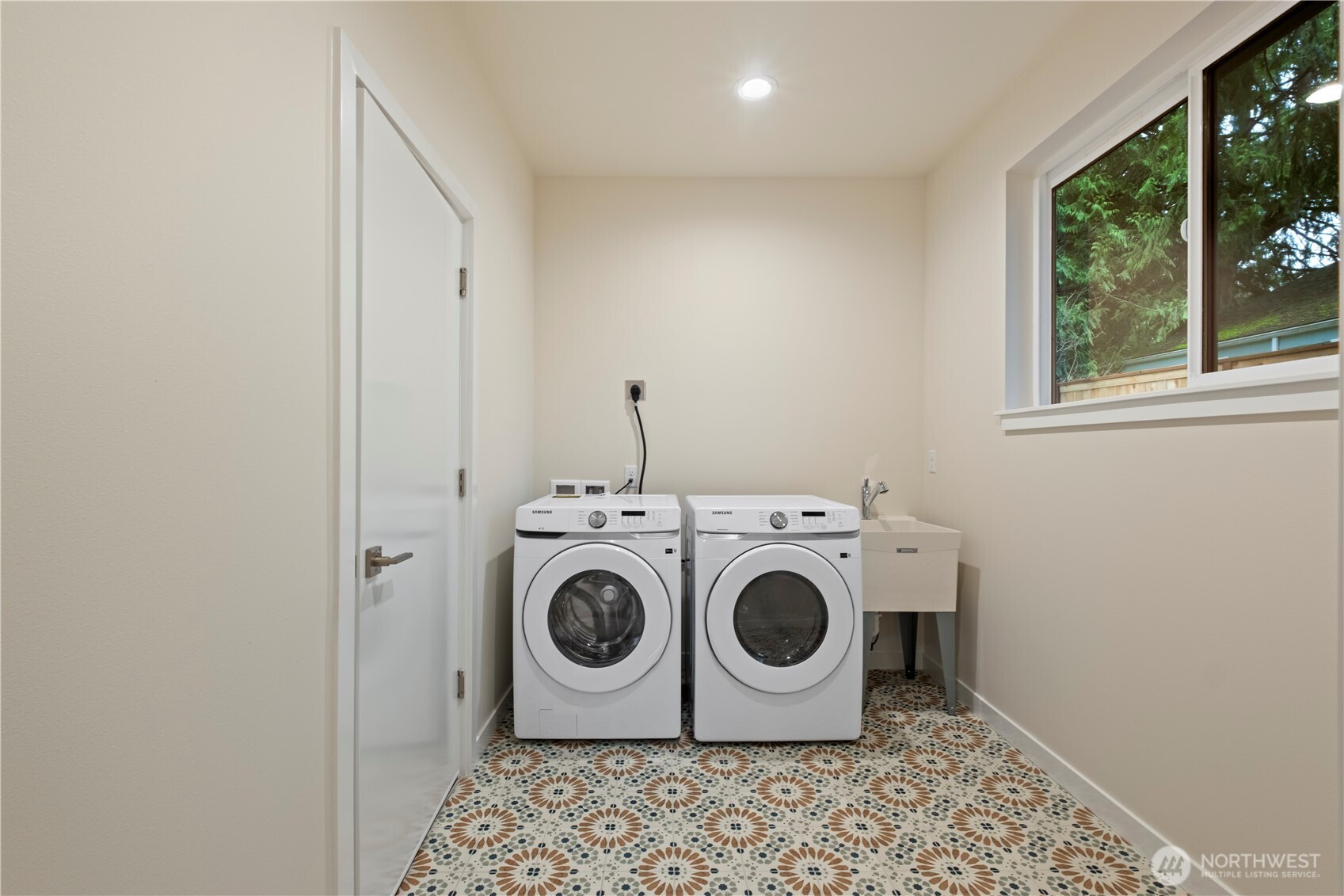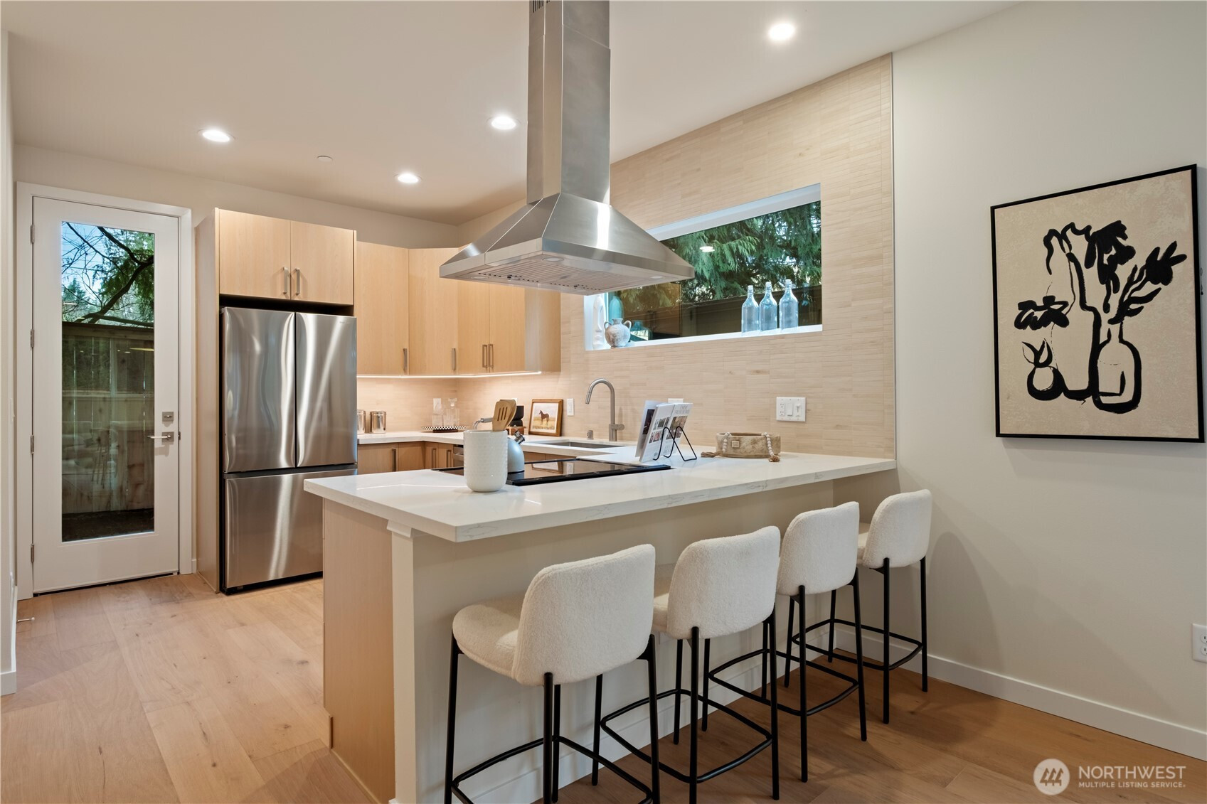 Outstanding detached home with three bedrooms and exceptional parking—an attached EV-equipped garage plus two additional off-street spaces for a total of three parking spots. This brand-new construction is move-in ready and designed for modern living. Enter on the main level to a spacious living room with ample space for a full dining table, perfect for hosting friends. The full-size kitchen features brand-new appliances, a pantry closet, and breakfast bar seating. Step outside to a private side-yard patio off the kitchen—ideal for summer BBQs and outdoor entertaining. Upstairs, the primary suite offers a walk-in closet, while the second bedroom includes its own ensuite bath. A third bedroom and an additional guest bath complete the upper level. Enjoy easy access to the Northgate Light Rail Station (6min) or a quick commute to downtown via I-5 (20min).